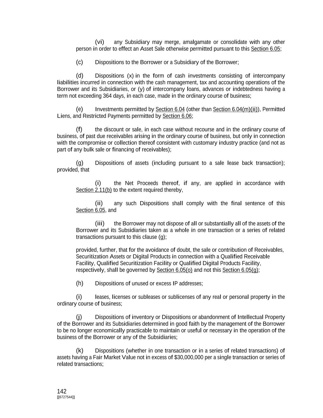 142 [[6727544]] (vi) any Subsidiary may merge, amalgamate or consolidate with any other person in order to effect an Asset Sale otherwise permitted pursuant to this Section 6.05; (c) Dispositions to the Borrower or a Subsidiary of the Borrower; (d) Dispositions (x) in the form of cash investments consisting of intercompany liabilities incurred in connection with the cash management, tax and accounting operations of the Borrower and its Subsidiaries, or (y) of intercompany loans, advances or indebtedness having a term not exceeding 364 days, in each case, made in the ordinary course of business; (e) Investments permitted by Section 6.04 (other than Section 6.04(m)(ii)), Permitted Liens, and Restricted Payments permitted by Section 6.06; (f) the discount or sale, in each case without recourse and in the ordinary course of business, of past due receivables arising in the ordinary course of business, but only in connection with the compromise or collection thereof consistent with customary industry practice (and not as part of any bulk sale or financing of receivables); (g) Dispositions of assets (including pursuant to a sale lease back transaction); provided, that (i) the Net Proceeds thereof, if any, are applied in accordance with Section 2.11(b) to the extent required thereby, (ii) any such Dispositions shall comply with the final sentence of this Section 6.05, and (iii) the Borrower may not dispose of all or substantially all of the assets of the Borrower and its Subsidiaries taken as a whole in one transaction or a series of related transactions pursuant to this clause (g); provided, further, that for the avoidance of doubt, the sale or contribution of Receivables, Securitization Assets or Digital Products in connection with a Qualified Receivable Facility, Qualified Securitization Facility or Qualified Digital Products Facility, respectively, shall be governed by Section 6.05(o) and not this Section 6.05(g); (h) Dispositions of unused or excess IP addresses; (i) leases, licenses or subleases or sublicenses of any real or personal property in the ordinary course of business; (j) Dispositions of inventory or Dispositions or abandonment of Intellectual Property of the Borrower and its Subsidiaries determined in good faith by the management of the Borrower to be no longer economically practicable to maintain or useful or necessary in the operation of the business of the Borrower or any of the Subsidiaries; (k) Dispositions (whether in one transaction or in a series of related transactions) of assets having a Fair Market Value not in excess of $30,000,000 per a single transaction or series of related transactions;