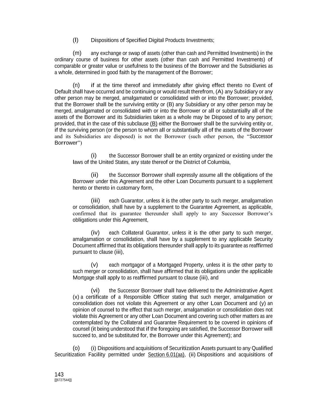 143 [[6727544]] (l) Dispositions of Specified Digital Products Investments; (m) any exchange or swap of assets (other than cash and Permitted Investments) in the ordinary course of business for other assets (other than cash and Permitted Investments) of comparable or greater value or usefulness to the business of the Borrower and the Subsidiaries as a whole, determined in good faith by the management of the Borrower; (n) if at the time thereof and immediately after giving effect thereto no Event of Default shall have occurred and be continuing or would result therefrom, (A) any Subsidiary or any other person may be merged, amalgamated or consolidated with or into the Borrower; provided, that the Borrower shall be the surviving entity or (B) any Subsidiary or any other person may be merged, amalgamated or consolidated with or into the Borrower or all or substantially all of the assets of the Borrower and its Subsidiaries taken as a whole may be Disposed of to any person; provided, that in the case of this subclause (B) either the Borrower shall be the surviving entity or, if the surviving person (or the person to whom all or substantially all of the assets of the Borrower and its Subsidiaries are disposed) is not the Borrower (such other person, the “Successor Borrower”) (i) the Successor Borrower shall be an entity organized or existing under the laws of the United States, any state thereof or the District of Columbia, (ii) the Successor Borrower shall expressly assume all the obligations of the Borrower under this Agreement and the other Loan Documents pursuant to a supplement hereto or thereto in customary form, (iii) each Guarantor, unless it is the other party to such merger, amalgamation or consolidation, shall have by a supplement to the Guarantee Agreement, as applicable, confirmed that its guarantee thereunder shall apply to any Successor Borrower’s obligations under this Agreement, (iv) each Collateral Guarantor, unless it is the other party to such merger, amalgamation or consolidation, shall have by a supplement to any applicable Security Document affirmed that its obligations thereunder shall apply to its guarantee as reaffirmed pursuant to clause (iii), (v) each mortgagor of a Mortgaged Property, unless it is the other party to such merger or consolidation, shall have affirmed that its obligations under the applicable Mortgage shall apply to as reaffirmed pursuant to clause (iii), and (vi) the Successor Borrower shall have delivered to the Administrative Agent (x) a certificate of a Responsible Officer stating that such merger, amalgamation or consolidation does not violate this Agreement or any other Loan Document and (y) an opinion of counsel to the effect that such merger, amalgamation or consolidation does not violate this Agreement or any other Loan Document and covering such other matters as are contemplated by the Collateral and Guarantee Requirement to be covered in opinions of counsel (it being understood that if the foregoing are satisfied, the Successor Borrower will succeed to, and be substituted for, the Borrower under this Agreement); and (o) (i) Dispositions and acquisitions of Securitization Assets pursuant to any Qualified Securitization Facility permitted under Section 6.01(aa), (ii) Dispositions and acquisitions of