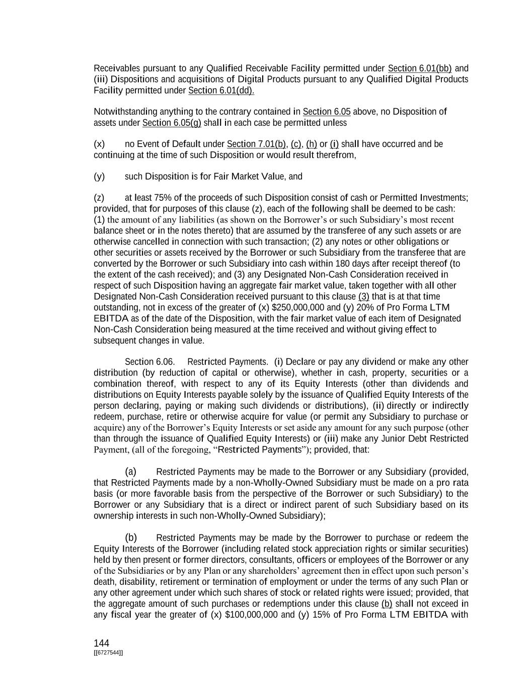 144 [[6727544]] Receivables pursuant to any Qualified Receivable Facility permitted under Section 6.01(bb) and (iii) Dispositions and acquisitions of Digital Products pursuant to any Qualified Digital Products Facility permitted under Section 6.01(dd). Notwithstanding anything to the contrary contained in Section 6.05 above, no Disposition of assets under Section 6.05(g) shall in each case be permitted unless (x) no Event of Default under Section 7.01(b), (c), (h) or (i) shall have occurred and be continuing at the time of such Disposition or would result therefrom, (y) such Disposition is for Fair Market Value, and (z) at least 75% of the proceeds of such Disposition consist of cash or Permitted Investments; provided, that for purposes of this clause (z), each of the following shall be deemed to be cash: (1) the amount of any liabilities (as shown on the Borrower’s or such Subsidiary’s most recent balance sheet or in the notes thereto) that are assumed by the transferee of any such assets or are otherwise cancelled in connection with such transaction; (2) any notes or other obligations or other securities or assets received by the Borrower or such Subsidiary from the transferee that are converted by the Borrower or such Subsidiary into cash within 180 days after receipt thereof (to the extent of the cash received); and (3) any Designated Non-Cash Consideration received in respect of such Disposition having an aggregate fair market value, taken together with all other Designated Non-Cash Consideration received pursuant to this clause (3) that is at that time outstanding, not in excess of the greater of (x) $250,000,000 and (y) 20% of Pro Forma LTM EBITDA as of the date of the Disposition, with the fair market value of each item of Designated Non-Cash Consideration being measured at the time received and without giving effect to subsequent changes in value. Section 6.06. Restricted Payments. (i) Declare or pay any dividend or make any other distribution (by reduction of capital or otherwise), whether in cash, property, securities or a combination thereof, with respect to any of its Equity Interests (other than dividends and distributions on Equity Interests payable solely by the issuance of Qualified Equity Interests of the person declaring, paying or making such dividends or distributions), (ii) directly or indirectly redeem, purchase, retire or otherwise acquire for value (or permit any Subsidiary to purchase or acquire) any of the Borrower’s Equity Interests or set aside any amount for any such purpose (other than through the issuance of Qualified Equity Interests) or (iii) make any Junior Debt Restricted Payment, (all of the foregoing, “Restricted Payments”); provided, that: (a) Restricted Payments may be made to the Borrower or any Subsidiary (provided, that Restricted Payments made by a non-Wholly-Owned Subsidiary must be made on a pro rata basis (or more favorable basis from the perspective of the Borrower or such Subsidiary) to the Borrower or any Subsidiary that is a direct or indirect parent of such Subsidiary based on its ownership interests in such non-Wholly-Owned Subsidiary); (b) Restricted Payments may be made by the Borrower to purchase or redeem the Equity Interests of the Borrower (including related stock appreciation rights or similar securities) held by then present or former directors, consultants, officers or employees of the Borrower or any of the Subsidiaries or by any Plan or any shareholders’ agreement then in effect upon such person’s death, disability, retirement or termination of employment or under the terms of any such Plan or any other agreement under which such shares of stock or related rights were issued; provided, that the aggregate amount of such purchases or redemptions under this clause (b) shall not exceed in any fiscal year the greater of (x) $100,000,000 and (y) 15% of Pro Forma LTM EBITDA with