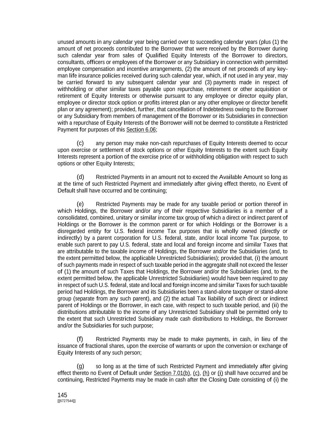 145 [[6727544]] unused amounts in any calendar year being carried over to succeeding calendar years (plus (1) the amount of net proceeds contributed to the Borrower that were received by the Borrower during such calendar year from sales of Qualified Equity Interests of the Borrower to directors, consultants, officers or employees of the Borrower or any Subsidiary in connection with permitted employee compensation and incentive arrangements, (2) the amount of net proceeds of any key- man life insurance policies received during such calendar year, which, if not used in any year, may be carried forward to any subsequent calendar year and (3) payments made in respect of withholding or other similar taxes payable upon repurchase, retirement or other acquisition or retirement of Equity Interests or otherwise pursuant to any employee or director equity plan, employee or director stock option or profits interest plan or any other employee or director benefit plan or any agreement); provided, further, that cancellation of Indebtedness owing to the Borrower or any Subsidiary from members of management of the Borrower or its Subsidiaries in connection with a repurchase of Equity Interests of the Borrower will not be deemed to constitute a Restricted Payment for purposes of this Section 6.06; (c) any person may make non-cash repurchases of Equity Interests deemed to occur upon exercise or settlement of stock options or other Equity Interests to the extent such Equity Interests represent a portion of the exercise price of or withholding obligation with respect to such options or other Equity Interests; (d) Restricted Payments in an amount not to exceed the Available Amount so long as at the time of such Restricted Payment and immediately after giving effect thereto, no Event of Default shall have occurred and be continuing; (e) Restricted Payments may be made for any taxable period or portion thereof in which Holdings, the Borrower and/or any of their respective Subsidiaries is a member of a consolidated, combined, unitary or similar income tax group of which a direct or indirect parent of Holdings or the Borrower is the common parent or for which Holdings or the Borrower is a disregarded entity for U.S. federal income Tax purposes that is wholly owned (directly or indirectly) by a parent corporation for U.S. federal, state, and/or local income Tax purpose, to enable such parent to pay U.S. federal, state and local and foreign income and similar Taxes that are attributable to the taxable income of Holdings, the Borrower and/or the Subsidiaries (and, to the extent permitted below, the applicable Unrestricted Subsidiaries); provided that, (i) the amount of such payments made in respect of such taxable period in the aggregate shall not exceed the lesser of (1) the amount of such Taxes that Holdings, the Borrower and/or the Subsidiaries (and, to the extent permitted below, the applicable Unrestricted Subsidiaries) would have been required to pay in respect of such U.S. federal, state and local and foreign income and similar Taxes for such taxable period had Holdings, the Borrower and its Subsidiaries been a stand-alone taxpayer or stand-alone group (separate from any such parent), and (2) the actual Tax liability of such direct or indirect parent of Holdings or the Borrower, in each case, with respect to such taxable period, and (ii) the distributions attributable to the income of any Unrestricted Subsidiary shall be permitted only to the extent that such Unrestricted Subsidiary made cash distributions to Holdings, the Borrower and/or the Subsidiaries for such purpose; (f) Restricted Payments may be made to make payments, in cash, in lieu of the issuance of fractional shares, upon the exercise of warrants or upon the conversion or exchange of Equity Interests of any such person; (g) so long as at the time of such Restricted Payment and immediately after giving effect thereto no Event of Default under Section 7.01(b), (c), (h) or (i) shall have occurred and be continuing, Restricted Payments may be made in cash after the Closing Date consisting of (i) the