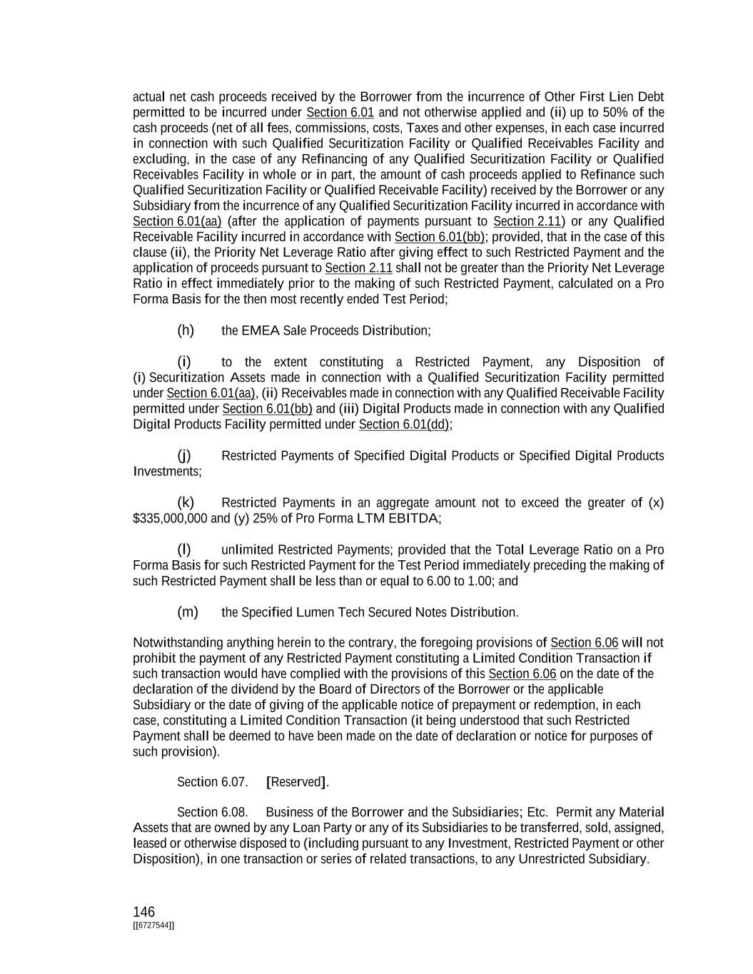 146 [[6727544]] actual net cash proceeds received by the Borrower from the incurrence of Other First Lien Debt permitted to be incurred under Section 6.01 and not otherwise applied and (ii) up to 50% of the cash proceeds (net of all fees, commissions, costs, Taxes and other expenses, in each case incurred in connection with such Qualified Securitization Facility or Qualified Receivables Facility and excluding, in the case of any Refinancing of any Qualified Securitization Facility or Qualified Receivables Facility in whole or in part, the amount of cash proceeds applied to Refinance such Qualified Securitization Facility or Qualified Receivable Facility) received by the Borrower or any Subsidiary from the incurrence of any Qualified Securitization Facility incurred in accordance with Section 6.01(aa) (after the application of payments pursuant to Section 2.11) or any Qualified Receivable Facility incurred in accordance with Section 6.01(bb); provided, that in the case of this clause (ii), the Priority Net Leverage Ratio after giving effect to such Restricted Payment and the application of proceeds pursuant to Section 2.11 shall not be greater than the Priority Net Leverage Ratio in effect immediately prior to the making of such Restricted Payment, calculated on a Pro Forma Basis for the then most recently ended Test Period; (h) the EMEA Sale Proceeds Distribution; (i) to the extent constituting a Restricted Payment, any Disposition of (i) Securitization Assets made in connection with a Qualified Securitization Facility permitted under Section 6.01(aa), (ii) Receivables made in connection with any Qualified Receivable Facility permitted under Section 6.01(bb) and (iii) Digital Products made in connection with any Qualified Digital Products Facility permitted under Section 6.01(dd); (j) Restricted Payments of Specified Digital Products or Specified Digital Products Investments; (k) Restricted Payments in an aggregate amount not to exceed the greater of (x) $335,000,000 and (y) 25% of Pro Forma LTM EBITDA; (l) unlimited Restricted Payments; provided that the Total Leverage Ratio on a Pro Forma Basis for such Restricted Payment for the Test Period immediately preceding the making of such Restricted Payment shall be less than or equal to 6.00 to 1.00; and (m) the Specified Lumen Tech Secured Notes Distribution. Notwithstanding anything herein to the contrary, the foregoing provisions of Section 6.06 will not prohibit the payment of any Restricted Payment constituting a Limited Condition Transaction if such transaction would have complied with the provisions of this Section 6.06 on the date of the declaration of the dividend by the Board of Directors of the Borrower or the applicable Subsidiary or the date of giving of the applicable notice of prepayment or redemption, in each case, constituting a Limited Condition Transaction (it being understood that such Restricted Payment shall be deemed to have been made on the date of declaration or notice for purposes of such provision). Section 6.07. [Reserved]. Section 6.08. Business of the Borrower and the Subsidiaries; Etc. Permit any Material Assets that are owned by any Loan Party or any of its Subsidiaries to be transferred, sold, assigned, leased or otherwise disposed to (including pursuant to any Investment, Restricted Payment or other Disposition), in one transaction or series of related transactions, to any Unrestricted Subsidiary.