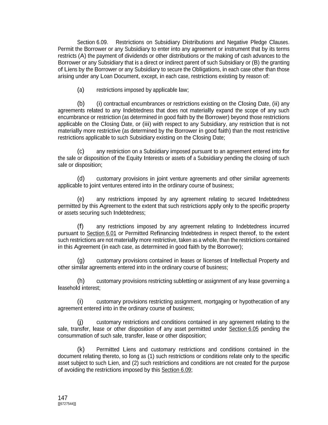 147 [[6727544]] Section 6.09. Restrictions on Subsidiary Distributions and Negative Pledge Clauses. Permit the Borrower or any Subsidiary to enter into any agreement or instrument that by its terms restricts (A) the payment of dividends or other distributions or the making of cash advances to the Borrower or any Subsidiary that is a direct or indirect parent of such Subsidiary or (B) the granting of Liens by the Borrower or any Subsidiary to secure the Obligations, in each case other than those arising under any Loan Document, except, in each case, restrictions existing by reason of: (a) restrictions imposed by applicable law; (b) (i) contractual encumbrances or restrictions existing on the Closing Date, (ii) any agreements related to any Indebtedness that does not materially expand the scope of any such encumbrance or restriction (as determined in good faith by the Borrower) beyond those restrictions applicable on the Closing Date, or (iii) with respect to any Subsidiary, any restriction that is not materially more restrictive (as determined by the Borrower in good faith) than the most restrictive restrictions applicable to such Subsidiary existing on the Closing Date; (c) any restriction on a Subsidiary imposed pursuant to an agreement entered into for the sale or disposition of the Equity Interests or assets of a Subsidiary pending the closing of such sale or disposition; (d) customary provisions in joint venture agreements and other similar agreements applicable to joint ventures entered into in the ordinary course of business; (e) any restrictions imposed by any agreement relating to secured Indebtedness permitted by this Agreement to the extent that such restrictions apply only to the specific property or assets securing such Indebtedness; (f) any restrictions imposed by any agreement relating to Indebtedness incurred pursuant to Section 6.01 or Permitted Refinancing Indebtedness in respect thereof, to the extent such restrictions are not materially more restrictive, taken as a whole, than the restrictions contained in this Agreement (in each case, as determined in good faith by the Borrower); (g) customary provisions contained in leases or licenses of Intellectual Property and other similar agreements entered into in the ordinary course of business; (h) customary provisions restricting subletting or assignment of any lease governing a leasehold interest; (i) customary provisions restricting assignment, mortgaging or hypothecation of any agreement entered into in the ordinary course of business; (j) customary restrictions and conditions contained in any agreement relating to the sale, transfer, lease or other disposition of any asset permitted under Section 6.05 pending the consummation of such sale, transfer, lease or other disposition; (k) Permitted Liens and customary restrictions and conditions contained in the document relating thereto, so long as (1) such restrictions or conditions relate only to the specific asset subject to such Lien, and (2) such restrictions and conditions are not created for the purpose of avoiding the restrictions imposed by this Section 6.09;