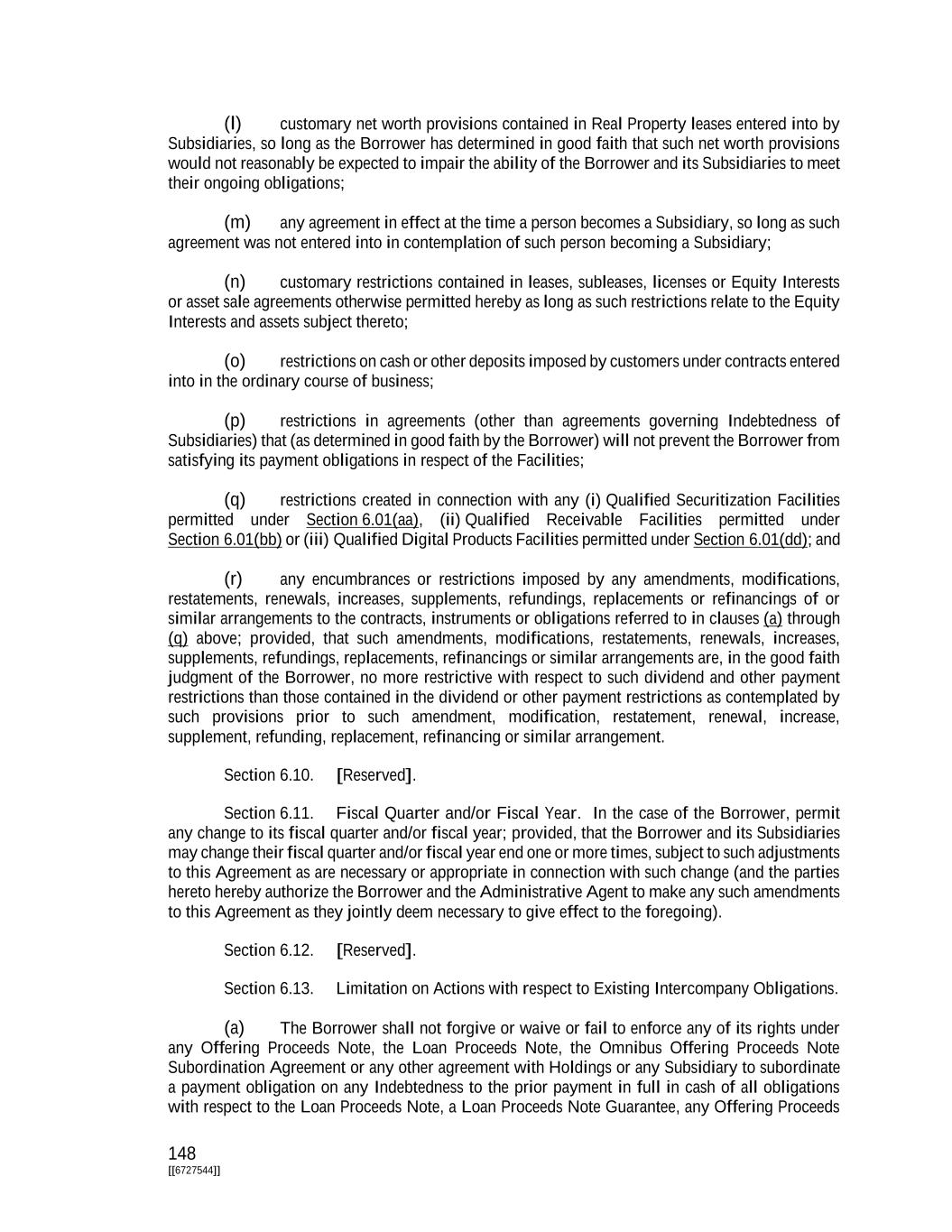 148 [[6727544]] (l) customary net worth provisions contained in Real Property leases entered into by Subsidiaries, so long as the Borrower has determined in good faith that such net worth provisions would not reasonably be expected to impair the ability of the Borrower and its Subsidiaries to meet their ongoing obligations; (m) any agreement in effect at the time a person becomes a Subsidiary, so long as such agreement was not entered into in contemplation of such person becoming a Subsidiary; (n) customary restrictions contained in leases, subleases, licenses or Equity Interests or asset sale agreements otherwise permitted hereby as long as such restrictions relate to the Equity Interests and assets subject thereto; (o) restrictions on cash or other deposits imposed by customers under contracts entered into in the ordinary course of business; (p) restrictions in agreements (other than agreements governing Indebtedness of Subsidiaries) that (as determined in good faith by the Borrower) will not prevent the Borrower from satisfying its payment obligations in respect of the Facilities; (q) restrictions created in connection with any (i) Qualified Securitization Facilities permitted under Section 6.01(aa), (ii) Qualified Receivable Facilities permitted under Section 6.01(bb) or (iii) Qualified Digital Products Facilities permitted under Section 6.01(dd); and (r) any encumbrances or restrictions imposed by any amendments, modifications, restatements, renewals, increases, supplements, refundings, replacements or refinancings of or similar arrangements to the contracts, instruments or obligations referred to in clauses (a) through (q) above; provided, that such amendments, modifications, restatements, renewals, increases, supplements, refundings, replacements, refinancings or similar arrangements are, in the good faith judgment of the Borrower, no more restrictive with respect to such dividend and other payment restrictions than those contained in the dividend or other payment restrictions as contemplated by such provisions prior to such amendment, modification, restatement, renewal, increase, supplement, refunding, replacement, refinancing or similar arrangement. Section 6.10. [Reserved]. Section 6.11. Fiscal Quarter and/or Fiscal Year. In the case of the Borrower, permit any change to its fiscal quarter and/or fiscal year; provided, that the Borrower and its Subsidiaries may change their fiscal quarter and/or fiscal year end one or more times, subject to such adjustments to this Agreement as are necessary or appropriate in connection with such change (and the parties hereto hereby authorize the Borrower and the Administrative Agent to make any such amendments to this Agreement as they jointly deem necessary to give effect to the foregoing). Section 6.12. [Reserved]. Section 6.13. Limitation on Actions with respect to Existing Intercompany Obligations. (a) The Borrower shall not forgive or waive or fail to enforce any of its rights under any Offering Proceeds Note, the Loan Proceeds Note, the Omnibus Offering Proceeds Note Subordination Agreement or any other agreement with Holdings or any Subsidiary to subordinate a payment obligation on any Indebtedness to the prior payment in full in cash of all obligations with respect to the Loan Proceeds Note, a Loan Proceeds Note Guarantee, any Offering Proceeds