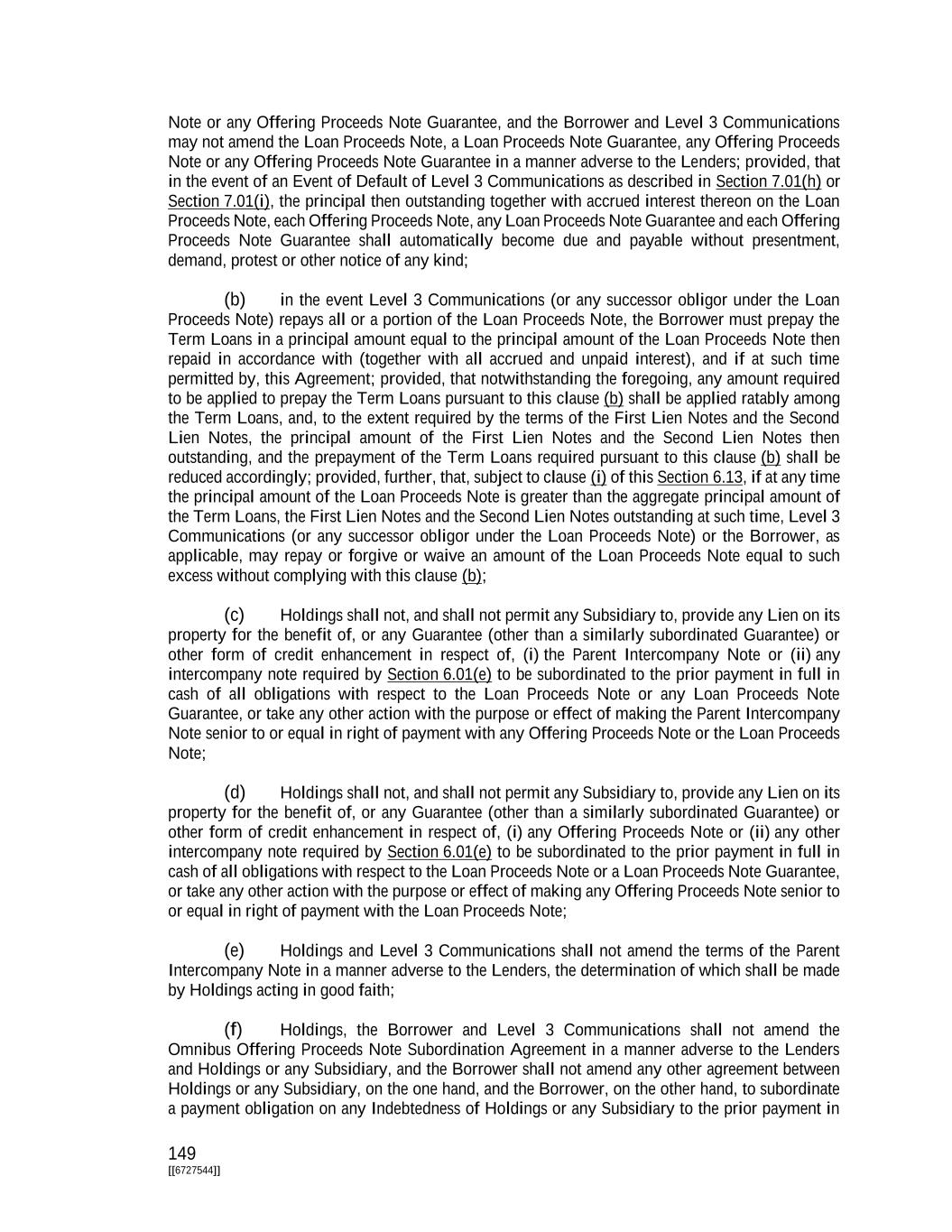 149 [[6727544]] Note or any Offering Proceeds Note Guarantee, and the Borrower and Level 3 Communications may not amend the Loan Proceeds Note, a Loan Proceeds Note Guarantee, any Offering Proceeds Note or any Offering Proceeds Note Guarantee in a manner adverse to the Lenders; provided, that in the event of an Event of Default of Level 3 Communications as described in Section 7.01(h) or Section 7.01(i), the principal then outstanding together with accrued interest thereon on the Loan Proceeds Note, each Offering Proceeds Note, any Loan Proceeds Note Guarantee and each Offering Proceeds Note Guarantee shall automatically become due and payable without presentment, demand, protest or other notice of any kind; (b) in the event Level 3 Communications (or any successor obligor under the Loan Proceeds Note) repays all or a portion of the Loan Proceeds Note, the Borrower must prepay the Term Loans in a principal amount equal to the principal amount of the Loan Proceeds Note then repaid in accordance with (together with all accrued and unpaid interest), and if at such time permitted by, this Agreement; provided, that notwithstanding the foregoing, any amount required to be applied to prepay the Term Loans pursuant to this clause (b) shall be applied ratably among the Term Loans, and, to the extent required by the terms of the First Lien Notes and the Second Lien Notes, the principal amount of the First Lien Notes and the Second Lien Notes then outstanding, and the prepayment of the Term Loans required pursuant to this clause (b) shall be reduced accordingly; provided, further, that, subject to clause (i) of this Section 6.13, if at any time the principal amount of the Loan Proceeds Note is greater than the aggregate principal amount of the Term Loans, the First Lien Notes and the Second Lien Notes outstanding at such time, Level 3 Communications (or any successor obligor under the Loan Proceeds Note) or the Borrower, as applicable, may repay or forgive or waive an amount of the Loan Proceeds Note equal to such excess without complying with this clause (b); (c) Holdings shall not, and shall not permit any Subsidiary to, provide any Lien on its property for the benefit of, or any Guarantee (other than a similarly subordinated Guarantee) or other form of credit enhancement in respect of, (i) the Parent Intercompany Note or (ii) any intercompany note required by Section 6.01(e) to be subordinated to the prior payment in full in cash of all obligations with respect to the Loan Proceeds Note or any Loan Proceeds Note Guarantee, or take any other action with the purpose or effect of making the Parent Intercompany Note senior to or equal in right of payment with any Offering Proceeds Note or the Loan Proceeds Note; (d) Holdings shall not, and shall not permit any Subsidiary to, provide any Lien on its property for the benefit of, or any Guarantee (other than a similarly subordinated Guarantee) or other form of credit enhancement in respect of, (i) any Offering Proceeds Note or (ii) any other intercompany note required by Section 6.01(e) to be subordinated to the prior payment in full in cash of all obligations with respect to the Loan Proceeds Note or a Loan Proceeds Note Guarantee, or take any other action with the purpose or effect of making any Offering Proceeds Note senior to or equal in right of payment with the Loan Proceeds Note; (e) Holdings and Level 3 Communications shall not amend the terms of the Parent Intercompany Note in a manner adverse to the Lenders, the determination of which shall be made by Holdings acting in good faith; (f) Holdings, the Borrower and Level 3 Communications shall not amend the Omnibus Offering Proceeds Note Subordination Agreement in a manner adverse to the Lenders and Holdings or any Subsidiary, and the Borrower shall not amend any other agreement between Holdings or any Subsidiary, on the one hand, and the Borrower, on the other hand, to subordinate a payment obligation on any Indebtedness of Holdings or any Subsidiary to the prior payment in