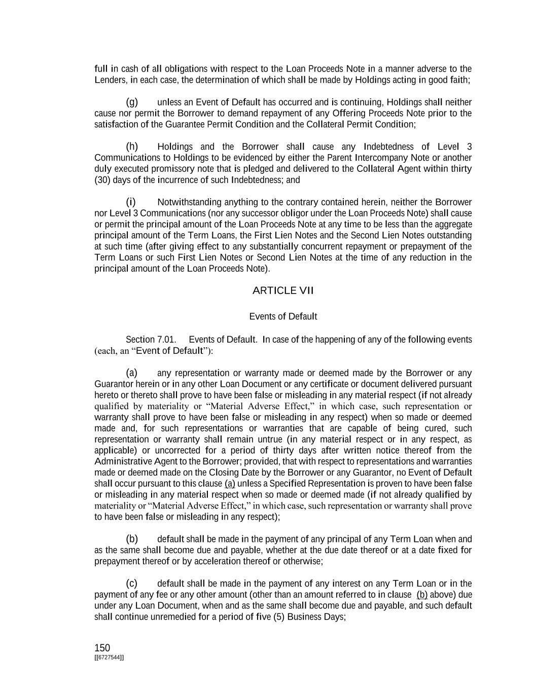 150 [[6727544]] full in cash of all obligations with respect to the Loan Proceeds Note in a manner adverse to the Lenders, in each case, the determination of which shall be made by Holdings acting in good faith; (g) unless an Event of Default has occurred and is continuing, Holdings shall neither cause nor permit the Borrower to demand repayment of any Offering Proceeds Note prior to the satisfaction of the Guarantee Permit Condition and the Collateral Permit Condition; (h) Holdings and the Borrower shall cause any Indebtedness of Level 3 Communications to Holdings to be evidenced by either the Parent Intercompany Note or another duly executed promissory note that is pledged and delivered to the Collateral Agent within thirty (30) days of the incurrence of such Indebtedness; and (i) Notwithstanding anything to the contrary contained herein, neither the Borrower nor Level 3 Communications (nor any successor obligor under the Loan Proceeds Note) shall cause or permit the principal amount of the Loan Proceeds Note at any time to be less than the aggregate principal amount of the Term Loans, the First Lien Notes and the Second Lien Notes outstanding at such time (after giving effect to any substantially concurrent repayment or prepayment of the Term Loans or such First Lien Notes or Second Lien Notes at the time of any reduction in the principal amount of the Loan Proceeds Note). ARTICLE VII Events of Default Section 7.01. Events of Default. In case of the happening of any of the following events (each, an “Event of Default”): (a) any representation or warranty made or deemed made by the Borrower or any Guarantor herein or in any other Loan Document or any certificate or document delivered pursuant hereto or thereto shall prove to have been false or misleading in any material respect (if not already qualified by materiality or “Material Adverse Effect,” in which case, such representation or warranty shall prove to have been false or misleading in any respect) when so made or deemed made and, for such representations or warranties that are capable of being cured, such representation or warranty shall remain untrue (in any material respect or in any respect, as applicable) or uncorrected for a period of thirty days after written notice thereof from the Administrative Agent to the Borrower; provided, that with respect to representations and warranties made or deemed made on the Closing Date by the Borrower or any Guarantor, no Event of Default shall occur pursuant to this clause (a) unless a Specified Representation is proven to have been false or misleading in any material respect when so made or deemed made (if not already qualified by materiality or “Material Adverse Effect,” in which case, such representation or warranty shall prove to have been false or misleading in any respect); (b) default shall be made in the payment of any principal of any Term Loan when and as the same shall become due and payable, whether at the due date thereof or at a date fixed for prepayment thereof or by acceleration thereof or otherwise; (c) default shall be made in the payment of any interest on any Term Loan or in the payment of any fee or any other amount (other than an amount referred to in clause (b) above) due under any Loan Document, when and as the same shall become due and payable, and such default shall continue unremedied for a period of five (5) Business Days;