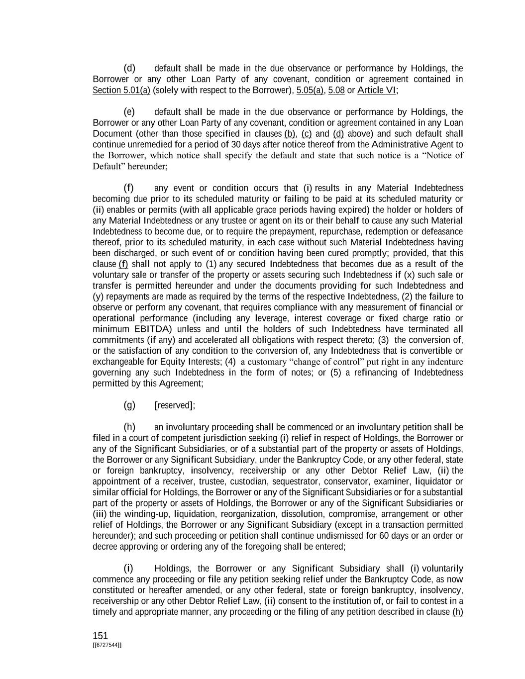 151 [[6727544]] (d) default shall be made in the due observance or performance by Holdings, the Borrower or any other Loan Party of any covenant, condition or agreement contained in Section 5.01(a) (solely with respect to the Borrower), 5.05(a), 5.08 or Article VI; (e) default shall be made in the due observance or performance by Holdings, the Borrower or any other Loan Party of any covenant, condition or agreement contained in any Loan Document (other than those specified in clauses (b), (c) and (d) above) and such default shall continue unremedied for a period of 30 days after notice thereof from the Administrative Agent to the Borrower, which notice shall specify the default and state that such notice is a “Notice of Default” hereunder; (f) any event or condition occurs that (i) results in any Material Indebtedness becoming due prior to its scheduled maturity or failing to be paid at its scheduled maturity or (ii) enables or permits (with all applicable grace periods having expired) the holder or holders of any Material Indebtedness or any trustee or agent on its or their behalf to cause any such Material Indebtedness to become due, or to require the prepayment, repurchase, redemption or defeasance thereof, prior to its scheduled maturity, in each case without such Material Indebtedness having been discharged, or such event of or condition having been cured promptly; provided, that this clause (f) shall not apply to (1) any secured Indebtedness that becomes due as a result of the voluntary sale or transfer of the property or assets securing such Indebtedness if (x) such sale or transfer is permitted hereunder and under the documents providing for such Indebtedness and (y) repayments are made as required by the terms of the respective Indebtedness, (2) the failure to observe or perform any covenant, that requires compliance with any measurement of financial or operational performance (including any leverage, interest coverage or fixed charge ratio or minimum EBITDA) unless and until the holders of such Indebtedness have terminated all commitments (if any) and accelerated all obligations with respect thereto; (3) the conversion of, or the satisfaction of any condition to the conversion of, any Indebtedness that is convertible or exchangeable for Equity Interests; (4) a customary “change of control” put right in any indenture governing any such Indebtedness in the form of notes; or (5) a refinancing of Indebtedness permitted by this Agreement; (g) [reserved]; (h) an involuntary proceeding shall be commenced or an involuntary petition shall be filed in a court of competent jurisdiction seeking (i) relief in respect of Holdings, the Borrower or any of the Significant Subsidiaries, or of a substantial part of the property or assets of Holdings, the Borrower or any Significant Subsidiary, under the Bankruptcy Code, or any other federal, state or foreign bankruptcy, insolvency, receivership or any other Debtor Relief Law, (ii) the appointment of a receiver, trustee, custodian, sequestrator, conservator, examiner, liquidator or similar official for Holdings, the Borrower or any of the Significant Subsidiaries or for a substantial part of the property or assets of Holdings, the Borrower or any of the Significant Subsidiaries or (iii) the winding-up, liquidation, reorganization, dissolution, compromise, arrangement or other relief of Holdings, the Borrower or any Significant Subsidiary (except in a transaction permitted hereunder); and such proceeding or petition shall continue undismissed for 60 days or an order or decree approving or ordering any of the foregoing shall be entered; (i) Holdings, the Borrower or any Significant Subsidiary shall (i) voluntarily commence any proceeding or file any petition seeking relief under the Bankruptcy Code, as now constituted or hereafter amended, or any other federal, state or foreign bankruptcy, insolvency, receivership or any other Debtor Relief Law, (ii) consent to the institution of, or fail to contest in a timely and appropriate manner, any proceeding or the filing of any petition described in clause (h)