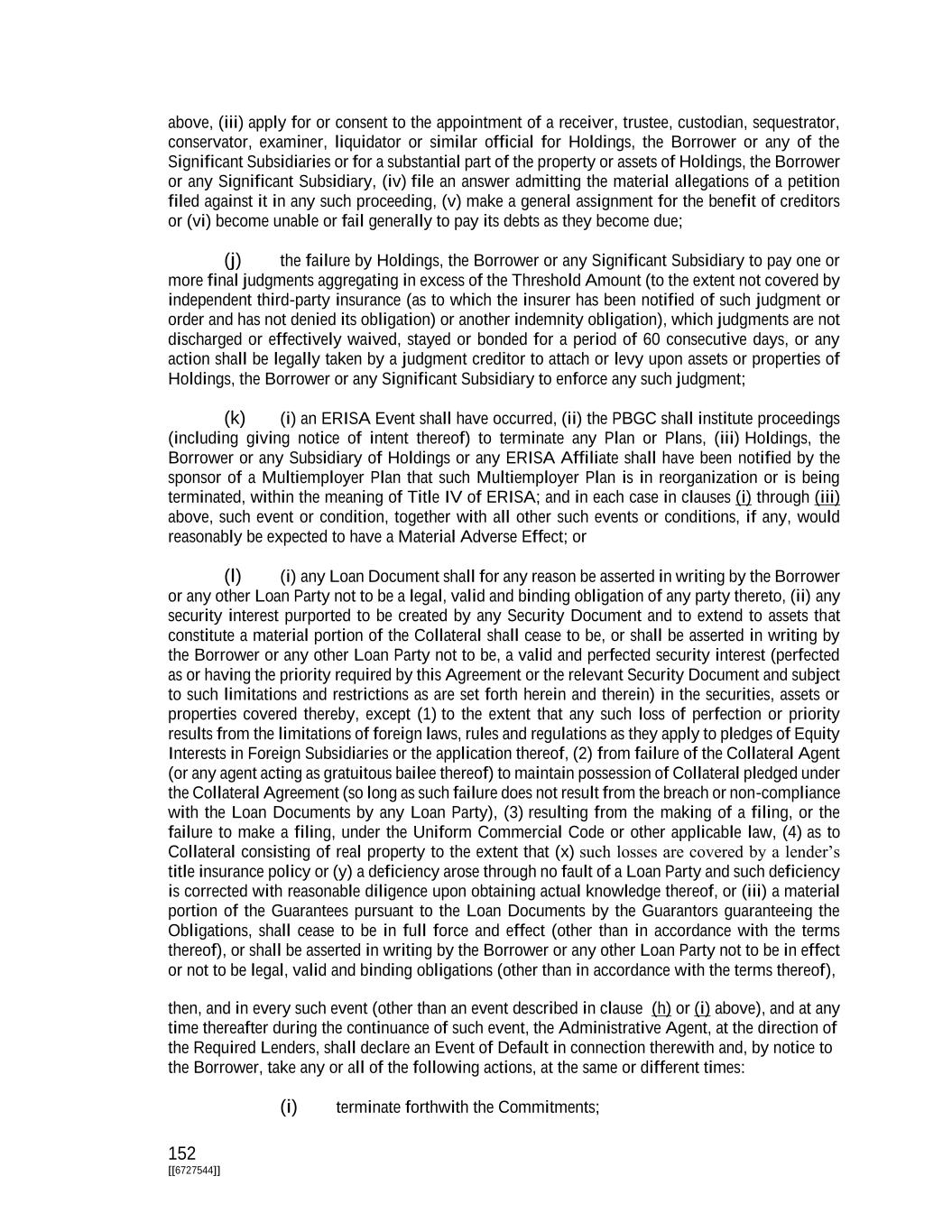 152 [[6727544]] above, (iii) apply for or consent to the appointment of a receiver, trustee, custodian, sequestrator, conservator, examiner, liquidator or similar official for Holdings, the Borrower or any of the Significant Subsidiaries or for a substantial part of the property or assets of Holdings, the Borrower or any Significant Subsidiary, (iv) file an answer admitting the material allegations of a petition filed against it in any such proceeding, (v) make a general assignment for the benefit of creditors or (vi) become unable or fail generally to pay its debts as they become due; (j) the failure by Holdings, the Borrower or any Significant Subsidiary to pay one or more final judgments aggregating in excess of the Threshold Amount (to the extent not covered by independent third-party insurance (as to which the insurer has been notified of such judgment or order and has not denied its obligation) or another indemnity obligation), which judgments are not discharged or effectively waived, stayed or bonded for a period of 60 consecutive days, or any action shall be legally taken by a judgment creditor to attach or levy upon assets or properties of Holdings, the Borrower or any Significant Subsidiary to enforce any such judgment; (k) (i) an ERISA Event shall have occurred, (ii) the PBGC shall institute proceedings (including giving notice of intent thereof) to terminate any Plan or Plans, (iii) Holdings, the Borrower or any Subsidiary of Holdings or any ERISA Affiliate shall have been notified by the sponsor of a Multiemployer Plan that such Multiemployer Plan is in reorganization or is being terminated, within the meaning of Title IV of ERISA; and in each case in clauses (i) through (iii) above, such event or condition, together with all other such events or conditions, if any, would reasonably be expected to have a Material Adverse Effect; or (l) (i) any Loan Document shall for any reason be asserted in writing by the Borrower or any other Loan Party not to be a legal, valid and binding obligation of any party thereto, (ii) any security interest purported to be created by any Security Document and to extend to assets that constitute a material portion of the Collateral shall cease to be, or shall be asserted in writing by the Borrower or any other Loan Party not to be, a valid and perfected security interest (perfected as or having the priority required by this Agreement or the relevant Security Document and subject to such limitations and restrictions as are set forth herein and therein) in the securities, assets or properties covered thereby, except (1) to the extent that any such loss of perfection or priority results from the limitations of foreign laws, rules and regulations as they apply to pledges of Equity Interests in Foreign Subsidiaries or the application thereof, (2) from failure of the Collateral Agent (or any agent acting as gratuitous bailee thereof) to maintain possession of Collateral pledged under the Collateral Agreement (so long as such failure does not result from the breach or non-compliance with the Loan Documents by any Loan Party), (3) resulting from the making of a filing, or the failure to make a filing, under the Uniform Commercial Code or other applicable law, (4) as to Collateral consisting of real property to the extent that (x) such losses are covered by a lender’s title insurance policy or (y) a deficiency arose through no fault of a Loan Party and such deficiency is corrected with reasonable diligence upon obtaining actual knowledge thereof, or (iii) a material portion of the Guarantees pursuant to the Loan Documents by the Guarantors guaranteeing the Obligations, shall cease to be in full force and effect (other than in accordance with the terms thereof), or shall be asserted in writing by the Borrower or any other Loan Party not to be in effect or not to be legal, valid and binding obligations (other than in accordance with the terms thereof), then, and in every such event (other than an event described in clause (h) or (i) above), and at any time thereafter during the continuance of such event, the Administrative Agent, at the direction of the Required Lenders, shall declare an Event of Default in connection therewith and, by notice to the Borrower, take any or all of the following actions, at the same or different times: (i) terminate forthwith the Commitments;