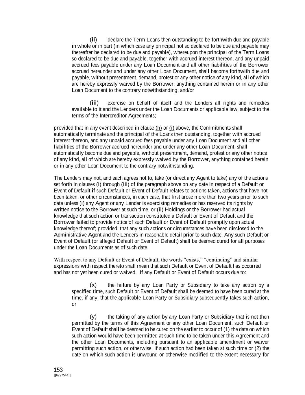 153 [[6727544]] (ii) declare the Term Loans then outstanding to be forthwith due and payable in whole or in part (in which case any principal not so declared to be due and payable may thereafter be declared to be due and payable), whereupon the principal of the Term Loans so declared to be due and payable, together with accrued interest thereon, and any unpaid accrued fees payable under any Loan Document and all other liabilities of the Borrower accrued hereunder and under any other Loan Document, shall become forthwith due and payable, without presentment, demand, protest or any other notice of any kind, all of which are hereby expressly waived by the Borrower, anything contained herein or in any other Loan Document to the contrary notwithstanding; and/or (iii) exercise on behalf of itself and the Lenders all rights and remedies available to it and the Lenders under the Loan Documents or applicable law, subject to the terms of the Intercreditor Agreements; provided that in any event described in clause (h) or (i) above, the Commitments shall automatically terminate and the principal of the Loans then outstanding, together with accrued interest thereon, and any unpaid accrued fees payable under any Loan Document and all other liabilities of the Borrower accrued hereunder and under any other Loan Document, shall automatically become due and payable, without presentment, demand, protest or any other notice of any kind, all of which are hereby expressly waived by the Borrower, anything contained herein or in any other Loan Document to the contrary notwithstanding. The Lenders may not, and each agrees not to, take (or direct any Agent to take) any of the actions set forth in clauses (i) through (iii) of the paragraph above on any date in respect of a Default or Event of Default if such Default or Event of Default relates to actions taken, actions that have not been taken, or other circumstances, in each case, that first arose more than two years prior to such date unless (i) any Agent or any Lender is exercising remedies or has reserved its rights by written notice to the Borrower at such time, or (ii) Holdings or the Borrower had actual knowledge that such action or transaction constituted a Default or Event of Default and the Borrower failed to provide notice of such Default or Event of Default promptly upon actual knowledge thereof; provided, that any such actions or circumstances have been disclosed to the Administrative Agent and the Lenders in reasonable detail prior to such date. Any such Default or Event of Default (or alleged Default or Event of Default) shall be deemed cured for all purposes under the Loan Documents as of such date. With respect to any Default or Event of Default, the words “exists,” “continuing” and similar expressions with respect thereto shall mean that such Default or Event of Default has occurred and has not yet been cured or waived. If any Default or Event of Default occurs due to: (x) the failure by any Loan Party or Subsidiary to take any action by a specified time, such Default or Event of Default shall be deemed to have been cured at the time, if any, that the applicable Loan Party or Subsidiary subsequently takes such action, or (y) the taking of any action by any Loan Party or Subsidiary that is not then permitted by the terms of this Agreement or any other Loan Document, such Default or Event of Default shall be deemed to be cured on the earlier to occur of (1) the date on which such action would have been permitted at such time to be taken under this Agreement and the other Loan Documents, including pursuant to an applicable amendment or waiver permitting such action, or otherwise, if such action had been taken at such time or (2) the date on which such action is unwound or otherwise modified to the extent necessary for