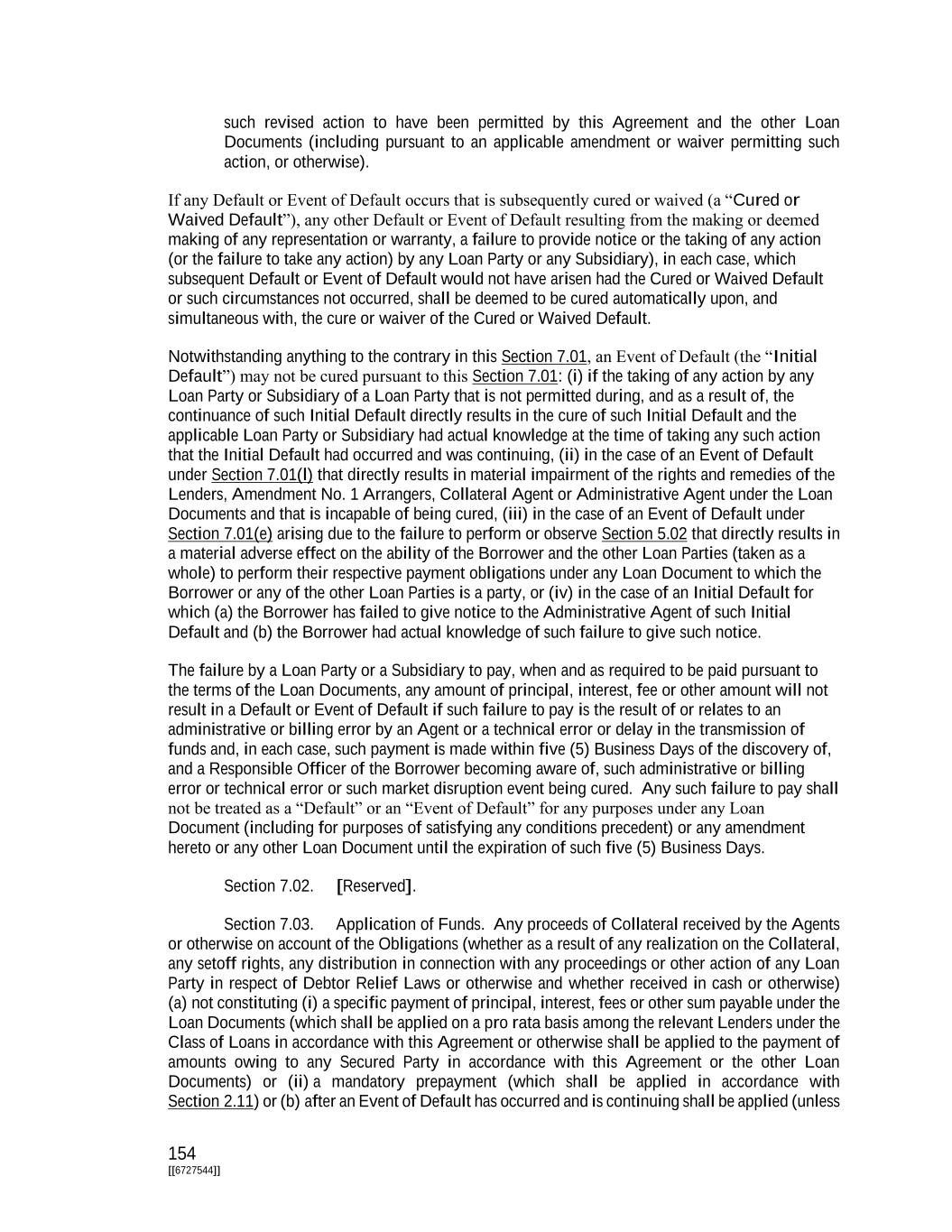 154 [[6727544]] such revised action to have been permitted by this Agreement and the other Loan Documents (including pursuant to an applicable amendment or waiver permitting such action, or otherwise). If any Default or Event of Default occurs that is subsequently cured or waived (a “Cured or Waived Default”), any other Default or Event of Default resulting from the making or deemed making of any representation or warranty, a failure to provide notice or the taking of any action (or the failure to take any action) by any Loan Party or any Subsidiary), in each case, which subsequent Default or Event of Default would not have arisen had the Cured or Waived Default or such circumstances not occurred, shall be deemed to be cured automatically upon, and simultaneous with, the cure or waiver of the Cured or Waived Default. Notwithstanding anything to the contrary in this Section 7.01, an Event of Default (the “Initial Default”) may not be cured pursuant to this Section 7.01: (i) if the taking of any action by any Loan Party or Subsidiary of a Loan Party that is not permitted during, and as a result of, the continuance of such Initial Default directly results in the cure of such Initial Default and the applicable Loan Party or Subsidiary had actual knowledge at the time of taking any such action that the Initial Default had occurred and was continuing, (ii) in the case of an Event of Default under Section 7.01(l) that directly results in material impairment of the rights and remedies of the Lenders, Amendment No. 1 Arrangers, Collateral Agent or Administrative Agent under the Loan Documents and that is incapable of being cured, (iii) in the case of an Event of Default under Section 7.01(e) arising due to the failure to perform or observe Section 5.02 that directly results in a material adverse effect on the ability of the Borrower and the other Loan Parties (taken as a whole) to perform their respective payment obligations under any Loan Document to which the Borrower or any of the other Loan Parties is a party, or (iv) in the case of an Initial Default for which (a) the Borrower has failed to give notice to the Administrative Agent of such Initial Default and (b) the Borrower had actual knowledge of such failure to give such notice. The failure by a Loan Party or a Subsidiary to pay, when and as required to be paid pursuant to the terms of the Loan Documents, any amount of principal, interest, fee or other amount will not result in a Default or Event of Default if such failure to pay is the result of or relates to an administrative or billing error by an Agent or a technical error or delay in the transmission of funds and, in each case, such payment is made within five (5) Business Days of the discovery of, and a Responsible Officer of the Borrower becoming aware of, such administrative or billing error or technical error or such market disruption event being cured. Any such failure to pay shall not be treated as a “Default” or an “Event of Default” for any purposes under any Loan Document (including for purposes of satisfying any conditions precedent) or any amendment hereto or any other Loan Document until the expiration of such five (5) Business Days. Section 7.02. [Reserved]. Section 7.03. Application of Funds. Any proceeds of Collateral received by the Agents or otherwise on account of the Obligations (whether as a result of any realization on the Collateral, any setoff rights, any distribution in connection with any proceedings or other action of any Loan Party in respect of Debtor Relief Laws or otherwise and whether received in cash or otherwise) (a) not constituting (i) a specific payment of principal, interest, fees or other sum payable under the Loan Documents (which shall be applied on a pro rata basis among the relevant Lenders under the Class of Loans in accordance with this Agreement or otherwise shall be applied to the payment of amounts owing to any Secured Party in accordance with this Agreement or the other Loan Documents) or (ii) a mandatory prepayment (which shall be applied in accordance with Section 2.11) or (b) after an Event of Default has occurred and is continuing shall be applied (unless