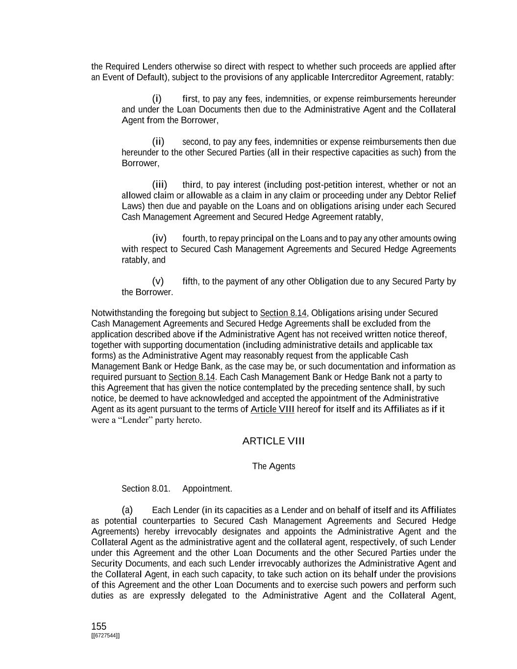155 [[6727544]] the Required Lenders otherwise so direct with respect to whether such proceeds are applied after an Event of Default), subject to the provisions of any applicable Intercreditor Agreement, ratably: (i) first, to pay any fees, indemnities, or expense reimbursements hereunder and under the Loan Documents then due to the Administrative Agent and the Collateral Agent from the Borrower, (ii) second, to pay any fees, indemnities or expense reimbursements then due hereunder to the other Secured Parties (all in their respective capacities as such) from the Borrower, (iii) third, to pay interest (including post-petition interest, whether or not an allowed claim or allowable as a claim in any claim or proceeding under any Debtor Relief Laws) then due and payable on the Loans and on obligations arising under each Secured Cash Management Agreement and Secured Hedge Agreement ratably, (iv) fourth, to repay principal on the Loans and to pay any other amounts owing with respect to Secured Cash Management Agreements and Secured Hedge Agreements ratably, and (v) fifth, to the payment of any other Obligation due to any Secured Party by the Borrower. Notwithstanding the foregoing but subject to Section 8.14, Obligations arising under Secured Cash Management Agreements and Secured Hedge Agreements shall be excluded from the application described above if the Administrative Agent has not received written notice thereof, together with supporting documentation (including administrative details and applicable tax forms) as the Administrative Agent may reasonably request from the applicable Cash Management Bank or Hedge Bank, as the case may be, or such documentation and information as required pursuant to Section 8.14. Each Cash Management Bank or Hedge Bank not a party to this Agreement that has given the notice contemplated by the preceding sentence shall, by such notice, be deemed to have acknowledged and accepted the appointment of the Administrative Agent as its agent pursuant to the terms of Article VIII hereof for itself and its Affiliates as if it were a “Lender” party hereto. ARTICLE VIII The Agents Section 8.01. Appointment. (a) Each Lender (in its capacities as a Lender and on behalf of itself and its Affiliates as potential counterparties to Secured Cash Management Agreements and Secured Hedge Agreements) hereby irrevocably designates and appoints the Administrative Agent and the Collateral Agent as the administrative agent and the collateral agent, respectively, of such Lender under this Agreement and the other Loan Documents and the other Secured Parties under the Security Documents, and each such Lender irrevocably authorizes the Administrative Agent and the Collateral Agent, in each such capacity, to take such action on its behalf under the provisions of this Agreement and the other Loan Documents and to exercise such powers and perform such duties as are expressly delegated to the Administrative Agent and the Collateral Agent,