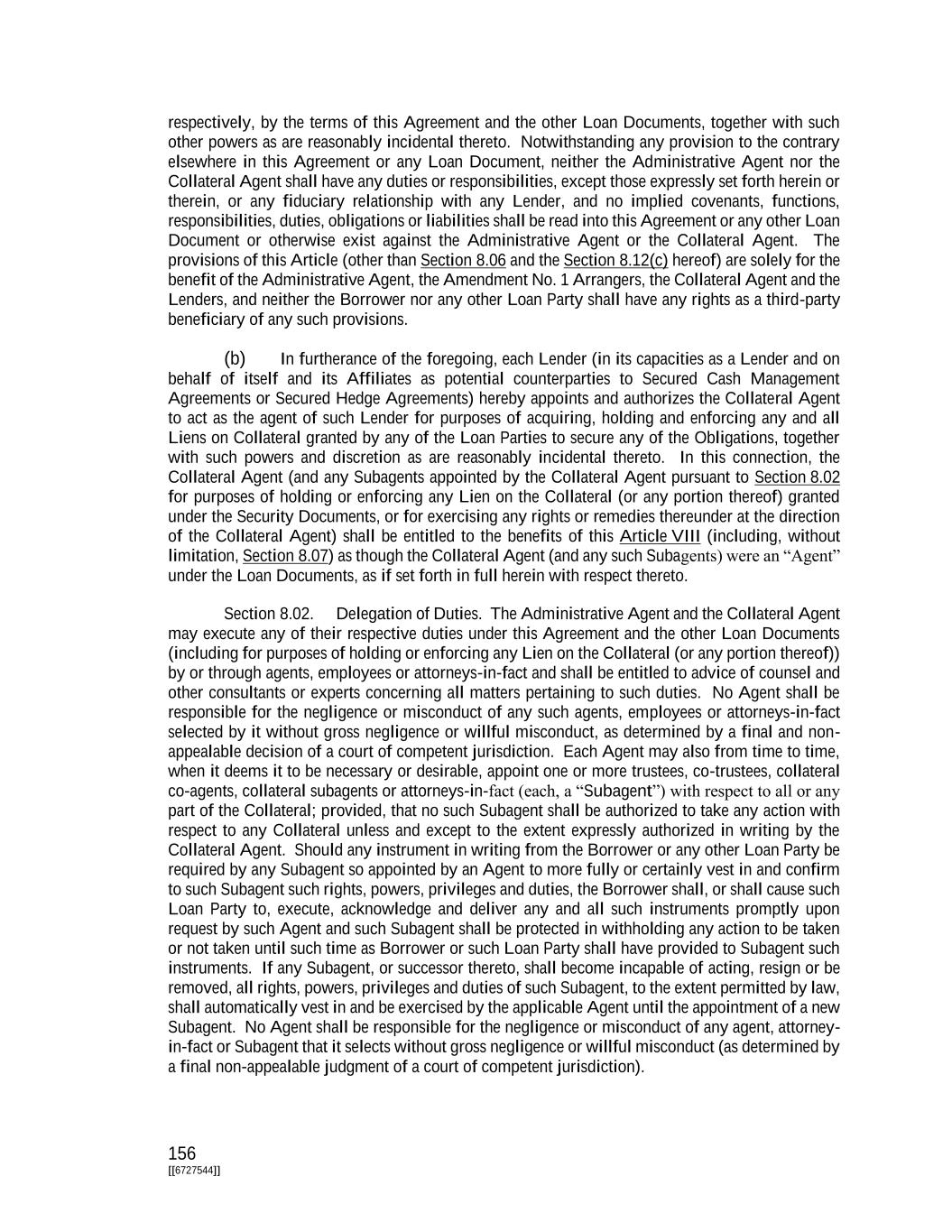156 [[6727544]] respectively, by the terms of this Agreement and the other Loan Documents, together with such other powers as are reasonably incidental thereto. Notwithstanding any provision to the contrary elsewhere in this Agreement or any Loan Document, neither the Administrative Agent nor the Collateral Agent shall have any duties or responsibilities, except those expressly set forth herein or therein, or any fiduciary relationship with any Lender, and no implied covenants, functions, responsibilities, duties, obligations or liabilities shall be read into this Agreement or any other Loan Document or otherwise exist against the Administrative Agent or the Collateral Agent. The provisions of this Article (other than Section 8.06 and the Section 8.12(c) hereof) are solely for the benefit of the Administrative Agent, the Amendment No. 1 Arrangers, the Collateral Agent and the Lenders, and neither the Borrower nor any other Loan Party shall have any rights as a third-party beneficiary of any such provisions. (b) In furtherance of the foregoing, each Lender (in its capacities as a Lender and on behalf of itself and its Affiliates as potential counterparties to Secured Cash Management Agreements or Secured Hedge Agreements) hereby appoints and authorizes the Collateral Agent to act as the agent of such Lender for purposes of acquiring, holding and enforcing any and all Liens on Collateral granted by any of the Loan Parties to secure any of the Obligations, together with such powers and discretion as are reasonably incidental thereto. In this connection, the Collateral Agent (and any Subagents appointed by the Collateral Agent pursuant to Section 8.02 for purposes of holding or enforcing any Lien on the Collateral (or any portion thereof) granted under the Security Documents, or for exercising any rights or remedies thereunder at the direction of the Collateral Agent) shall be entitled to the benefits of this Article VIII (including, without limitation, Section 8.07) as though the Collateral Agent (and any such Subagents) were an “Agent” under the Loan Documents, as if set forth in full herein with respect thereto. Section 8.02. Delegation of Duties. The Administrative Agent and the Collateral Agent may execute any of their respective duties under this Agreement and the other Loan Documents (including for purposes of holding or enforcing any Lien on the Collateral (or any portion thereof)) by or through agents, employees or attorneys-in-fact and shall be entitled to advice of counsel and other consultants or experts concerning all matters pertaining to such duties. No Agent shall be responsible for the negligence or misconduct of any such agents, employees or attorneys-in-fact selected by it without gross negligence or willful misconduct, as determined by a final and non- appealable decision of a court of competent jurisdiction. Each Agent may also from time to time, when it deems it to be necessary or desirable, appoint one or more trustees, co-trustees, collateral co-agents, collateral subagents or attorneys-in-fact (each, a “Subagent”) with respect to all or any part of the Collateral; provided, that no such Subagent shall be authorized to take any action with respect to any Collateral unless and except to the extent expressly authorized in writing by the Collateral Agent. Should any instrument in writing from the Borrower or any other Loan Party be required by any Subagent so appointed by an Agent to more fully or certainly vest in and confirm to such Subagent such rights, powers, privileges and duties, the Borrower shall, or shall cause such Loan Party to, execute, acknowledge and deliver any and all such instruments promptly upon request by such Agent and such Subagent shall be protected in withholding any action to be taken or not taken until such time as Borrower or such Loan Party shall have provided to Subagent such instruments. If any Subagent, or successor thereto, shall become incapable of acting, resign or be removed, all rights, powers, privileges and duties of such Subagent, to the extent permitted by law, shall automatically vest in and be exercised by the applicable Agent until the appointment of a new Subagent. No Agent shall be responsible for the negligence or misconduct of any agent, attorney- in-fact or Subagent that it selects without gross negligence or willful misconduct (as determined by a final non-appealable judgment of a court of competent jurisdiction).