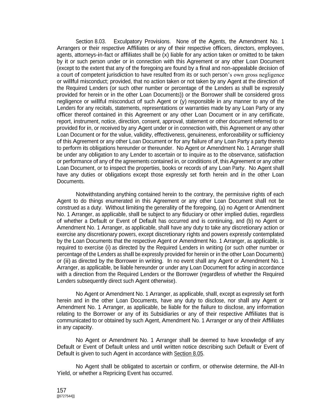 157 [[6727544]] Section 8.03. Exculpatory Provisions. None of the Agents, the Amendment No. 1 Arrangers or their respective Affiliates or any of their respective officers, directors, employees, agents, attorneys-in-fact or affiliates shall be (x) liable for any action taken or omitted to be taken by it or such person under or in connection with this Agreement or any other Loan Document (except to the extent that any of the foregoing are found by a final and non-appealable decision of a court of competent jurisdiction to have resulted from its or such person’s own gross negligence or willful misconduct; provided, that no action taken or not taken by any Agent at the direction of the Required Lenders (or such other number or percentage of the Lenders as shall be expressly provided for herein or in the other Loan Documents)) or the Borrower shall be considered gross negligence or willful misconduct of such Agent or (y) responsible in any manner to any of the Lenders for any recitals, statements, representations or warranties made by any Loan Party or any officer thereof contained in this Agreement or any other Loan Document or in any certificate, report, instrument, notice, direction, consent, approval, statement or other document referred to or provided for in, or received by any Agent under or in connection with, this Agreement or any other Loan Document or for the value, validity, effectiveness, genuineness, enforceability or sufficiency of this Agreement or any other Loan Document or for any failure of any Loan Party a party thereto to perform its obligations hereunder or thereunder. No Agent or Amendment No. 1 Arranger shall be under any obligation to any Lender to ascertain or to inquire as to the observance, satisfaction or performance of any of the agreements contained in, or conditions of, this Agreement or any other Loan Document, or to inspect the properties, books or records of any Loan Party. No Agent shall have any duties or obligations except those expressly set forth herein and in the other Loan Documents. Notwithstanding anything contained herein to the contrary, the permissive rights of each Agent to do things enumerated in this Agreement or any other Loan Document shall not be construed as a duty. Without limiting the generality of the foregoing, (a) no Agent or Amendment No. 1 Arranger, as applicable, shall be subject to any fiduciary or other implied duties, regardless of whether a Default or Event of Default has occurred and is continuing, and (b) no Agent or Amendment No. 1 Arranger, as applicable, shall have any duty to take any discretionary action or exercise any discretionary powers, except discretionary rights and powers expressly contemplated by the Loan Documents that the respective Agent or Amendment No. 1 Arranger, as applicable, is required to exercise (i) as directed by the Required Lenders in writing (or such other number or percentage of the Lenders as shall be expressly provided for herein or in the other Loan Documents) or (ii) as directed by the Borrower in writing. In no event shall any Agent or Amendment No. 1 Arranger, as applicable, be liable hereunder or under any Loan Document for acting in accordance with a direction from the Required Lenders or the Borrower (regardless of whether the Required Lenders subsequently direct such Agent otherwise). No Agent or Amendment No. 1 Arranger, as applicable, shall, except as expressly set forth herein and in the other Loan Documents, have any duty to disclose, nor shall any Agent or Amendment No. 1 Arranger, as applicable, be liable for the failure to disclose, any information relating to the Borrower or any of its Subsidiaries or any of their respective Affiliates that is communicated to or obtained by such Agent, Amendment No. 1 Arranger or any of their Affiliates in any capacity. No Agent or Amendment No. 1 Arranger shall be deemed to have knowledge of any Default or Event of Default unless and until written notice describing such Default or Event of Default is given to such Agent in accordance with Section 8.05. No Agent shall be obligated to ascertain or confirm, or otherwise determine, the All-In Yield, or whether a Repricing Event has occurred.