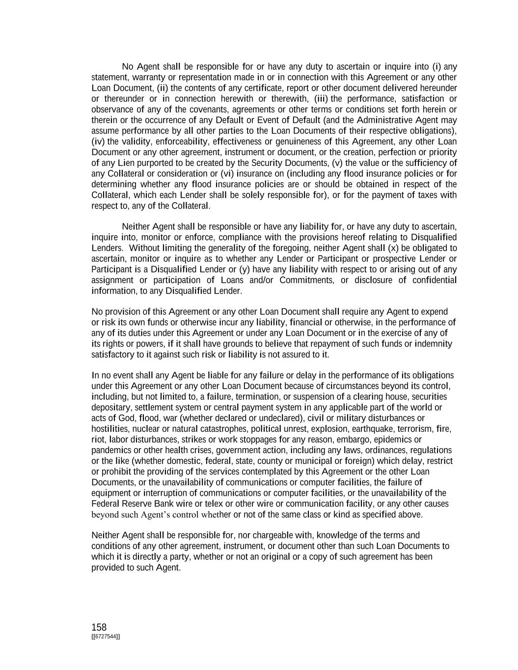 158 [[6727544]] No Agent shall be responsible for or have any duty to ascertain or inquire into (i) any statement, warranty or representation made in or in connection with this Agreement or any other Loan Document, (ii) the contents of any certificate, report or other document delivered hereunder or thereunder or in connection herewith or therewith, (iii) the performance, satisfaction or observance of any of the covenants, agreements or other terms or conditions set forth herein or therein or the occurrence of any Default or Event of Default (and the Administrative Agent may assume performance by all other parties to the Loan Documents of their respective obligations), (iv) the validity, enforceability, effectiveness or genuineness of this Agreement, any other Loan Document or any other agreement, instrument or document, or the creation, perfection or priority of any Lien purported to be created by the Security Documents, (v) the value or the sufficiency of any Collateral or consideration or (vi) insurance on (including any flood insurance policies or for determining whether any flood insurance policies are or should be obtained in respect of the Collateral, which each Lender shall be solely responsible for), or for the payment of taxes with respect to, any of the Collateral. Neither Agent shall be responsible or have any liability for, or have any duty to ascertain, inquire into, monitor or enforce, compliance with the provisions hereof relating to Disqualified Lenders. Without limiting the generality of the foregoing, neither Agent shall (x) be obligated to ascertain, monitor or inquire as to whether any Lender or Participant or prospective Lender or Participant is a Disqualified Lender or (y) have any liability with respect to or arising out of any assignment or participation of Loans and/or Commitments, or disclosure of confidential information, to any Disqualified Lender. No provision of this Agreement or any other Loan Document shall require any Agent to expend or risk its own funds or otherwise incur any liability, financial or otherwise, in the performance of any of its duties under this Agreement or under any Loan Document or in the exercise of any of its rights or powers, if it shall have grounds to believe that repayment of such funds or indemnity satisfactory to it against such risk or liability is not assured to it. In no event shall any Agent be liable for any failure or delay in the performance of its obligations under this Agreement or any other Loan Document because of circumstances beyond its control, including, but not limited to, a failure, termination, or suspension of a clearing house, securities depositary, settlement system or central payment system in any applicable part of the world or acts of God, flood, war (whether declared or undeclared), civil or military disturbances or hostilities, nuclear or natural catastrophes, political unrest, explosion, earthquake, terrorism, fire, riot, labor disturbances, strikes or work stoppages for any reason, embargo, epidemics or pandemics or other health crises, government action, including any laws, ordinances, regulations or the like (whether domestic, federal, state, county or municipal or foreign) which delay, restrict or prohibit the providing of the services contemplated by this Agreement or the other Loan Documents, or the unavailability of communications or computer facilities, the failure of equipment or interruption of communications or computer facilities, or the unavailability of the Federal Reserve Bank wire or telex or other wire or communication facility, or any other causes beyond such Agent’s control whether or not of the same class or kind as specified above. Neither Agent shall be responsible for, nor chargeable with, knowledge of the terms and conditions of any other agreement, instrument, or document other than such Loan Documents to which it is directly a party, whether or not an original or a copy of such agreement has been provided to such Agent.