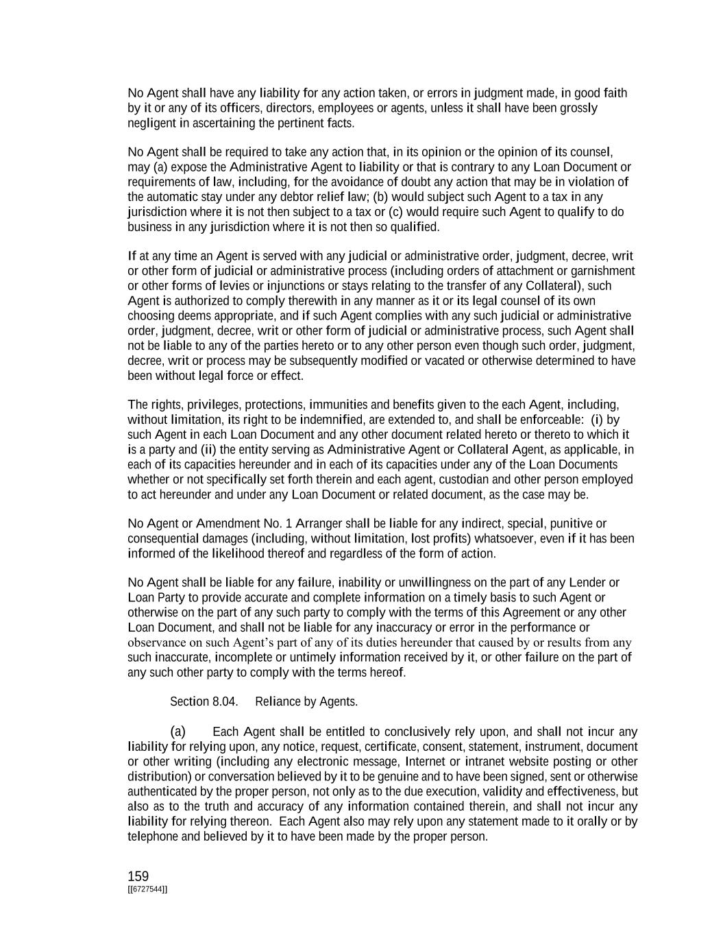 159 [[6727544]] No Agent shall have any liability for any action taken, or errors in judgment made, in good faith by it or any of its officers, directors, employees or agents, unless it shall have been grossly negligent in ascertaining the pertinent facts. No Agent shall be required to take any action that, in its opinion or the opinion of its counsel, may (a) expose the Administrative Agent to liability or that is contrary to any Loan Document or requirements of law, including, for the avoidance of doubt any action that may be in violation of the automatic stay under any debtor relief law; (b) would subject such Agent to a tax in any jurisdiction where it is not then subject to a tax or (c) would require such Agent to qualify to do business in any jurisdiction where it is not then so qualified. If at any time an Agent is served with any judicial or administrative order, judgment, decree, writ or other form of judicial or administrative process (including orders of attachment or garnishment or other forms of levies or injunctions or stays relating to the transfer of any Collateral), such Agent is authorized to comply therewith in any manner as it or its legal counsel of its own choosing deems appropriate, and if such Agent complies with any such judicial or administrative order, judgment, decree, writ or other form of judicial or administrative process, such Agent shall not be liable to any of the parties hereto or to any other person even though such order, judgment, decree, writ or process may be subsequently modified or vacated or otherwise determined to have been without legal force or effect. The rights, privileges, protections, immunities and benefits given to the each Agent, including, without limitation, its right to be indemnified, are extended to, and shall be enforceable: (i) by such Agent in each Loan Document and any other document related hereto or thereto to which it is a party and (ii) the entity serving as Administrative Agent or Collateral Agent, as applicable, in each of its capacities hereunder and in each of its capacities under any of the Loan Documents whether or not specifically set forth therein and each agent, custodian and other person employed to act hereunder and under any Loan Document or related document, as the case may be. No Agent or Amendment No. 1 Arranger shall be liable for any indirect, special, punitive or consequential damages (including, without limitation, lost profits) whatsoever, even if it has been informed of the likelihood thereof and regardless of the form of action. No Agent shall be liable for any failure, inability or unwillingness on the part of any Lender or Loan Party to provide accurate and complete information on a timely basis to such Agent or otherwise on the part of any such party to comply with the terms of this Agreement or any other Loan Document, and shall not be liable for any inaccuracy or error in the performance or observance on such Agent’s part of any of its duties hereunder that caused by or results from any such inaccurate, incomplete or untimely information received by it, or other failure on the part of any such other party to comply with the terms hereof. Section 8.04. Reliance by Agents. (a) Each Agent shall be entitled to conclusively rely upon, and shall not incur any liability for relying upon, any notice, request, certificate, consent, statement, instrument, document or other writing (including any electronic message, Internet or intranet website posting or other distribution) or conversation believed by it to be genuine and to have been signed, sent or otherwise authenticated by the proper person, not only as to the due execution, validity and effectiveness, but also as to the truth and accuracy of any information contained therein, and shall not incur any liability for relying thereon. Each Agent also may rely upon any statement made to it orally or by telephone and believed by it to have been made by the proper person.