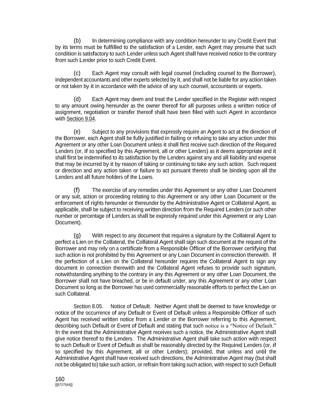 160 [[6727544]] (b) In determining compliance with any condition hereunder to any Credit Event that by its terms must be fulfilled to the satisfaction of a Lender, each Agent may presume that such condition is satisfactory to such Lender unless such Agent shall have received notice to the contrary from such Lender prior to such Credit Event. (c) Each Agent may consult with legal counsel (including counsel to the Borrower), independent accountants and other experts selected by it, and shall not be liable for any action taken or not taken by it in accordance with the advice of any such counsel, accountants or experts. (d) Each Agent may deem and treat the Lender specified in the Register with respect to any amount owing hereunder as the owner thereof for all purposes unless a written notice of assignment, negotiation or transfer thereof shall have been filed with such Agent in accordance with Section 9.04. (e) Subject to any provisions that expressly require an Agent to act at the direction of the Borrower, each Agent shall be fully justified in failing or refusing to take any action under this Agreement or any other Loan Document unless it shall first receive such direction of the Required Lenders (or, if so specified by this Agreement, all or other Lenders) as it deems appropriate and it shall first be indemnified to its satisfaction by the Lenders against any and all liability and expense that may be incurred by it by reason of taking or continuing to take any such action. Such request or direction and any action taken or failure to act pursuant thereto shall be binding upon all the Lenders and all future holders of the Loans. (f) The exercise of any remedies under this Agreement or any other Loan Document or any suit, action or proceeding relating to this Agreement or any other Loan Document or the enforcement of rights hereunder or thereunder by the Administrative Agent or Collateral Agent, as applicable, shall be subject to receiving written direction from the Required Lenders (or such other number or percentage of Lenders as shall be expressly required under this Agreement or any Loan Document). (g) With respect to any document that requires a signature by the Collateral Agent to perfect a Lien on the Collateral, the Collateral Agent shall sign such document at the request of the Borrower and may rely on a certificate from a Responsible Officer of the Borrower certifying that such action is not prohibited by this Agreement or any Loan Document in connection therewith. If the perfection of a Lien on the Collateral hereunder requires the Collateral Agent to sign any document in connection therewith and the Collateral Agent refuses to provide such signature, notwithstanding anything to the contrary in any this Agreement or any other Loan Document, the Borrower shall not have breached, or be in default under, any this Agreement or any other Loan Document so long as the Borrower has used commercially reasonable efforts to perfect the Lien on such Collateral. Section 8.05. Notice of Default. Neither Agent shall be deemed to have knowledge or notice of the occurrence of any Default or Event of Default unless a Responsible Officer of such Agent has received written notice from a Lender or the Borrower referring to this Agreement, describing such Default or Event of Default and stating that such notice is a “Notice of Default.” In the event that the Administrative Agent receives such a notice, the Administrative Agent shall give notice thereof to the Lenders. The Administrative Agent shall take such action with respect to such Default or Event of Default as shall be reasonably directed by the Required Lenders (or, if so specified by this Agreement, all or other Lenders); provided, that unless and until the Administrative Agent shall have received such directions, the Administrative Agent may (but shall not be obligated to) take such action, or refrain from taking such action, with respect to such Default