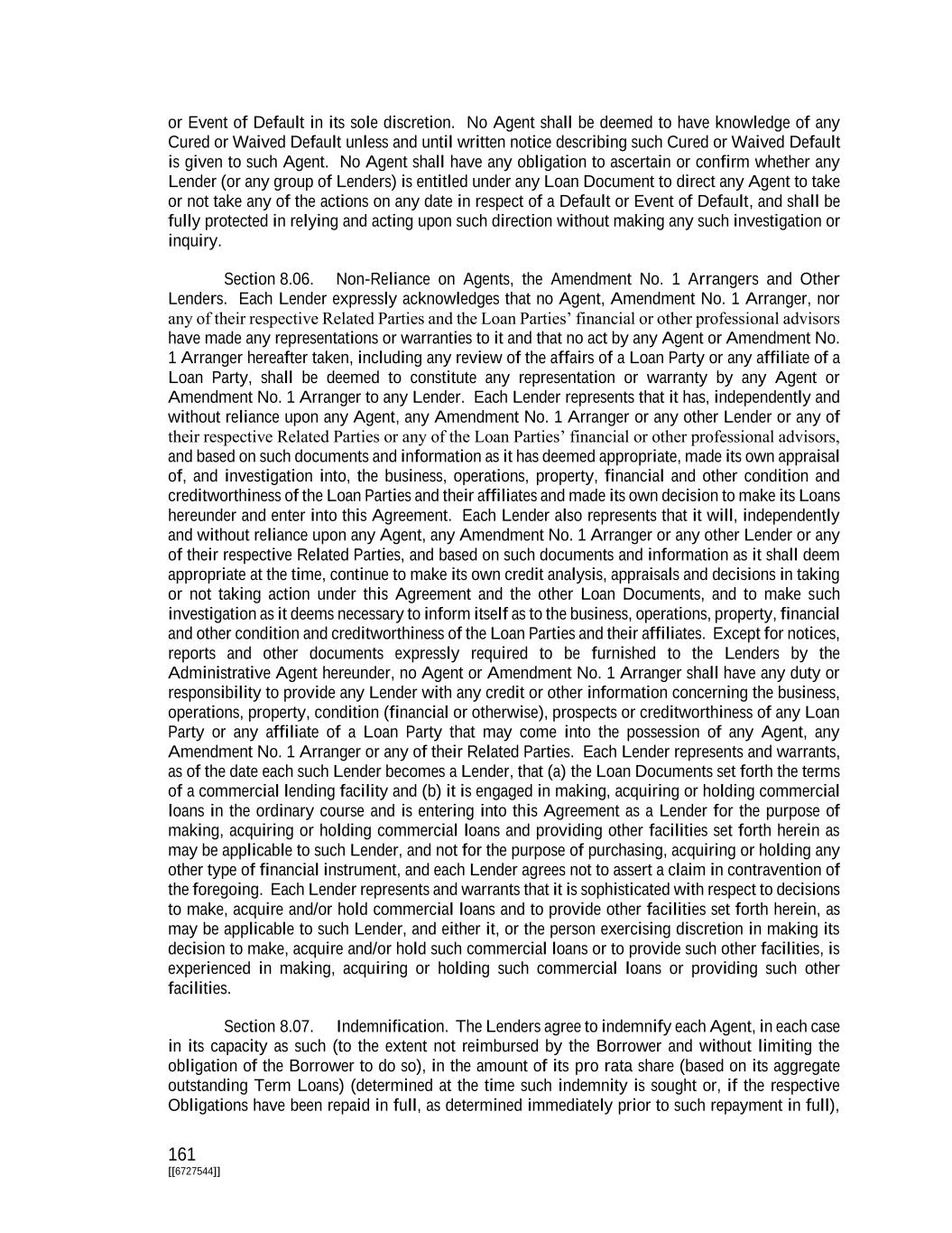 161 [[6727544]] or Event of Default in its sole discretion. No Agent shall be deemed to have knowledge of any Cured or Waived Default unless and until written notice describing such Cured or Waived Default is given to such Agent. No Agent shall have any obligation to ascertain or confirm whether any Lender (or any group of Lenders) is entitled under any Loan Document to direct any Agent to take or not take any of the actions on any date in respect of a Default or Event of Default, and shall be fully protected in relying and acting upon such direction without making any such investigation or inquiry. Section 8.06. Non-Reliance on Agents, the Amendment No. 1 Arrangers and Other Lenders. Each Lender expressly acknowledges that no Agent, Amendment No. 1 Arranger, nor any of their respective Related Parties and the Loan Parties’ financial or other professional advisors have made any representations or warranties to it and that no act by any Agent or Amendment No. 1 Arranger hereafter taken, including any review of the affairs of a Loan Party or any affiliate of a Loan Party, shall be deemed to constitute any representation or warranty by any Agent or Amendment No. 1 Arranger to any Lender. Each Lender represents that it has, independently and without reliance upon any Agent, any Amendment No. 1 Arranger or any other Lender or any of their respective Related Parties or any of the Loan Parties’ financial or other professional advisors, and based on such documents and information as it has deemed appropriate, made its own appraisal of, and investigation into, the business, operations, property, financial and other condition and creditworthiness of the Loan Parties and their affiliates and made its own decision to make its Loans hereunder and enter into this Agreement. Each Lender also represents that it will, independently and without reliance upon any Agent, any Amendment No. 1 Arranger or any other Lender or any of their respective Related Parties, and based on such documents and information as it shall deem appropriate at the time, continue to make its own credit analysis, appraisals and decisions in taking or not taking action under this Agreement and the other Loan Documents, and to make such investigation as it deems necessary to inform itself as to the business, operations, property, financial and other condition and creditworthiness of the Loan Parties and their affiliates. Except for notices, reports and other documents expressly required to be furnished to the Lenders by the Administrative Agent hereunder, no Agent or Amendment No. 1 Arranger shall have any duty or responsibility to provide any Lender with any credit or other information concerning the business, operations, property, condition (financial or otherwise), prospects or creditworthiness of any Loan Party or any affiliate of a Loan Party that may come into the possession of any Agent, any Amendment No. 1 Arranger or any of their Related Parties. Each Lender represents and warrants, as of the date each such Lender becomes a Lender, that (a) the Loan Documents set forth the terms of a commercial lending facility and (b) it is engaged in making, acquiring or holding commercial loans in the ordinary course and is entering into this Agreement as a Lender for the purpose of making, acquiring or holding commercial loans and providing other facilities set forth herein as may be applicable to such Lender, and not for the purpose of purchasing, acquiring or holding any other type of financial instrument, and each Lender agrees not to assert a claim in contravention of the foregoing. Each Lender represents and warrants that it is sophisticated with respect to decisions to make, acquire and/or hold commercial loans and to provide other facilities set forth herein, as may be applicable to such Lender, and either it, or the person exercising discretion in making its decision to make, acquire and/or hold such commercial loans or to provide such other facilities, is experienced in making, acquiring or holding such commercial loans or providing such other facilities. Section 8.07. Indemnification. The Lenders agree to indemnify each Agent, in each case in its capacity as such (to the extent not reimbursed by the Borrower and without limiting the obligation of the Borrower to do so), in the amount of its pro rata share (based on its aggregate outstanding Term Loans) (determined at the time such indemnity is sought or, if the respective Obligations have been repaid in full, as determined immediately prior to such repayment in full),