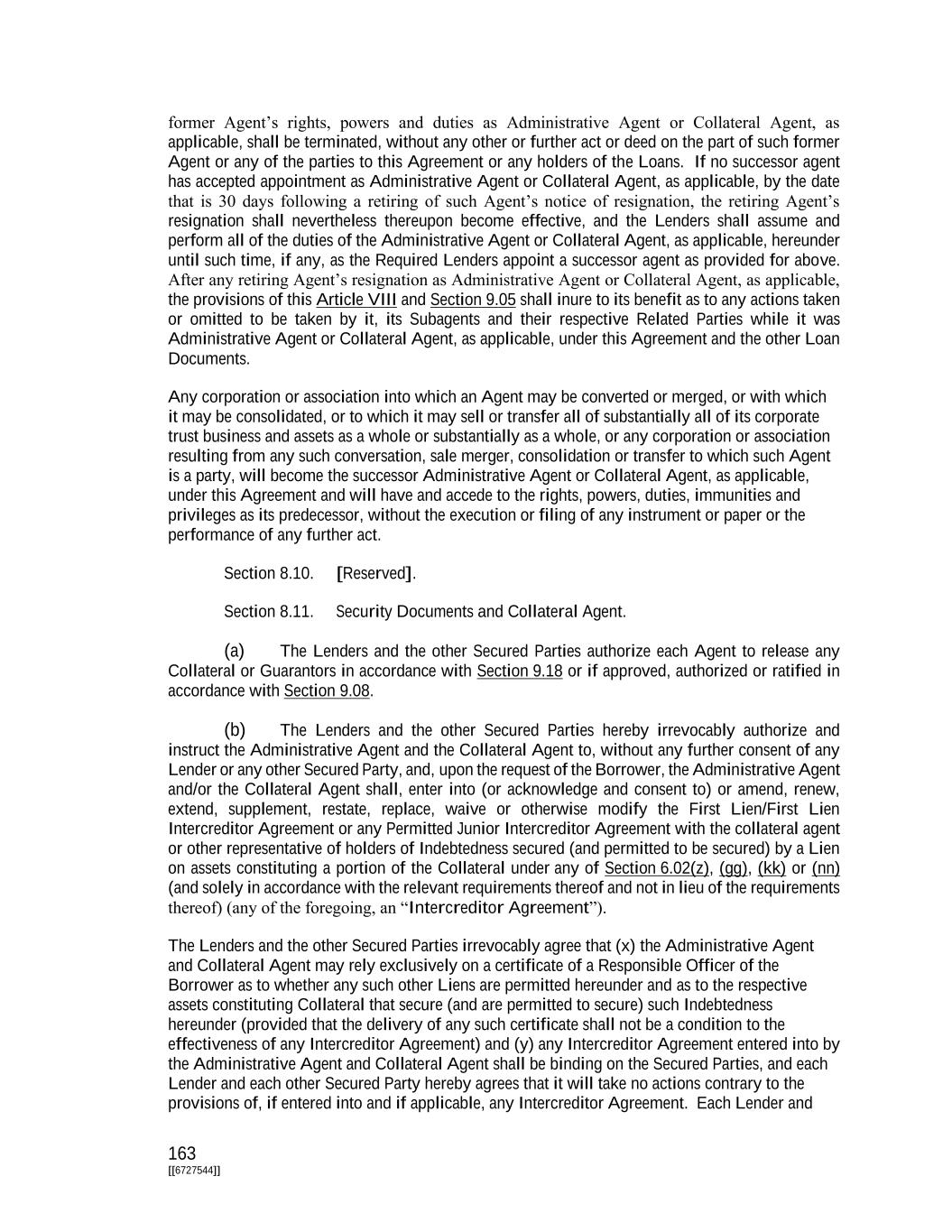 163 [[6727544]] former Agent’s rights, powers and duties as Administrative Agent or Collateral Agent, as applicable, shall be terminated, without any other or further act or deed on the part of such former Agent or any of the parties to this Agreement or any holders of the Loans. If no successor agent has accepted appointment as Administrative Agent or Collateral Agent, as applicable, by the date that is 30 days following a retiring of such Agent’s notice of resignation, the retiring Agent’s resignation shall nevertheless thereupon become effective, and the Lenders shall assume and perform all of the duties of the Administrative Agent or Collateral Agent, as applicable, hereunder until such time, if any, as the Required Lenders appoint a successor agent as provided for above. After any retiring Agent’s resignation as Administrative Agent or Collateral Agent, as applicable, the provisions of this Article VIII and Section 9.05 shall inure to its benefit as to any actions taken or omitted to be taken by it, its Subagents and their respective Related Parties while it was Administrative Agent or Collateral Agent, as applicable, under this Agreement and the other Loan Documents. Any corporation or association into which an Agent may be converted or merged, or with which it may be consolidated, or to which it may sell or transfer all of substantially all of its corporate trust business and assets as a whole or substantially as a whole, or any corporation or association resulting from any such conversation, sale merger, consolidation or transfer to which such Agent is a party, will become the successor Administrative Agent or Collateral Agent, as applicable, under this Agreement and will have and accede to the rights, powers, duties, immunities and privileges as its predecessor, without the execution or filing of any instrument or paper or the performance of any further act. Section 8.10. [Reserved]. Section 8.11. Security Documents and Collateral Agent. (a) The Lenders and the other Secured Parties authorize each Agent to release any Collateral or Guarantors in accordance with Section 9.18 or if approved, authorized or ratified in accordance with Section 9.08. (b) The Lenders and the other Secured Parties hereby irrevocably authorize and instruct the Administrative Agent and the Collateral Agent to, without any further consent of any Lender or any other Secured Party, and, upon the request of the Borrower, the Administrative Agent and/or the Collateral Agent shall, enter into (or acknowledge and consent to) or amend, renew, extend, supplement, restate, replace, waive or otherwise modify the First Lien/First Lien Intercreditor Agreement or any Permitted Junior Intercreditor Agreement with the collateral agent or other representative of holders of Indebtedness secured (and permitted to be secured) by a Lien on assets constituting a portion of the Collateral under any of Section 6.02(z), (gg), (kk) or (nn) (and solely in accordance with the relevant requirements thereof and not in lieu of the requirements thereof) (any of the foregoing, an “Intercreditor Agreement”). The Lenders and the other Secured Parties irrevocably agree that (x) the Administrative Agent and Collateral Agent may rely exclusively on a certificate of a Responsible Officer of the Borrower as to whether any such other Liens are permitted hereunder and as to the respective assets constituting Collateral that secure (and are permitted to secure) such Indebtedness hereunder (provided that the delivery of any such certificate shall not be a condition to the effectiveness of any Intercreditor Agreement) and (y) any Intercreditor Agreement entered into by the Administrative Agent and Collateral Agent shall be binding on the Secured Parties, and each Lender and each other Secured Party hereby agrees that it will take no actions contrary to the provisions of, if entered into and if applicable, any Intercreditor Agreement. Each Lender and