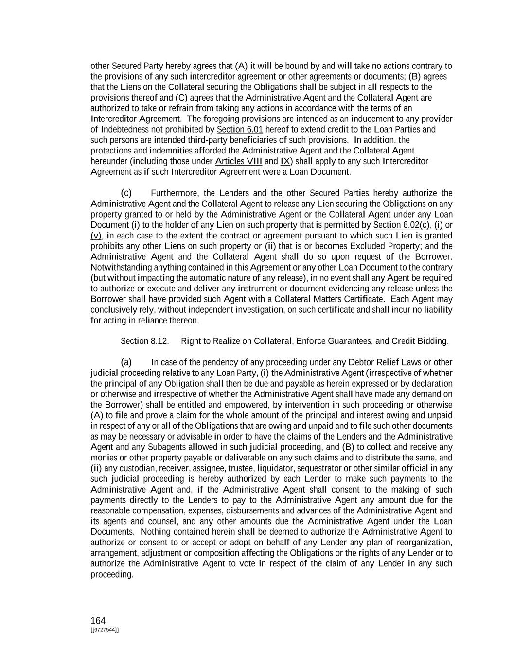 164 [[6727544]] other Secured Party hereby agrees that (A) it will be bound by and will take no actions contrary to the provisions of any such intercreditor agreement or other agreements or documents; (B) agrees that the Liens on the Collateral securing the Obligations shall be subject in all respects to the provisions thereof and (C) agrees that the Administrative Agent and the Collateral Agent are authorized to take or refrain from taking any actions in accordance with the terms of an Intercreditor Agreement. The foregoing provisions are intended as an inducement to any provider of Indebtedness not prohibited by Section 6.01 hereof to extend credit to the Loan Parties and such persons are intended third-party beneficiaries of such provisions. In addition, the protections and indemnities afforded the Administrative Agent and the Collateral Agent hereunder (including those under Articles VIII and IX) shall apply to any such Intercreditor Agreement as if such Intercreditor Agreement were a Loan Document. (c) Furthermore, the Lenders and the other Secured Parties hereby authorize the Administrative Agent and the Collateral Agent to release any Lien securing the Obligations on any property granted to or held by the Administrative Agent or the Collateral Agent under any Loan Document (i) to the holder of any Lien on such property that is permitted by Section 6.02(c), (i) or (v), in each case to the extent the contract or agreement pursuant to which such Lien is granted prohibits any other Liens on such property or (ii) that is or becomes Excluded Property; and the Administrative Agent and the Collateral Agent shall do so upon request of the Borrower. Notwithstanding anything contained in this Agreement or any other Loan Document to the contrary (but without impacting the automatic nature of any release), in no event shall any Agent be required to authorize or execute and deliver any instrument or document evidencing any release unless the Borrower shall have provided such Agent with a Collateral Matters Certificate. Each Agent may conclusively rely, without independent investigation, on such certificate and shall incur no liability for acting in reliance thereon. Section 8.12. Right to Realize on Collateral, Enforce Guarantees, and Credit Bidding. (a) In case of the pendency of any proceeding under any Debtor Relief Laws or other judicial proceeding relative to any Loan Party, (i) the Administrative Agent (irrespective of whether the principal of any Obligation shall then be due and payable as herein expressed or by declaration or otherwise and irrespective of whether the Administrative Agent shall have made any demand on the Borrower) shall be entitled and empowered, by intervention in such proceeding or otherwise (A) to file and prove a claim for the whole amount of the principal and interest owing and unpaid in respect of any or all of the Obligations that are owing and unpaid and to file such other documents as may be necessary or advisable in order to have the claims of the Lenders and the Administrative Agent and any Subagents allowed in such judicial proceeding, and (B) to collect and receive any monies or other property payable or deliverable on any such claims and to distribute the same, and (ii) any custodian, receiver, assignee, trustee, liquidator, sequestrator or other similar official in any such judicial proceeding is hereby authorized by each Lender to make such payments to the Administrative Agent and, if the Administrative Agent shall consent to the making of such payments directly to the Lenders to pay to the Administrative Agent any amount due for the reasonable compensation, expenses, disbursements and advances of the Administrative Agent and its agents and counsel, and any other amounts due the Administrative Agent under the Loan Documents. Nothing contained herein shall be deemed to authorize the Administrative Agent to authorize or consent to or accept or adopt on behalf of any Lender any plan of reorganization, arrangement, adjustment or composition affecting the Obligations or the rights of any Lender or to authorize the Administrative Agent to vote in respect of the claim of any Lender in any such proceeding.