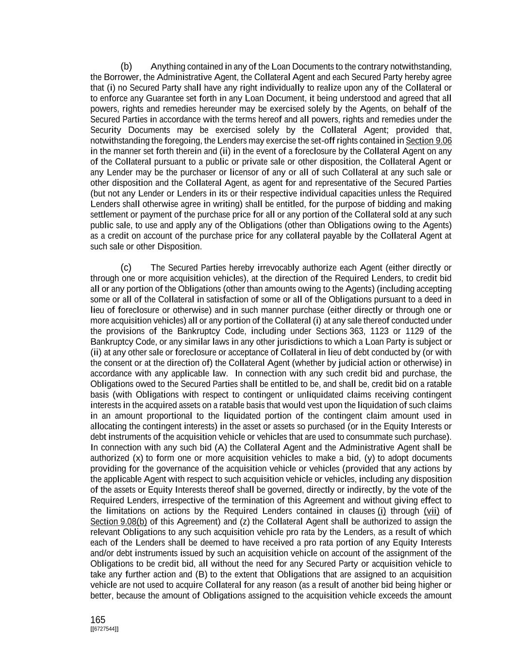 165 [[6727544]] (b) Anything contained in any of the Loan Documents to the contrary notwithstanding, the Borrower, the Administrative Agent, the Collateral Agent and each Secured Party hereby agree that (i) no Secured Party shall have any right individually to realize upon any of the Collateral or to enforce any Guarantee set forth in any Loan Document, it being understood and agreed that all powers, rights and remedies hereunder may be exercised solely by the Agents, on behalf of the Secured Parties in accordance with the terms hereof and all powers, rights and remedies under the Security Documents may be exercised solely by the Collateral Agent; provided that, notwithstanding the foregoing, the Lenders may exercise the set-off rights contained in Section 9.06 in the manner set forth therein and (ii) in the event of a foreclosure by the Collateral Agent on any of the Collateral pursuant to a public or private sale or other disposition, the Collateral Agent or any Lender may be the purchaser or licensor of any or all of such Collateral at any such sale or other disposition and the Collateral Agent, as agent for and representative of the Secured Parties (but not any Lender or Lenders in its or their respective individual capacities unless the Required Lenders shall otherwise agree in writing) shall be entitled, for the purpose of bidding and making settlement or payment of the purchase price for all or any portion of the Collateral sold at any such public sale, to use and apply any of the Obligations (other than Obligations owing to the Agents) as a credit on account of the purchase price for any collateral payable by the Collateral Agent at such sale or other Disposition. (c) The Secured Parties hereby irrevocably authorize each Agent (either directly or through one or more acquisition vehicles), at the direction of the Required Lenders, to credit bid all or any portion of the Obligations (other than amounts owing to the Agents) (including accepting some or all of the Collateral in satisfaction of some or all of the Obligations pursuant to a deed in lieu of foreclosure or otherwise) and in such manner purchase (either directly or through one or more acquisition vehicles) all or any portion of the Collateral (i) at any sale thereof conducted under the provisions of the Bankruptcy Code, including under Sections 363, 1123 or 1129 of the Bankruptcy Code, or any similar laws in any other jurisdictions to which a Loan Party is subject or (ii) at any other sale or foreclosure or acceptance of Collateral in lieu of debt conducted by (or with the consent or at the direction of) the Collateral Agent (whether by judicial action or otherwise) in accordance with any applicable law. In connection with any such credit bid and purchase, the Obligations owed to the Secured Parties shall be entitled to be, and shall be, credit bid on a ratable basis (with Obligations with respect to contingent or unliquidated claims receiving contingent interests in the acquired assets on a ratable basis that would vest upon the liquidation of such claims in an amount proportional to the liquidated portion of the contingent claim amount used in allocating the contingent interests) in the asset or assets so purchased (or in the Equity Interests or debt instruments of the acquisition vehicle or vehicles that are used to consummate such purchase). In connection with any such bid (A) the Collateral Agent and the Administrative Agent shall be authorized (x) to form one or more acquisition vehicles to make a bid, (y) to adopt documents providing for the governance of the acquisition vehicle or vehicles (provided that any actions by the applicable Agent with respect to such acquisition vehicle or vehicles, including any disposition of the assets or Equity Interests thereof shall be governed, directly or indirectly, by the vote of the Required Lenders, irrespective of the termination of this Agreement and without giving effect to the limitations on actions by the Required Lenders contained in clauses (i) through (vii) of Section 9.08(b) of this Agreement) and (z) the Collateral Agent shall be authorized to assign the relevant Obligations to any such acquisition vehicle pro rata by the Lenders, as a result of which each of the Lenders shall be deemed to have received a pro rata portion of any Equity Interests and/or debt instruments issued by such an acquisition vehicle on account of the assignment of the Obligations to be credit bid, all without the need for any Secured Party or acquisition vehicle to take any further action and (B) to the extent that Obligations that are assigned to an acquisition vehicle are not used to acquire Collateral for any reason (as a result of another bid being higher or better, because the amount of Obligations assigned to the acquisition vehicle exceeds the amount