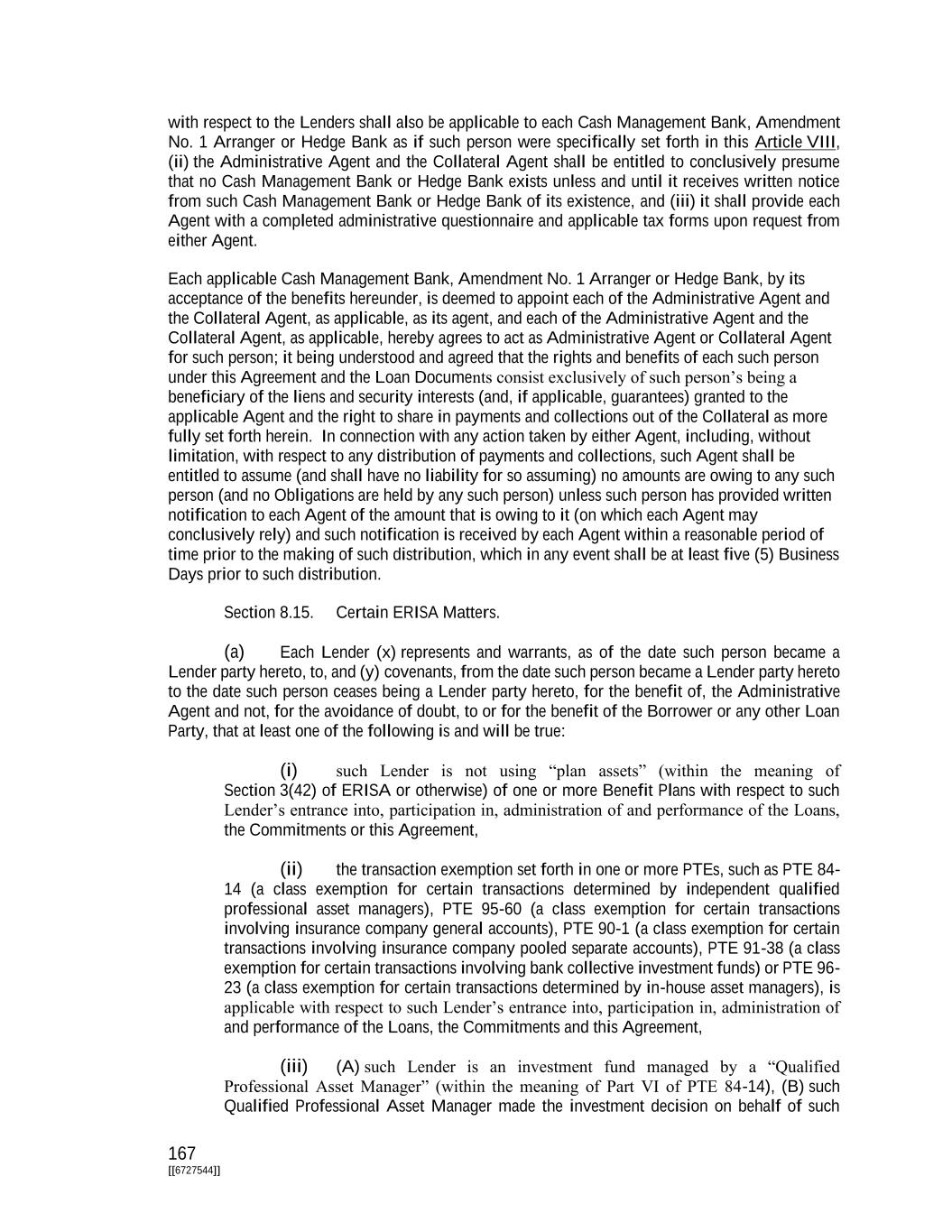 167 [[6727544]] with respect to the Lenders shall also be applicable to each Cash Management Bank, Amendment No. 1 Arranger or Hedge Bank as if such person were specifically set forth in this Article VIII, (ii) the Administrative Agent and the Collateral Agent shall be entitled to conclusively presume that no Cash Management Bank or Hedge Bank exists unless and until it receives written notice from such Cash Management Bank or Hedge Bank of its existence, and (iii) it shall provide each Agent with a completed administrative questionnaire and applicable tax forms upon request from either Agent. Each applicable Cash Management Bank, Amendment No. 1 Arranger or Hedge Bank, by its acceptance of the benefits hereunder, is deemed to appoint each of the Administrative Agent and the Collateral Agent, as applicable, as its agent, and each of the Administrative Agent and the Collateral Agent, as applicable, hereby agrees to act as Administrative Agent or Collateral Agent for such person; it being understood and agreed that the rights and benefits of each such person under this Agreement and the Loan Documents consist exclusively of such person’s being a beneficiary of the liens and security interests (and, if applicable, guarantees) granted to the applicable Agent and the right to share in payments and collections out of the Collateral as more fully set forth herein. In connection with any action taken by either Agent, including, without limitation, with respect to any distribution of payments and collections, such Agent shall be entitled to assume (and shall have no liability for so assuming) no amounts are owing to any such person (and no Obligations are held by any such person) unless such person has provided written notification to each Agent of the amount that is owing to it (on which each Agent may conclusively rely) and such notification is received by each Agent within a reasonable period of time prior to the making of such distribution, which in any event shall be at least five (5) Business Days prior to such distribution. Section 8.15. Certain ERISA Matters. (a) Each Lender (x) represents and warrants, as of the date such person became a Lender party hereto, to, and (y) covenants, from the date such person became a Lender party hereto to the date such person ceases being a Lender party hereto, for the benefit of, the Administrative Agent and not, for the avoidance of doubt, to or for the benefit of the Borrower or any other Loan Party, that at least one of the following is and will be true: (i) such Lender is not using “plan assets” (within the meaning of Section 3(42) of ERISA or otherwise) of one or more Benefit Plans with respect to such Lender’s entrance into, participation in, administration of and performance of the Loans, the Commitments or this Agreement, (ii) the transaction exemption set forth in one or more PTEs, such as PTE 84- 14 (a class exemption for certain transactions determined by independent qualified professional asset managers), PTE 95-60 (a class exemption for certain transactions involving insurance company general accounts), PTE 90-1 (a class exemption for certain transactions involving insurance company pooled separate accounts), PTE 91-38 (a class exemption for certain transactions involving bank collective investment funds) or PTE 96- 23 (a class exemption for certain transactions determined by in-house asset managers), is applicable with respect to such Lender’s entrance into, participation in, administration of and performance of the Loans, the Commitments and this Agreement, (iii) (A) such Lender is an investment fund managed by a “Qualified Professional Asset Manager” (within the meaning of Part VI of PTE 84-14), (B) such Qualified Professional Asset Manager made the investment decision on behalf of such