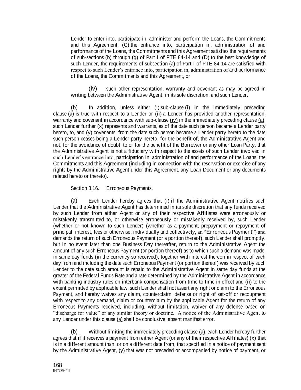 168 [[6727544]] Lender to enter into, participate in, administer and perform the Loans, the Commitments and this Agreement, (C) the entrance into, participation in, administration of and performance of the Loans, the Commitments and this Agreement satisfies the requirements of sub-sections (b) through (g) of Part I of PTE 84-14 and (D) to the best knowledge of such Lender, the requirements of subsection (a) of Part I of PTE 84-14 are satisfied with respect to such Lender’s entrance into, participation in, administration of and performance of the Loans, the Commitments and this Agreement, or (iv) such other representation, warranty and covenant as may be agreed in writing between the Administrative Agent, in its sole discretion, and such Lender. (b) In addition, unless either (i) sub-clause (i) in the immediately preceding clause (a) is true with respect to a Lender or (ii) a Lender has provided another representation, warranty and covenant in accordance with sub-clause (iv) in the immediately preceding clause (a), such Lender further (x) represents and warrants, as of the date such person became a Lender party hereto, to, and (y) covenants, from the date such person became a Lender party hereto to the date such person ceases being a Lender party hereto, for the benefit of, the Administrative Agent and not, for the avoidance of doubt, to or for the benefit of the Borrower or any other Loan Party, that the Administrative Agent is not a fiduciary with respect to the assets of such Lender involved in such Lender’s entrance into, participation in, administration of and performance of the Loans, the Commitments and this Agreement (including in connection with the reservation or exercise of any rights by the Administrative Agent under this Agreement, any Loan Document or any documents related hereto or thereto). Section 8.16. Erroneous Payments. (a) Each Lender hereby agrees that (i) if the Administrative Agent notifies such Lender that the Administrative Agent has determined in its sole discretion that any funds received by such Lender from either Agent or any of their respective Affiliates were erroneously or mistakenly transmitted to, or otherwise erroneously or mistakenly received by, such Lender (whether or not known to such Lender) (whether as a payment, prepayment or repayment of principal, interest, fees or otherwise; individually and collectively, an “Erroneous Payment”) and demands the return of such Erroneous Payment (or a portion thereof), such Lender shall promptly, but in no event later than one Business Day thereafter, return to the Administrative Agent the amount of any such Erroneous Payment (or portion thereof) as to which such a demand was made, in same day funds (in the currency so received), together with interest thereon in respect of each day from and including the date such Erroneous Payment (or portion thereof) was received by such Lender to the date such amount is repaid to the Administrative Agent in same day funds at the greater of the Federal Funds Rate and a rate determined by the Administrative Agent in accordance with banking industry rules on interbank compensation from time to time in effect and (ii) to the extent permitted by applicable law, such Lender shall not assert any right or claim to the Erroneous Payment, and hereby waives any claim, counterclaim, defense or right of set-off or recoupment with respect to any demand, claim or counterclaim by the applicable Agent for the return of any Erroneous Payments received, including, without limitation, waiver of any defense based on “discharge for value” or any similar theory or doctrine. A notice of the Administrative Agent to any Lender under this clause (a) shall be conclusive, absent manifest error. (b) Without limiting the immediately preceding clause (a), each Lender hereby further agrees that if it receives a payment from either Agent (or any of their respective Affiliates) (x) that is in a different amount than, or on a different date from, that specified in a notice of payment sent by the Administrative Agent, (y) that was not preceded or accompanied by notice of payment, or