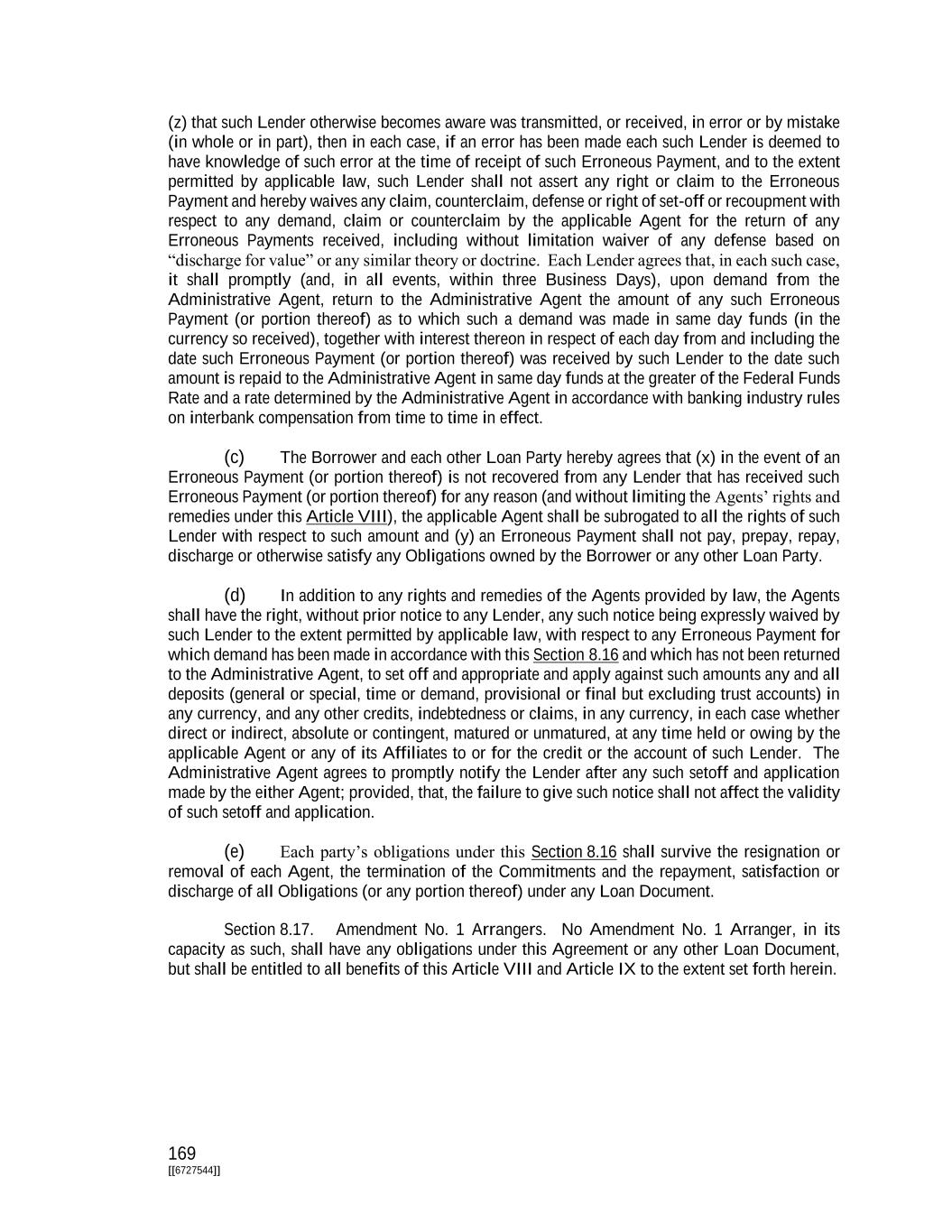 169 [[6727544]] (z) that such Lender otherwise becomes aware was transmitted, or received, in error or by mistake (in whole or in part), then in each case, if an error has been made each such Lender is deemed to have knowledge of such error at the time of receipt of such Erroneous Payment, and to the extent permitted by applicable law, such Lender shall not assert any right or claim to the Erroneous Payment and hereby waives any claim, counterclaim, defense or right of set-off or recoupment with respect to any demand, claim or counterclaim by the applicable Agent for the return of any Erroneous Payments received, including without limitation waiver of any defense based on “discharge for value” or any similar theory or doctrine. Each Lender agrees that, in each such case, it shall promptly (and, in all events, within three Business Days), upon demand from the Administrative Agent, return to the Administrative Agent the amount of any such Erroneous Payment (or portion thereof) as to which such a demand was made in same day funds (in the currency so received), together with interest thereon in respect of each day from and including the date such Erroneous Payment (or portion thereof) was received by such Lender to the date such amount is repaid to the Administrative Agent in same day funds at the greater of the Federal Funds Rate and a rate determined by the Administrative Agent in accordance with banking industry rules on interbank compensation from time to time in effect. (c) The Borrower and each other Loan Party hereby agrees that (x) in the event of an Erroneous Payment (or portion thereof) is not recovered from any Lender that has received such Erroneous Payment (or portion thereof) for any reason (and without limiting the Agents’ rights and remedies under this Article VIII), the applicable Agent shall be subrogated to all the rights of such Lender with respect to such amount and (y) an Erroneous Payment shall not pay, prepay, repay, discharge or otherwise satisfy any Obligations owned by the Borrower or any other Loan Party. (d) In addition to any rights and remedies of the Agents provided by law, the Agents shall have the right, without prior notice to any Lender, any such notice being expressly waived by such Lender to the extent permitted by applicable law, with respect to any Erroneous Payment for which demand has been made in accordance with this Section 8.16 and which has not been returned to the Administrative Agent, to set off and appropriate and apply against such amounts any and all deposits (general or special, time or demand, provisional or final but excluding trust accounts) in any currency, and any other credits, indebtedness or claims, in any currency, in each case whether direct or indirect, absolute or contingent, matured or unmatured, at any time held or owing by the applicable Agent or any of its Affiliates to or for the credit or the account of such Lender. The Administrative Agent agrees to promptly notify the Lender after any such setoff and application made by the either Agent; provided, that, the failure to give such notice shall not affect the validity of such setoff and application. (e) Each party’s obligations under this Section 8.16 shall survive the resignation or removal of each Agent, the termination of the Commitments and the repayment, satisfaction or discharge of all Obligations (or any portion thereof) under any Loan Document. Section 8.17. Amendment No. 1 Arrangers. No Amendment No. 1 Arranger, in its capacity as such, shall have any obligations under this Agreement or any other Loan Document, but shall be entitled to all benefits of this Article VIII and Article IX to the extent set forth herein.