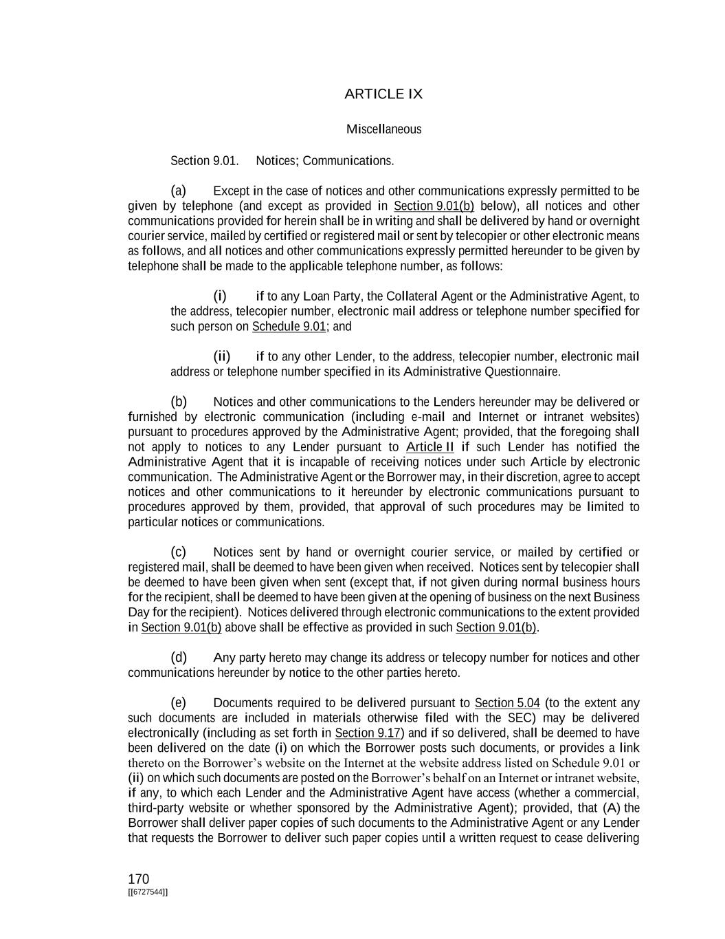 170 [[6727544]] ARTICLE IX Miscellaneous Section 9.01. Notices; Communications. (a) Except in the case of notices and other communications expressly permitted to be given by telephone (and except as provided in Section 9.01(b) below), all notices and other communications provided for herein shall be in writing and shall be delivered by hand or overnight courier service, mailed by certified or registered mail or sent by telecopier or other electronic means as follows, and all notices and other communications expressly permitted hereunder to be given by telephone shall be made to the applicable telephone number, as follows: (i) if to any Loan Party, the Collateral Agent or the Administrative Agent, to the address, telecopier number, electronic mail address or telephone number specified for such person on Schedule 9.01; and (ii) if to any other Lender, to the address, telecopier number, electronic mail address or telephone number specified in its Administrative Questionnaire. (b) Notices and other communications to the Lenders hereunder may be delivered or furnished by electronic communication (including e-mail and Internet or intranet websites) pursuant to procedures approved by the Administrative Agent; provided, that the foregoing shall not apply to notices to any Lender pursuant to Article II if such Lender has notified the Administrative Agent that it is incapable of receiving notices under such Article by electronic communication. The Administrative Agent or the Borrower may, in their discretion, agree to accept notices and other communications to it hereunder by electronic communications pursuant to procedures approved by them, provided, that approval of such procedures may be limited to particular notices or communications. (c) Notices sent by hand or overnight courier service, or mailed by certified or registered mail, shall be deemed to have been given when received. Notices sent by telecopier shall be deemed to have been given when sent (except that, if not given during normal business hours for the recipient, shall be deemed to have been given at the opening of business on the next Business Day for the recipient). Notices delivered through electronic communications to the extent provided in Section 9.01(b) above shall be effective as provided in such Section 9.01(b). (d) Any party hereto may change its address or telecopy number for notices and other communications hereunder by notice to the other parties hereto. (e) Documents required to be delivered pursuant to Section 5.04 (to the extent any such documents are included in materials otherwise filed with the SEC) may be delivered electronically (including as set forth in Section 9.17) and if so delivered, shall be deemed to have been delivered on the date (i) on which the Borrower posts such documents, or provides a link thereto on the Borrower’s website on the Internet at the website address listed on Schedule 9.01 or (ii) on which such documents are posted on the Borrower’s behalf on an Internet or intranet website, if any, to which each Lender and the Administrative Agent have access (whether a commercial, third-party website or whether sponsored by the Administrative Agent); provided, that (A) the Borrower shall deliver paper copies of such documents to the Administrative Agent or any Lender that requests the Borrower to deliver such paper copies until a written request to cease delivering