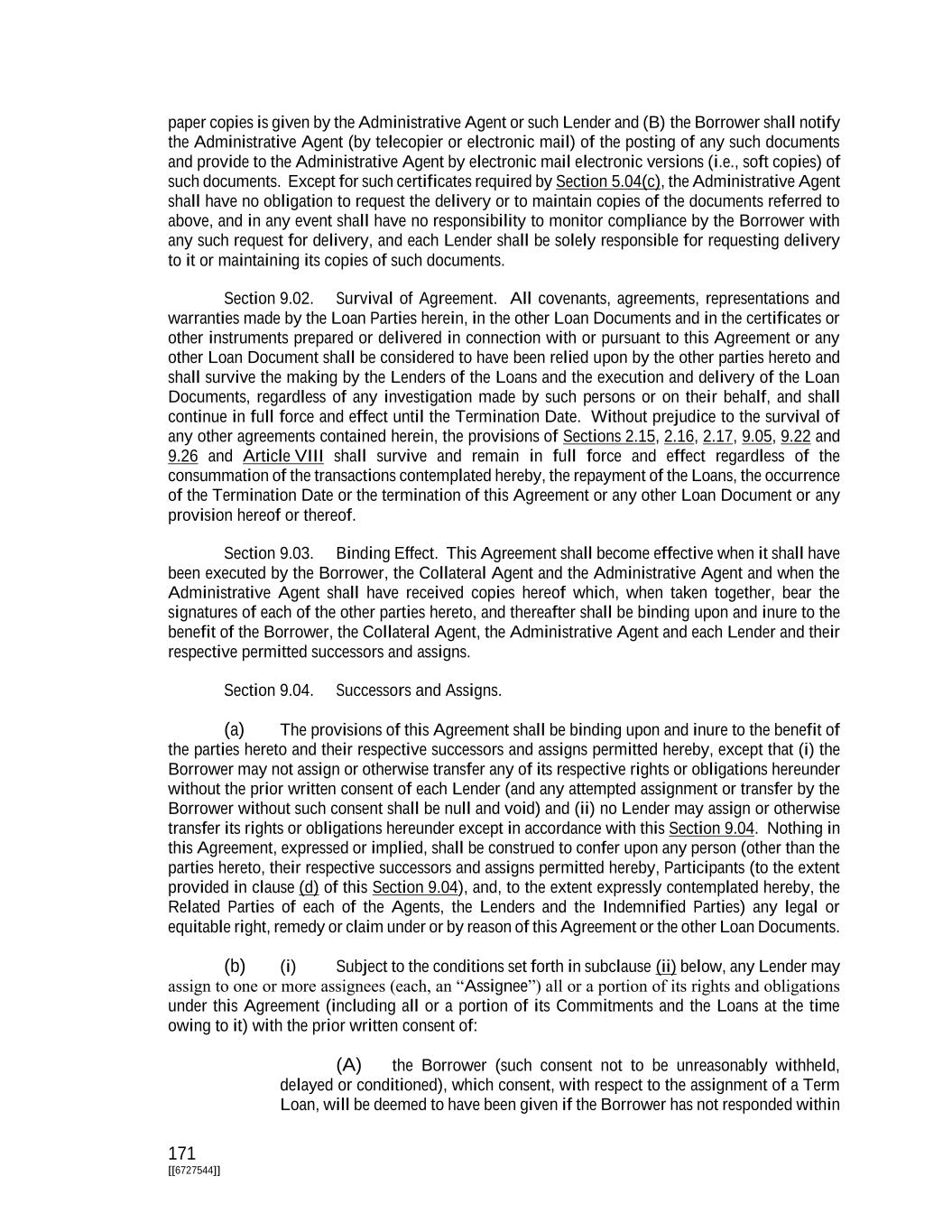 171 [[6727544]] paper copies is given by the Administrative Agent or such Lender and (B) the Borrower shall notify the Administrative Agent (by telecopier or electronic mail) of the posting of any such documents and provide to the Administrative Agent by electronic mail electronic versions (i.e., soft copies) of such documents. Except for such certificates required by Section 5.04(c), the Administrative Agent shall have no obligation to request the delivery or to maintain copies of the documents referred to above, and in any event shall have no responsibility to monitor compliance by the Borrower with any such request for delivery, and each Lender shall be solely responsible for requesting delivery to it or maintaining its copies of such documents. Section 9.02. Survival of Agreement. All covenants, agreements, representations and warranties made by the Loan Parties herein, in the other Loan Documents and in the certificates or other instruments prepared or delivered in connection with or pursuant to this Agreement or any other Loan Document shall be considered to have been relied upon by the other parties hereto and shall survive the making by the Lenders of the Loans and the execution and delivery of the Loan Documents, regardless of any investigation made by such persons or on their behalf, and shall continue in full force and effect until the Termination Date. Without prejudice to the survival of any other agreements contained herein, the provisions of Sections 2.15, 2.16, 2.17, 9.05, 9.22 and 9.26 and Article VIII shall survive and remain in full force and effect regardless of the consummation of the transactions contemplated hereby, the repayment of the Loans, the occurrence of the Termination Date or the termination of this Agreement or any other Loan Document or any provision hereof or thereof. Section 9.03. Binding Effect. This Agreement shall become effective when it shall have been executed by the Borrower, the Collateral Agent and the Administrative Agent and when the Administrative Agent shall have received copies hereof which, when taken together, bear the signatures of each of the other parties hereto, and thereafter shall be binding upon and inure to the benefit of the Borrower, the Collateral Agent, the Administrative Agent and each Lender and their respective permitted successors and assigns. Section 9.04. Successors and Assigns. (a) The provisions of this Agreement shall be binding upon and inure to the benefit of the parties hereto and their respective successors and assigns permitted hereby, except that (i) the Borrower may not assign or otherwise transfer any of its respective rights or obligations hereunder without the prior written consent of each Lender (and any attempted assignment or transfer by the Borrower without such consent shall be null and void) and (ii) no Lender may assign or otherwise transfer its rights or obligations hereunder except in accordance with this Section 9.04. Nothing in this Agreement, expressed or implied, shall be construed to confer upon any person (other than the parties hereto, their respective successors and assigns permitted hereby, Participants (to the extent provided in clause (d) of this Section 9.04), and, to the extent expressly contemplated hereby, the Related Parties of each of the Agents, the Lenders and the Indemnified Parties) any legal or equitable right, remedy or claim under or by reason of this Agreement or the other Loan Documents. (b) (i) Subject to the conditions set forth in subclause (ii) below, any Lender may assign to one or more assignees (each, an “Assignee”) all or a portion of its rights and obligations under this Agreement (including all or a portion of its Commitments and the Loans at the time owing to it) with the prior written consent of: (A) the Borrower (such consent not to be unreasonably withheld, delayed or conditioned), which consent, with respect to the assignment of a Term Loan, will be deemed to have been given if the Borrower has not responded within