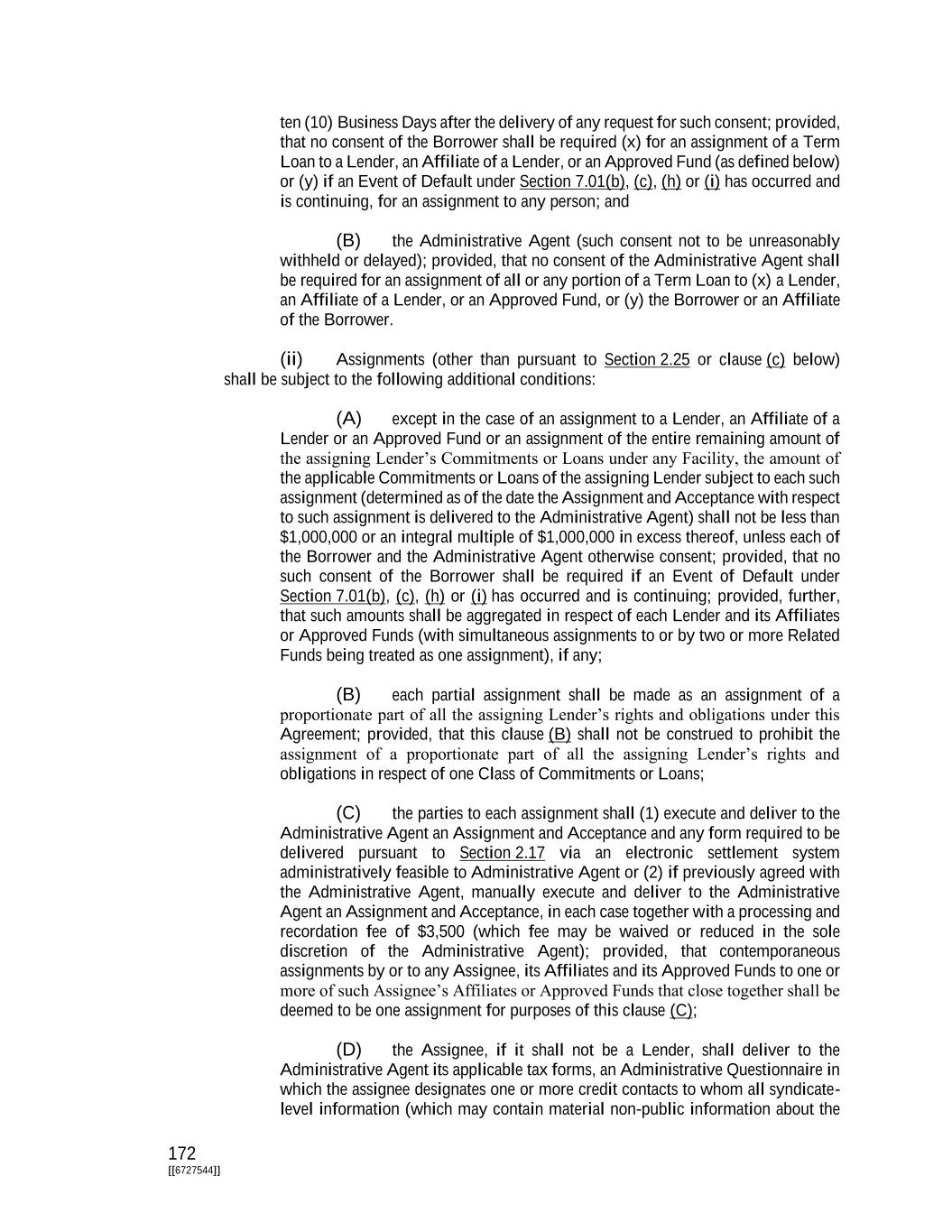 172 [[6727544]] ten (10) Business Days after the delivery of any request for such consent; provided, that no consent of the Borrower shall be required (x) for an assignment of a Term Loan to a Lender, an Affiliate of a Lender, or an Approved Fund (as defined below) or (y) if an Event of Default under Section 7.01(b), (c), (h) or (i) has occurred and is continuing, for an assignment to any person; and (B) the Administrative Agent (such consent not to be unreasonably withheld or delayed); provided, that no consent of the Administrative Agent shall be required for an assignment of all or any portion of a Term Loan to (x) a Lender, an Affiliate of a Lender, or an Approved Fund, or (y) the Borrower or an Affiliate of the Borrower. (ii) Assignments (other than pursuant to Section 2.25 or clause (c) below) shall be subject to the following additional conditions: (A) except in the case of an assignment to a Lender, an Affiliate of a Lender or an Approved Fund or an assignment of the entire remaining amount of the assigning Lender’s Commitments or Loans under any Facility, the amount of the applicable Commitments or Loans of the assigning Lender subject to each such assignment (determined as of the date the Assignment and Acceptance with respect to such assignment is delivered to the Administrative Agent) shall not be less than $1,000,000 or an integral multiple of $1,000,000 in excess thereof, unless each of the Borrower and the Administrative Agent otherwise consent; provided, that no such consent of the Borrower shall be required if an Event of Default under Section 7.01(b), (c), (h) or (i) has occurred and is continuing; provided, further, that such amounts shall be aggregated in respect of each Lender and its Affiliates or Approved Funds (with simultaneous assignments to or by two or more Related Funds being treated as one assignment), if any; (B) each partial assignment shall be made as an assignment of a proportionate part of all the assigning Lender’s rights and obligations under this Agreement; provided, that this clause (B) shall not be construed to prohibit the assignment of a proportionate part of all the assigning Lender’s rights and obligations in respect of one Class of Commitments or Loans; (C) the parties to each assignment shall (1) execute and deliver to the Administrative Agent an Assignment and Acceptance and any form required to be delivered pursuant to Section 2.17 via an electronic settlement system administratively feasible to Administrative Agent or (2) if previously agreed with the Administrative Agent, manually execute and deliver to the Administrative Agent an Assignment and Acceptance, in each case together with a processing and recordation fee of $3,500 (which fee may be waived or reduced in the sole discretion of the Administrative Agent); provided, that contemporaneous assignments by or to any Assignee, its Affiliates and its Approved Funds to one or more of such Assignee’s Affiliates or Approved Funds that close together shall be deemed to be one assignment for purposes of this clause (C); (D) the Assignee, if it shall not be a Lender, shall deliver to the Administrative Agent its applicable tax forms, an Administrative Questionnaire in which the assignee designates one or more credit contacts to whom all syndicate- level information (which may contain material non-public information about the