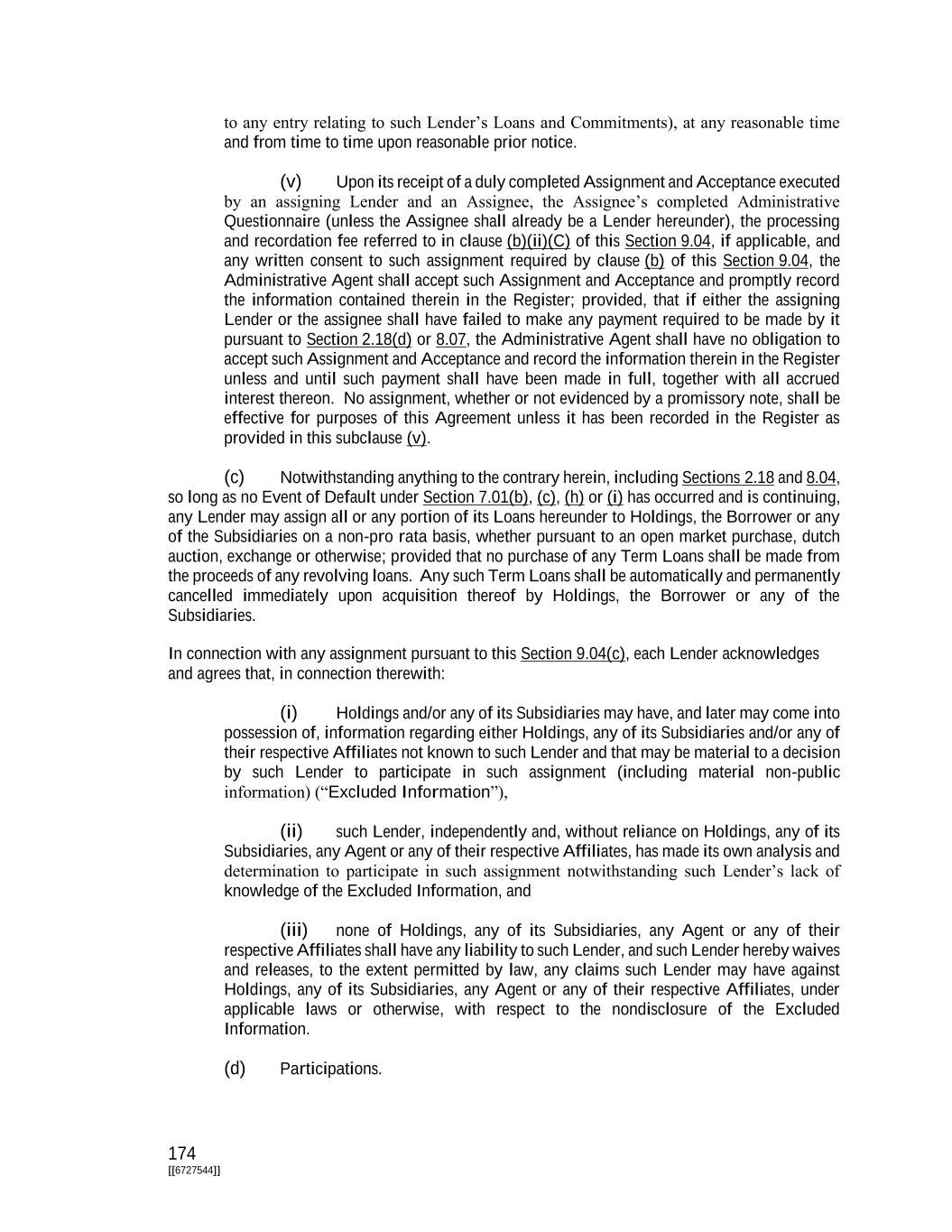 174 [[6727544]] to any entry relating to such Lender’s Loans and Commitments), at any reasonable time and from time to time upon reasonable prior notice. (v) Upon its receipt of a duly completed Assignment and Acceptance executed by an assigning Lender and an Assignee, the Assignee’s completed Administrative Questionnaire (unless the Assignee shall already be a Lender hereunder), the processing and recordation fee referred to in clause (b)(ii)(C) of this Section 9.04, if applicable, and any written consent to such assignment required by clause (b) of this Section 9.04, the Administrative Agent shall accept such Assignment and Acceptance and promptly record the information contained therein in the Register; provided, that if either the assigning Lender or the assignee shall have failed to make any payment required to be made by it pursuant to Section 2.18(d) or 8.07, the Administrative Agent shall have no obligation to accept such Assignment and Acceptance and record the information therein in the Register unless and until such payment shall have been made in full, together with all accrued interest thereon. No assignment, whether or not evidenced by a promissory note, shall be effective for purposes of this Agreement unless it has been recorded in the Register as provided in this subclause (v). (c) Notwithstanding anything to the contrary herein, including Sections 2.18 and 8.04, so long as no Event of Default under Section 7.01(b), (c), (h) or (i) has occurred and is continuing, any Lender may assign all or any portion of its Loans hereunder to Holdings, the Borrower or any of the Subsidiaries on a non-pro rata basis, whether pursuant to an open market purchase, dutch auction, exchange or otherwise; provided that no purchase of any Term Loans shall be made from the proceeds of any revolving loans. Any such Term Loans shall be automatically and permanently cancelled immediately upon acquisition thereof by Holdings, the Borrower or any of the Subsidiaries. In connection with any assignment pursuant to this Section 9.04(c), each Lender acknowledges and agrees that, in connection therewith: (i) Holdings and/or any of its Subsidiaries may have, and later may come into possession of, information regarding either Holdings, any of its Subsidiaries and/or any of their respective Affiliates not known to such Lender and that may be material to a decision by such Lender to participate in such assignment (including material non-public information) (“Excluded Information”), (ii) such Lender, independently and, without reliance on Holdings, any of its Subsidiaries, any Agent or any of their respective Affiliates, has made its own analysis and determination to participate in such assignment notwithstanding such Lender’s lack of knowledge of the Excluded Information, and (iii) none of Holdings, any of its Subsidiaries, any Agent or any of their respective Affiliates shall have any liability to such Lender, and such Lender hereby waives and releases, to the extent permitted by law, any claims such Lender may have against Holdings, any of its Subsidiaries, any Agent or any of their respective Affiliates, under applicable laws or otherwise, with respect to the nondisclosure of the Excluded Information. (d) Participations.