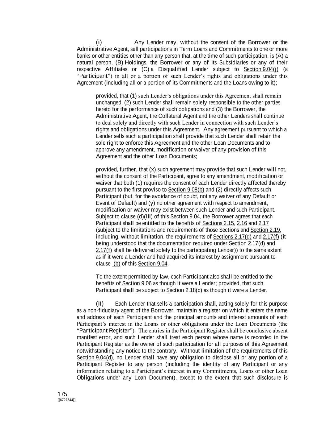 175 [[6727544]] (i) Any Lender may, without the consent of the Borrower or the Administrative Agent, sell participations in Term Loans and Commitments to one or more banks or other entities other than any person that, at the time of such participation, is (A) a natural person, (B) Holdings, the Borrower or any of its Subsidiaries or any of their respective Affiliates or (C) a Disqualified Lender subject to Section 9.04(j) (a “Participant”) in all or a portion of such Lender’s rights and obligations under this Agreement (including all or a portion of its Commitments and the Loans owing to it); provided, that (1) such Lender’s obligations under this Agreement shall remain unchanged, (2) such Lender shall remain solely responsible to the other parties hereto for the performance of such obligations and (3) the Borrower, the Administrative Agent, the Collateral Agent and the other Lenders shall continue to deal solely and directly with such Lender in connection with such Lender’s rights and obligations under this Agreement. Any agreement pursuant to which a Lender sells such a participation shall provide that such Lender shall retain the sole right to enforce this Agreement and the other Loan Documents and to approve any amendment, modification or waiver of any provision of this Agreement and the other Loan Documents; provided, further, that (x) such agreement may provide that such Lender will not, without the consent of the Participant, agree to any amendment, modification or waiver that both (1) requires the consent of each Lender directly affected thereby pursuant to the first proviso to Section 9.08(b) and (2) directly affects such Participant (but, for the avoidance of doubt, not any waiver of any Default or Event of Default) and (y) no other agreement with respect to amendment, modification or waiver may exist between such Lender and such Participant. Subject to clause (d)(iii) of this Section 9.04, the Borrower agrees that each Participant shall be entitled to the benefits of Sections 2.15, 2.16 and 2.17 (subject to the limitations and requirements of those Sections and Section 2.19, including, without limitation, the requirements of Sections 2.17(d) and 2.17(f) (it being understood that the documentation required under Section 2.17(d) and 2.17(f) shall be delivered solely to the participating Lender)) to the same extent as if it were a Lender and had acquired its interest by assignment pursuant to clause (b) of this Section 9.04. To the extent permitted by law, each Participant also shall be entitled to the benefits of Section 9.06 as though it were a Lender; provided, that such Participant shall be subject to Section 2.18(c) as though it were a Lender. (ii) Each Lender that sells a participation shall, acting solely for this purpose as a non-fiduciary agent of the Borrower, maintain a register on which it enters the name and address of each Participant and the principal amounts and interest amounts of each Participant’s interest in the Loans or other obligations under the Loan Documents (the “Participant Register”). The entries in the Participant Register shall be conclusive absent manifest error, and such Lender shall treat each person whose name is recorded in the Participant Register as the owner of such participation for all purposes of this Agreement notwithstanding any notice to the contrary. Without limitation of the requirements of this Section 9.04(d), no Lender shall have any obligation to disclose all or any portion of a Participant Register to any person (including the identity of any Participant or any information relating to a Participant’s interest in any Commitments, Loans or other Loan Obligations under any Loan Document), except to the extent that such disclosure is