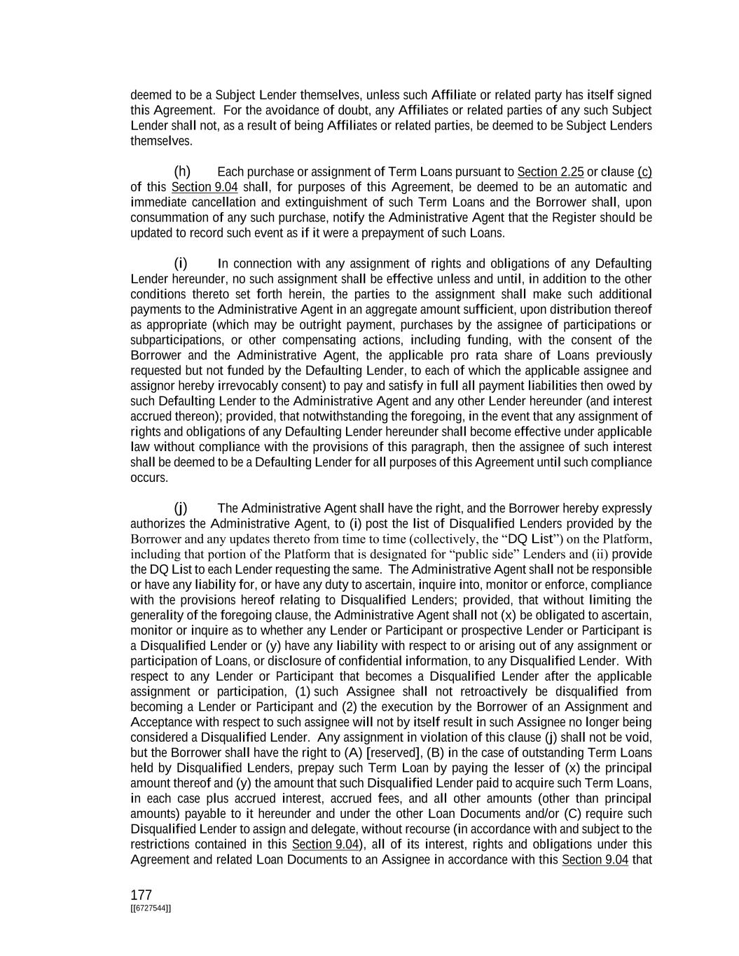 177 [[6727544]] deemed to be a Subject Lender themselves, unless such Affiliate or related party has itself signed this Agreement. For the avoidance of doubt, any Affiliates or related parties of any such Subject Lender shall not, as a result of being Affiliates or related parties, be deemed to be Subject Lenders themselves. (h) Each purchase or assignment of Term Loans pursuant to Section 2.25 or clause (c) of this Section 9.04 shall, for purposes of this Agreement, be deemed to be an automatic and immediate cancellation and extinguishment of such Term Loans and the Borrower shall, upon consummation of any such purchase, notify the Administrative Agent that the Register should be updated to record such event as if it were a prepayment of such Loans. (i) In connection with any assignment of rights and obligations of any Defaulting Lender hereunder, no such assignment shall be effective unless and until, in addition to the other conditions thereto set forth herein, the parties to the assignment shall make such additional payments to the Administrative Agent in an aggregate amount sufficient, upon distribution thereof as appropriate (which may be outright payment, purchases by the assignee of participations or subparticipations, or other compensating actions, including funding, with the consent of the Borrower and the Administrative Agent, the applicable pro rata share of Loans previously requested but not funded by the Defaulting Lender, to each of which the applicable assignee and assignor hereby irrevocably consent) to pay and satisfy in full all payment liabilities then owed by such Defaulting Lender to the Administrative Agent and any other Lender hereunder (and interest accrued thereon); provided, that notwithstanding the foregoing, in the event that any assignment of rights and obligations of any Defaulting Lender hereunder shall become effective under applicable law without compliance with the provisions of this paragraph, then the assignee of such interest shall be deemed to be a Defaulting Lender for all purposes of this Agreement until such compliance occurs. (j) The Administrative Agent shall have the right, and the Borrower hereby expressly authorizes the Administrative Agent, to (i) post the list of Disqualified Lenders provided by the Borrower and any updates thereto from time to time (collectively, the “DQ List”) on the Platform, including that portion of the Platform that is designated for “public side” Lenders and (ii) provide the DQ List to each Lender requesting the same. The Administrative Agent shall not be responsible or have any liability for, or have any duty to ascertain, inquire into, monitor or enforce, compliance with the provisions hereof relating to Disqualified Lenders; provided, that without limiting the generality of the foregoing clause, the Administrative Agent shall not (x) be obligated to ascertain, monitor or inquire as to whether any Lender or Participant or prospective Lender or Participant is a Disqualified Lender or (y) have any liability with respect to or arising out of any assignment or participation of Loans, or disclosure of confidential information, to any Disqualified Lender. With respect to any Lender or Participant that becomes a Disqualified Lender after the applicable assignment or participation, (1) such Assignee shall not retroactively be disqualified from becoming a Lender or Participant and (2) the execution by the Borrower of an Assignment and Acceptance with respect to such assignee will not by itself result in such Assignee no longer being considered a Disqualified Lender. Any assignment in violation of this clause (j) shall not be void, but the Borrower shall have the right to (A) [reserved], (B) in the case of outstanding Term Loans held by Disqualified Lenders, prepay such Term Loan by paying the lesser of (x) the principal amount thereof and (y) the amount that such Disqualified Lender paid to acquire such Term Loans, in each case plus accrued interest, accrued fees, and all other amounts (other than principal amounts) payable to it hereunder and under the other Loan Documents and/or (C) require such Disqualified Lender to assign and delegate, without recourse (in accordance with and subject to the restrictions contained in this Section 9.04), all of its interest, rights and obligations under this Agreement and related Loan Documents to an Assignee in accordance with this Section 9.04 that