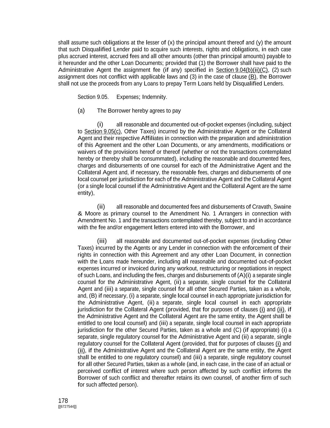 178 [[6727544]] shall assume such obligations at the lesser of (x) the principal amount thereof and (y) the amount that such Disqualified Lender paid to acquire such interests, rights and obligations, in each case plus accrued interest, accrued fees and all other amounts (other than principal amounts) payable to it hereunder and the other Loan Documents; provided that (1) the Borrower shall have paid to the Administrative Agent the assignment fee (if any) specified in Section 9.04(b)(ii)(C), (2) such assignment does not conflict with applicable laws and (3) in the case of clause (B), the Borrower shall not use the proceeds from any Loans to prepay Term Loans held by Disqualified Lenders. Section 9.05. Expenses; Indemnity. (a) The Borrower hereby agrees to pay (i) all reasonable and documented out-of-pocket expenses (including, subject to Section 9.05(c), Other Taxes) incurred by the Administrative Agent or the Collateral Agent and their respective Affiliates in connection with the preparation and administration of this Agreement and the other Loan Documents, or any amendments, modifications or waivers of the provisions hereof or thereof (whether or not the transactions contemplated hereby or thereby shall be consummated), including the reasonable and documented fees, charges and disbursements of one counsel for each of the Administrative Agent and the Collateral Agent and, if necessary, the reasonable fees, charges and disbursements of one local counsel per jurisdiction for each of the Administrative Agent and the Collateral Agent (or a single local counsel if the Administrative Agent and the Collateral Agent are the same entity), (ii) all reasonable and documented fees and disbursements of Cravath, Swaine & Moore as primary counsel to the Amendment No. 1 Arrangers in connection with Amendment No. 1 and the transactions contemplated thereby, subject to and in accordance with the fee and/or engagement letters entered into with the Borrower, and (iii) all reasonable and documented out-of-pocket expenses (including Other Taxes) incurred by the Agents or any Lender in connection with the enforcement of their rights in connection with this Agreement and any other Loan Document, in connection with the Loans made hereunder, including all reasonable and documented out-of-pocket expenses incurred or invoiced during any workout, restructuring or negotiations in respect of such Loans, and including the fees, charges and disbursements of (A)(i) a separate single counsel for the Administrative Agent, (ii) a separate, single counsel for the Collateral Agent and (iii) a separate, single counsel for all other Secured Parties, taken as a whole, and, (B) if necessary, (i) a separate, single local counsel in each appropriate jurisdiction for the Administrative Agent, (ii) a separate, single local counsel in each appropriate jurisdiction for the Collateral Agent (provided, that for purposes of clauses (i) and (ii), if the Administrative Agent and the Collateral Agent are the same entity, the Agent shall be entitled to one local counsel) and (iii) a separate, single local counsel in each appropriate jurisdiction for the other Secured Parties, taken as a whole and (C) (if appropriate) (i) a separate, single regulatory counsel for the Administrative Agent and (ii) a separate, single regulatory counsel for the Collateral Agent (provided, that for purposes of clauses (i) and (ii), if the Administrative Agent and the Collateral Agent are the same entity, the Agent shall be entitled to one regulatory counsel) and (iii) a separate, single regulatory counsel for all other Secured Parties, taken as a whole (and, in each case, in the case of an actual or perceived conflict of interest where such person affected by such conflict informs the Borrower of such conflict and thereafter retains its own counsel, of another firm of such for such affected person).