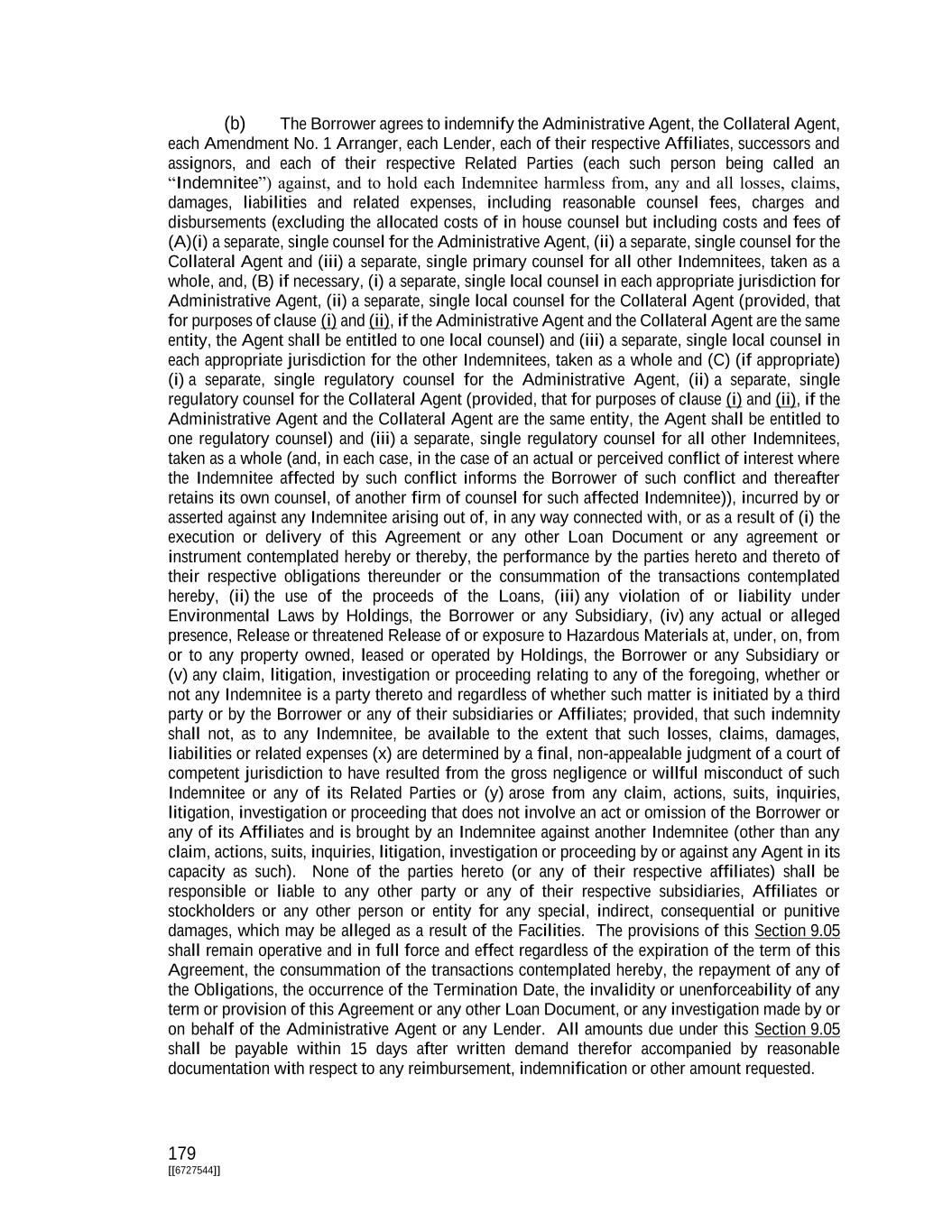 179 [[6727544]] (b) The Borrower agrees to indemnify the Administrative Agent, the Collateral Agent, each Amendment No. 1 Arranger, each Lender, each of their respective Affiliates, successors and assignors, and each of their respective Related Parties (each such person being called an “Indemnitee”) against, and to hold each Indemnitee harmless from, any and all losses, claims, damages, liabilities and related expenses, including reasonable counsel fees, charges and disbursements (excluding the allocated costs of in house counsel but including costs and fees of (A)(i) a separate, single counsel for the Administrative Agent, (ii) a separate, single counsel for the Collateral Agent and (iii) a separate, single primary counsel for all other Indemnitees, taken as a whole, and, (B) if necessary, (i) a separate, single local counsel in each appropriate jurisdiction for Administrative Agent, (ii) a separate, single local counsel for the Collateral Agent (provided, that for purposes of clause (i) and (ii), if the Administrative Agent and the Collateral Agent are the same entity, the Agent shall be entitled to one local counsel) and (iii) a separate, single local counsel in each appropriate jurisdiction for the other Indemnitees, taken as a whole and (C) (if appropriate) (i) a separate, single regulatory counsel for the Administrative Agent, (ii) a separate, single regulatory counsel for the Collateral Agent (provided, that for purposes of clause (i) and (ii), if the Administrative Agent and the Collateral Agent are the same entity, the Agent shall be entitled to one regulatory counsel) and (iii) a separate, single regulatory counsel for all other Indemnitees, taken as a whole (and, in each case, in the case of an actual or perceived conflict of interest where the Indemnitee affected by such conflict informs the Borrower of such conflict and thereafter retains its own counsel, of another firm of counsel for such affected Indemnitee)), incurred by or asserted against any Indemnitee arising out of, in any way connected with, or as a result of (i) the execution or delivery of this Agreement or any other Loan Document or any agreement or instrument contemplated hereby or thereby, the performance by the parties hereto and thereto of their respective obligations thereunder or the consummation of the transactions contemplated hereby, (ii) the use of the proceeds of the Loans, (iii) any violation of or liability under Environmental Laws by Holdings, the Borrower or any Subsidiary, (iv) any actual or alleged presence, Release or threatened Release of or exposure to Hazardous Materials at, under, on, from or to any property owned, leased or operated by Holdings, the Borrower or any Subsidiary or (v) any claim, litigation, investigation or proceeding relating to any of the foregoing, whether or not any Indemnitee is a party thereto and regardless of whether such matter is initiated by a third party or by the Borrower or any of their subsidiaries or Affiliates; provided, that such indemnity shall not, as to any Indemnitee, be available to the extent that such losses, claims, damages, liabilities or related expenses (x) are determined by a final, non-appealable judgment of a court of competent jurisdiction to have resulted from the gross negligence or willful misconduct of such Indemnitee or any of its Related Parties or (y) arose from any claim, actions, suits, inquiries, litigation, investigation or proceeding that does not involve an act or omission of the Borrower or any of its Affiliates and is brought by an Indemnitee against another Indemnitee (other than any claim, actions, suits, inquiries, litigation, investigation or proceeding by or against any Agent in its capacity as such). None of the parties hereto (or any of their respective affiliates) shall be responsible or liable to any other party or any of their respective subsidiaries, Affiliates or stockholders or any other person or entity for any special, indirect, consequential or punitive damages, which may be alleged as a result of the Facilities. The provisions of this Section 9.05 shall remain operative and in full force and effect regardless of the expiration of the term of this Agreement, the consummation of the transactions contemplated hereby, the repayment of any of the Obligations, the occurrence of the Termination Date, the invalidity or unenforceability of any term or provision of this Agreement or any other Loan Document, or any investigation made by or on behalf of the Administrative Agent or any Lender. All amounts due under this Section 9.05 shall be payable within 15 days after written demand therefor accompanied by reasonable documentation with respect to any reimbursement, indemnification or other amount requested.