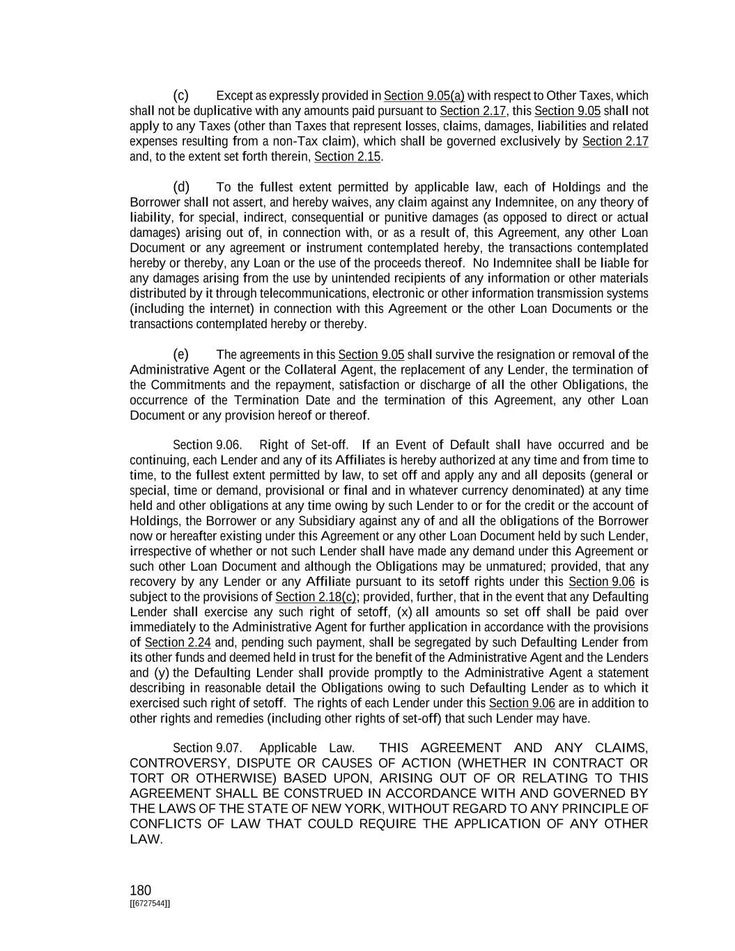 180 [[6727544]] (c) Except as expressly provided in Section 9.05(a) with respect to Other Taxes, which shall not be duplicative with any amounts paid pursuant to Section 2.17, this Section 9.05 shall not apply to any Taxes (other than Taxes that represent losses, claims, damages, liabilities and related expenses resulting from a non-Tax claim), which shall be governed exclusively by Section 2.17 and, to the extent set forth therein, Section 2.15. (d) To the fullest extent permitted by applicable law, each of Holdings and the Borrower shall not assert, and hereby waives, any claim against any Indemnitee, on any theory of liability, for special, indirect, consequential or punitive damages (as opposed to direct or actual damages) arising out of, in connection with, or as a result of, this Agreement, any other Loan Document or any agreement or instrument contemplated hereby, the transactions contemplated hereby or thereby, any Loan or the use of the proceeds thereof. No Indemnitee shall be liable for any damages arising from the use by unintended recipients of any information or other materials distributed by it through telecommunications, electronic or other information transmission systems (including the internet) in connection with this Agreement or the other Loan Documents or the transactions contemplated hereby or thereby. (e) The agreements in this Section 9.05 shall survive the resignation or removal of the Administrative Agent or the Collateral Agent, the replacement of any Lender, the termination of the Commitments and the repayment, satisfaction or discharge of all the other Obligations, the occurrence of the Termination Date and the termination of this Agreement, any other Loan Document or any provision hereof or thereof. Section 9.06. Right of Set-off. If an Event of Default shall have occurred and be continuing, each Lender and any of its Affiliates is hereby authorized at any time and from time to time, to the fullest extent permitted by law, to set off and apply any and all deposits (general or special, time or demand, provisional or final and in whatever currency denominated) at any time held and other obligations at any time owing by such Lender to or for the credit or the account of Holdings, the Borrower or any Subsidiary against any of and all the obligations of the Borrower now or hereafter existing under this Agreement or any other Loan Document held by such Lender, irrespective of whether or not such Lender shall have made any demand under this Agreement or such other Loan Document and although the Obligations may be unmatured; provided, that any recovery by any Lender or any Affiliate pursuant to its setoff rights under this Section 9.06 is subject to the provisions of Section 2.18(c); provided, further, that in the event that any Defaulting Lender shall exercise any such right of setoff, (x) all amounts so set off shall be paid over immediately to the Administrative Agent for further application in accordance with the provisions of Section 2.24 and, pending such payment, shall be segregated by such Defaulting Lender from its other funds and deemed held in trust for the benefit of the Administrative Agent and the Lenders and (y) the Defaulting Lender shall provide promptly to the Administrative Agent a statement describing in reasonable detail the Obligations owing to such Defaulting Lender as to which it exercised such right of setoff. The rights of each Lender under this Section 9.06 are in addition to other rights and remedies (including other rights of set-off) that such Lender may have. Section 9.07. Applicable Law. THIS AGREEMENT AND ANY CLAIMS, CONTROVERSY, DISPUTE OR CAUSES OF ACTION (WHETHER IN CONTRACT OR TORT OR OTHERWISE) BASED UPON, ARISING OUT OF OR RELATING TO THIS AGREEMENT SHALL BE CONSTRUED IN ACCORDANCE WITH AND GOVERNED BY THE LAWS OF THE STATE OF NEW YORK, WITHOUT REGARD TO ANY PRINCIPLE OF CONFLICTS OF LAW THAT COULD REQUIRE THE APPLICATION OF ANY OTHER LAW.