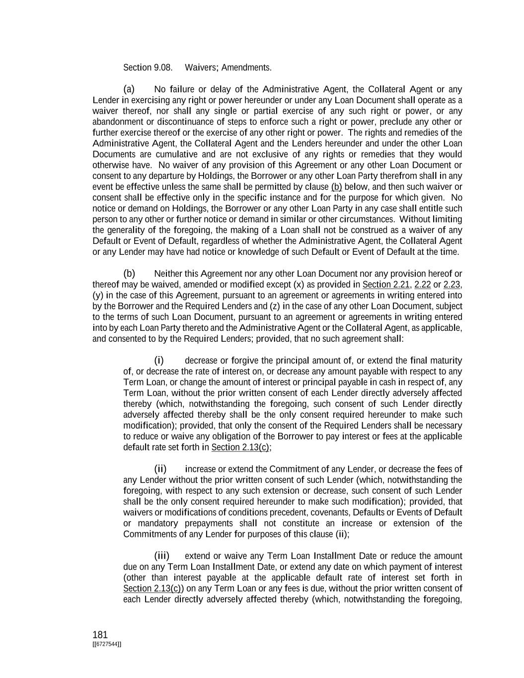 181 [[6727544]] Section 9.08. Waivers; Amendments. (a) No failure or delay of the Administrative Agent, the Collateral Agent or any Lender in exercising any right or power hereunder or under any Loan Document shall operate as a waiver thereof, nor shall any single or partial exercise of any such right or power, or any abandonment or discontinuance of steps to enforce such a right or power, preclude any other or further exercise thereof or the exercise of any other right or power. The rights and remedies of the Administrative Agent, the Collateral Agent and the Lenders hereunder and under the other Loan Documents are cumulative and are not exclusive of any rights or remedies that they would otherwise have. No waiver of any provision of this Agreement or any other Loan Document or consent to any departure by Holdings, the Borrower or any other Loan Party therefrom shall in any event be effective unless the same shall be permitted by clause (b) below, and then such waiver or consent shall be effective only in the specific instance and for the purpose for which given. No notice or demand on Holdings, the Borrower or any other Loan Party in any case shall entitle such person to any other or further notice or demand in similar or other circumstances. Without limiting the generality of the foregoing, the making of a Loan shall not be construed as a waiver of any Default or Event of Default, regardless of whether the Administrative Agent, the Collateral Agent or any Lender may have had notice or knowledge of such Default or Event of Default at the time. (b) Neither this Agreement nor any other Loan Document nor any provision hereof or thereof may be waived, amended or modified except (x) as provided in Section 2.21, 2.22 or 2.23, (y) in the case of this Agreement, pursuant to an agreement or agreements in writing entered into by the Borrower and the Required Lenders and (z) in the case of any other Loan Document, subject to the terms of such Loan Document, pursuant to an agreement or agreements in writing entered into by each Loan Party thereto and the Administrative Agent or the Collateral Agent, as applicable, and consented to by the Required Lenders; provided, that no such agreement shall: (i) decrease or forgive the principal amount of, or extend the final maturity of, or decrease the rate of interest on, or decrease any amount payable with respect to any Term Loan, or change the amount of interest or principal payable in cash in respect of, any Term Loan, without the prior written consent of each Lender directly adversely affected thereby (which, notwithstanding the foregoing, such consent of such Lender directly adversely affected thereby shall be the only consent required hereunder to make such modification); provided, that only the consent of the Required Lenders shall be necessary to reduce or waive any obligation of the Borrower to pay interest or fees at the applicable default rate set forth in Section 2.13(c); (ii) increase or extend the Commitment of any Lender, or decrease the fees of any Lender without the prior written consent of such Lender (which, notwithstanding the foregoing, with respect to any such extension or decrease, such consent of such Lender shall be the only consent required hereunder to make such modification); provided, that waivers or modifications of conditions precedent, covenants, Defaults or Events of Default or mandatory prepayments shall not constitute an increase or extension of the Commitments of any Lender for purposes of this clause (ii); (iii) extend or waive any Term Loan Installment Date or reduce the amount due on any Term Loan Installment Date, or extend any date on which payment of interest (other than interest payable at the applicable default rate of interest set forth in Section 2.13(c)) on any Term Loan or any fees is due, without the prior written consent of each Lender directly adversely affected thereby (which, notwithstanding the foregoing,