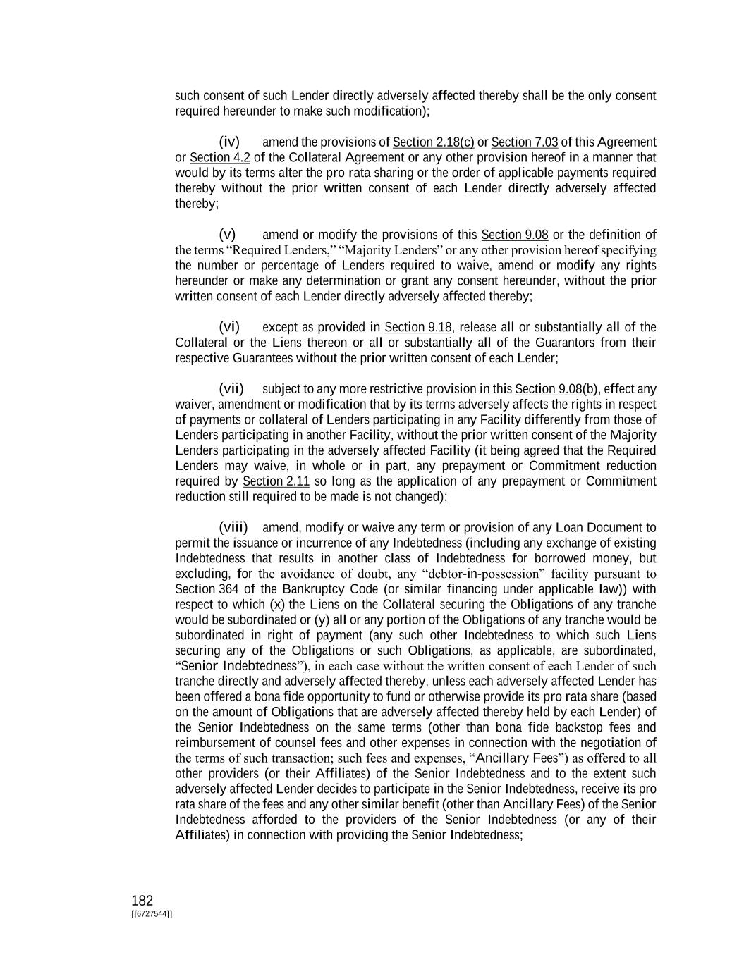 182 [[6727544]] such consent of such Lender directly adversely affected thereby shall be the only consent required hereunder to make such modification); (iv) amend the provisions of Section 2.18(c) or Section 7.03 of this Agreement or Section 4.2 of the Collateral Agreement or any other provision hereof in a manner that would by its terms alter the pro rata sharing or the order of applicable payments required thereby without the prior written consent of each Lender directly adversely affected thereby; (v) amend or modify the provisions of this Section 9.08 or the definition of the terms “Required Lenders,” “Majority Lenders” or any other provision hereof specifying the number or percentage of Lenders required to waive, amend or modify any rights hereunder or make any determination or grant any consent hereunder, without the prior written consent of each Lender directly adversely affected thereby; (vi) except as provided in Section 9.18, release all or substantially all of the Collateral or the Liens thereon or all or substantially all of the Guarantors from their respective Guarantees without the prior written consent of each Lender; (vii) subject to any more restrictive provision in this Section 9.08(b), effect any waiver, amendment or modification that by its terms adversely affects the rights in respect of payments or collateral of Lenders participating in any Facility differently from those of Lenders participating in another Facility, without the prior written consent of the Majority Lenders participating in the adversely affected Facility (it being agreed that the Required Lenders may waive, in whole or in part, any prepayment or Commitment reduction required by Section 2.11 so long as the application of any prepayment or Commitment reduction still required to be made is not changed); (viii) amend, modify or waive any term or provision of any Loan Document to permit the issuance or incurrence of any Indebtedness (including any exchange of existing Indebtedness that results in another class of Indebtedness for borrowed money, but excluding, for the avoidance of doubt, any “debtor-in-possession” facility pursuant to Section 364 of the Bankruptcy Code (or similar financing under applicable law)) with respect to which (x) the Liens on the Collateral securing the Obligations of any tranche would be subordinated or (y) all or any portion of the Obligations of any tranche would be subordinated in right of payment (any such other Indebtedness to which such Liens securing any of the Obligations or such Obligations, as applicable, are subordinated, “Senior Indebtedness”), in each case without the written consent of each Lender of such tranche directly and adversely affected thereby, unless each adversely affected Lender has been offered a bona fide opportunity to fund or otherwise provide its pro rata share (based on the amount of Obligations that are adversely affected thereby held by each Lender) of the Senior Indebtedness on the same terms (other than bona fide backstop fees and reimbursement of counsel fees and other expenses in connection with the negotiation of the terms of such transaction; such fees and expenses, “Ancillary Fees”) as offered to all other providers (or their Affiliates) of the Senior Indebtedness and to the extent such adversely affected Lender decides to participate in the Senior Indebtedness, receive its pro rata share of the fees and any other similar benefit (other than Ancillary Fees) of the Senior Indebtedness afforded to the providers of the Senior Indebtedness (or any of their Affiliates) in connection with providing the Senior Indebtedness;