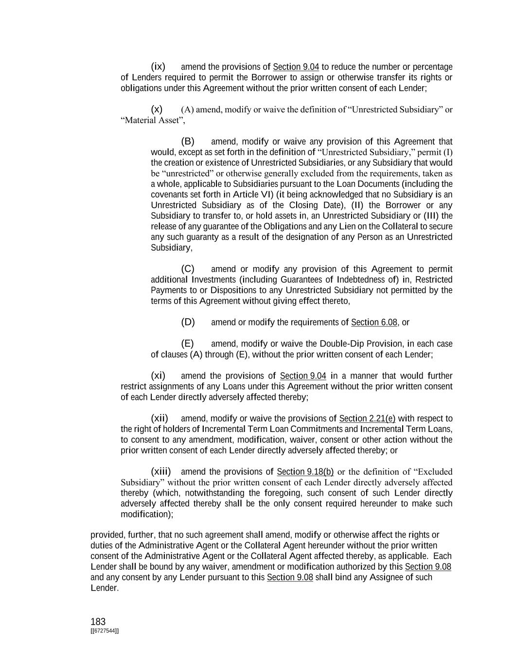 183 [[6727544]] (ix) amend the provisions of Section 9.04 to reduce the number or percentage of Lenders required to permit the Borrower to assign or otherwise transfer its rights or obligations under this Agreement without the prior written consent of each Lender; (x) (A) amend, modify or waive the definition of “Unrestricted Subsidiary” or “Material Asset”, (B) amend, modify or waive any provision of this Agreement that would, except as set forth in the definition of “Unrestricted Subsidiary,” permit (I) the creation or existence of Unrestricted Subsidiaries, or any Subsidiary that would be “unrestricted” or otherwise generally excluded from the requirements, taken as a whole, applicable to Subsidiaries pursuant to the Loan Documents (including the covenants set forth in Article VI) (it being acknowledged that no Subsidiary is an Unrestricted Subsidiary as of the Closing Date), (II) the Borrower or any Subsidiary to transfer to, or hold assets in, an Unrestricted Subsidiary or (III) the release of any guarantee of the Obligations and any Lien on the Collateral to secure any such guaranty as a result of the designation of any Person as an Unrestricted Subsidiary, (C) amend or modify any provision of this Agreement to permit additional Investments (including Guarantees of Indebtedness of) in, Restricted Payments to or Dispositions to any Unrestricted Subsidiary not permitted by the terms of this Agreement without giving effect thereto, (D) amend or modify the requirements of Section 6.08, or (E) amend, modify or waive the Double-Dip Provision, in each case of clauses (A) through (E), without the prior written consent of each Lender; (xi) amend the provisions of Section 9.04 in a manner that would further restrict assignments of any Loans under this Agreement without the prior written consent of each Lender directly adversely affected thereby; (xii) amend, modify or waive the provisions of Section 2.21(e) with respect to the right of holders of Incremental Term Loan Commitments and Incremental Term Loans, to consent to any amendment, modification, waiver, consent or other action without the prior written consent of each Lender directly adversely affected thereby; or (xiii) amend the provisions of Section 9.18(b) or the definition of “Excluded Subsidiary” without the prior written consent of each Lender directly adversely affected thereby (which, notwithstanding the foregoing, such consent of such Lender directly adversely affected thereby shall be the only consent required hereunder to make such modification); provided, further, that no such agreement shall amend, modify or otherwise affect the rights or duties of the Administrative Agent or the Collateral Agent hereunder without the prior written consent of the Administrative Agent or the Collateral Agent affected thereby, as applicable. Each Lender shall be bound by any waiver, amendment or modification authorized by this Section 9.08 and any consent by any Lender pursuant to this Section 9.08 shall bind any Assignee of such Lender.