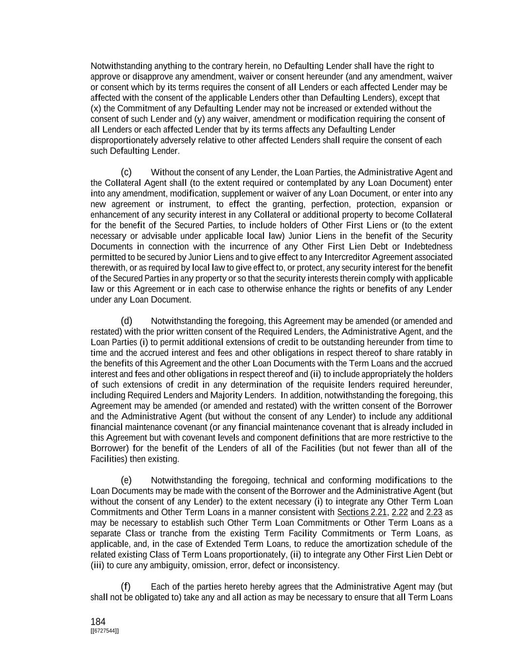 184 [[6727544]] Notwithstanding anything to the contrary herein, no Defaulting Lender shall have the right to approve or disapprove any amendment, waiver or consent hereunder (and any amendment, waiver or consent which by its terms requires the consent of all Lenders or each affected Lender may be affected with the consent of the applicable Lenders other than Defaulting Lenders), except that (x) the Commitment of any Defaulting Lender may not be increased or extended without the consent of such Lender and (y) any waiver, amendment or modification requiring the consent of all Lenders or each affected Lender that by its terms affects any Defaulting Lender disproportionately adversely relative to other affected Lenders shall require the consent of each such Defaulting Lender. (c) Without the consent of any Lender, the Loan Parties, the Administrative Agent and the Collateral Agent shall (to the extent required or contemplated by any Loan Document) enter into any amendment, modification, supplement or waiver of any Loan Document, or enter into any new agreement or instrument, to effect the granting, perfection, protection, expansion or enhancement of any security interest in any Collateral or additional property to become Collateral for the benefit of the Secured Parties, to include holders of Other First Liens or (to the extent necessary or advisable under applicable local law) Junior Liens in the benefit of the Security Documents in connection with the incurrence of any Other First Lien Debt or Indebtedness permitted to be secured by Junior Liens and to give effect to any Intercreditor Agreement associated therewith, or as required by local law to give effect to, or protect, any security interest for the benefit of the Secured Parties in any property or so that the security interests therein comply with applicable law or this Agreement or in each case to otherwise enhance the rights or benefits of any Lender under any Loan Document. (d) Notwithstanding the foregoing, this Agreement may be amended (or amended and restated) with the prior written consent of the Required Lenders, the Administrative Agent, and the Loan Parties (i) to permit additional extensions of credit to be outstanding hereunder from time to time and the accrued interest and fees and other obligations in respect thereof to share ratably in the benefits of this Agreement and the other Loan Documents with the Term Loans and the accrued interest and fees and other obligations in respect thereof and (ii) to include appropriately the holders of such extensions of credit in any determination of the requisite lenders required hereunder, including Required Lenders and Majority Lenders. In addition, notwithstanding the foregoing, this Agreement may be amended (or amended and restated) with the written consent of the Borrower and the Administrative Agent (but without the consent of any Lender) to include any additional financial maintenance covenant (or any financial maintenance covenant that is already included in this Agreement but with covenant levels and component definitions that are more restrictive to the Borrower) for the benefit of the Lenders of all of the Facilities (but not fewer than all of the Facilities) then existing. (e) Notwithstanding the foregoing, technical and conforming modifications to the Loan Documents may be made with the consent of the Borrower and the Administrative Agent (but without the consent of any Lender) to the extent necessary (i) to integrate any Other Term Loan Commitments and Other Term Loans in a manner consistent with Sections 2.21, 2.22 and 2.23 as may be necessary to establish such Other Term Loan Commitments or Other Term Loans as a separate Class or tranche from the existing Term Facility Commitments or Term Loans, as applicable, and, in the case of Extended Term Loans, to reduce the amortization schedule of the related existing Class of Term Loans proportionately, (ii) to integrate any Other First Lien Debt or (iii) to cure any ambiguity, omission, error, defect or inconsistency. (f) Each of the parties hereto hereby agrees that the Administrative Agent may (but shall not be obligated to) take any and all action as may be necessary to ensure that all Term Loans