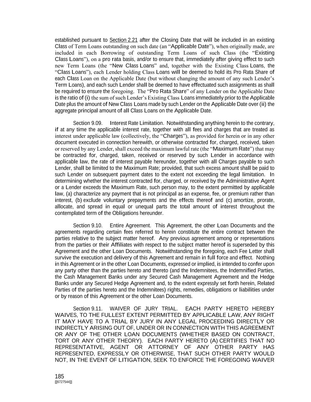 185 [[6727544]] established pursuant to Section 2.21 after the Closing Date that will be included in an existing Class of Term Loans outstanding on such date (an “Applicable Date”), when originally made, are included in each Borrowing of outstanding Term Loans of such Class (the “Existing Class Loans”), on a pro rata basis, and/or to ensure that, immediately after giving effect to such new Term Loans (the “New Class Loans” and, together with the Existing Class Loans, the “Class Loans”), each Lender holding Class Loans will be deemed to hold its Pro Rata Share of each Class Loan on the Applicable Date (but without changing the amount of any such Lender’s Term Loans), and each such Lender shall be deemed to have effectuated such assignments as shall be required to ensure the foregoing. The “Pro Rata Share” of any Lender on the Applicable Date is the ratio of (i) the sum of such Lender’s Existing Class Loans immediately prior to the Applicable Date plus the amount of New Class Loans made by such Lender on the Applicable Date over (ii) the aggregate principal amount of all Class Loans on the Applicable Date. Section 9.09. Interest Rate Limitation. Notwithstanding anything herein to the contrary, if at any time the applicable interest rate, together with all fees and charges that are treated as interest under applicable law (collectively, the “Charges”), as provided for herein or in any other document executed in connection herewith, or otherwise contracted for, charged, received, taken or reserved by any Lender, shall exceed the maximum lawful rate (the “Maximum Rate”) that may be contracted for, charged, taken, received or reserved by such Lender in accordance with applicable law, the rate of interest payable hereunder, together with all Charges payable to such Lender, shall be limited to the Maximum Rate; provided, that such excess amount shall be paid to such Lender on subsequent payment dates to the extent not exceeding the legal limitation. In determining whether the interest contracted for, charged, or received by the Administrative Agent or a Lender exceeds the Maximum Rate, such person may, to the extent permitted by applicable law, (a) characterize any payment that is not principal as an expense, fee, or premium rather than interest, (b) exclude voluntary prepayments and the effects thereof and (c) amortize, prorate, allocate, and spread in equal or unequal parts the total amount of interest throughout the contemplated term of the Obligations hereunder. Section 9.10. Entire Agreement. This Agreement, the other Loan Documents and the agreements regarding certain fees referred to herein constitute the entire contract between the parties relative to the subject matter hereof. Any previous agreement among or representations from the parties or their Affiliates with respect to the subject matter hereof is superseded by this Agreement and the other Loan Documents. Notwithstanding the foregoing, each Fee Letter shall survive the execution and delivery of this Agreement and remain in full force and effect. Nothing in this Agreement or in the other Loan Documents, expressed or implied, is intended to confer upon any party other than the parties hereto and thereto (and the Indemnitees, the Indemnified Parties, the Cash Management Banks under any Secured Cash Management Agreement and the Hedge Banks under any Secured Hedge Agreement and, to the extent expressly set forth herein, Related Parties of the parties hereto and the Indemnitees) rights, remedies, obligations or liabilities under or by reason of this Agreement or the other Loan Documents. Section 9.11. WAIVER OF JURY TRIAL. EACH PARTY HERETO HEREBY WAIVES, TO THE FULLEST EXTENT PERMITTED BY APPLICABLE LAW, ANY RIGHT IT MAY HAVE TO A TRIAL BY JURY IN ANY LEGAL PROCEEDING DIRECTLY OR INDIRECTLY ARISING OUT OF, UNDER OR IN CONNECTION WITH THIS AGREEMENT OR ANY OF THE OTHER LOAN DOCUMENTS (WHETHER BASED ON CONTRACT, TORT OR ANY OTHER THEORY). EACH PARTY HERETO (A) CERTIFIES THAT NO REPRESENTATIVE, AGENT OR ATTORNEY OF ANY OTHER PARTY HAS REPRESENTED, EXPRESSLY OR OTHERWISE, THAT SUCH OTHER PARTY WOULD NOT, IN THE EVENT OF LITIGATION, SEEK TO ENFORCE THE FOREGOING WAIVER