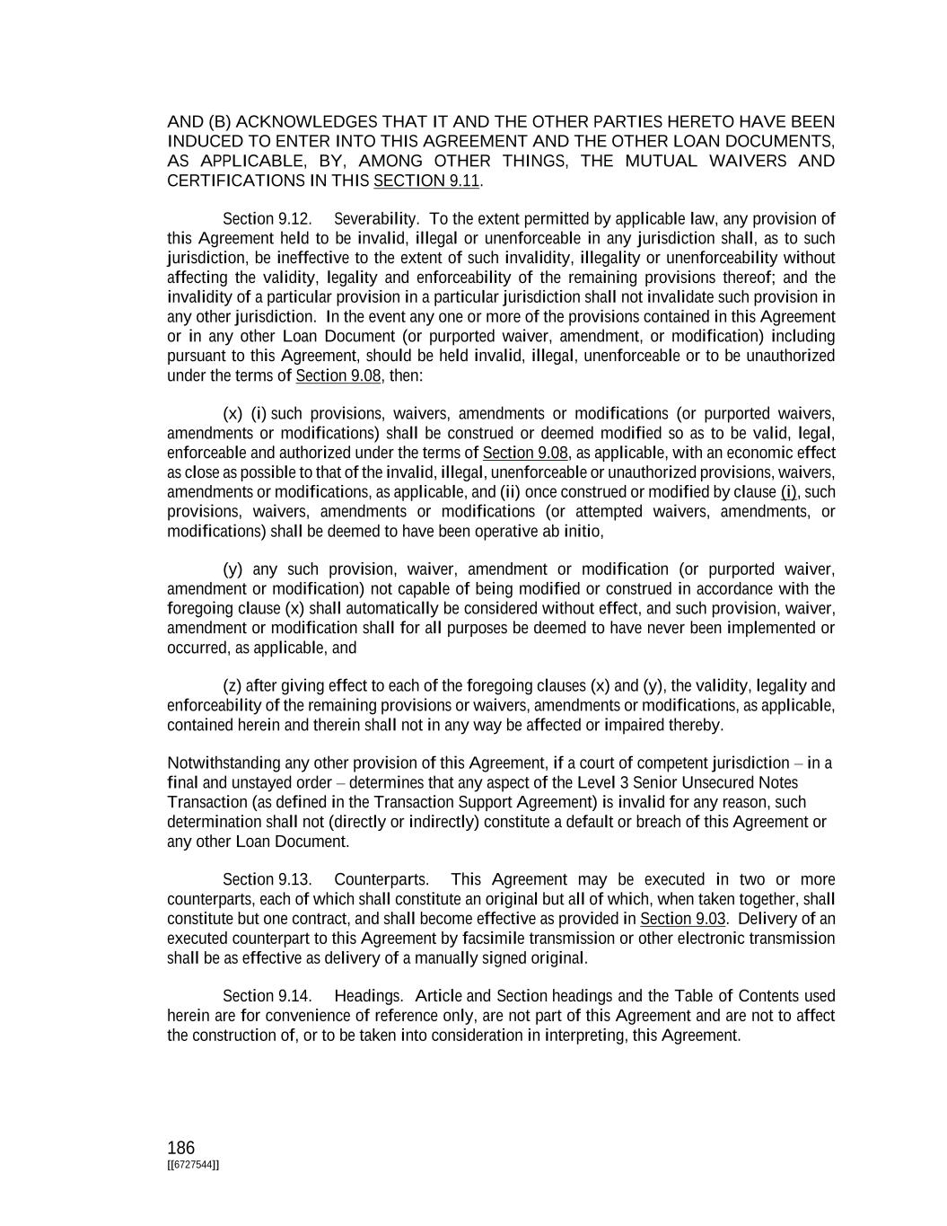 186 [[6727544]] AND (B) ACKNOWLEDGES THAT IT AND THE OTHER PARTIES HERETO HAVE BEEN INDUCED TO ENTER INTO THIS AGREEMENT AND THE OTHER LOAN DOCUMENTS, AS APPLICABLE, BY, AMONG OTHER THINGS, THE MUTUAL WAIVERS AND CERTIFICATIONS IN THIS SECTION 9.11. Section 9.12. Severability. To the extent permitted by applicable law, any provision of this Agreement held to be invalid, illegal or unenforceable in any jurisdiction shall, as to such jurisdiction, be ineffective to the extent of such invalidity, illegality or unenforceability without affecting the validity, legality and enforceability of the remaining provisions thereof; and the invalidity of a particular provision in a particular jurisdiction shall not invalidate such provision in any other jurisdiction. In the event any one or more of the provisions contained in this Agreement or in any other Loan Document (or purported waiver, amendment, or modification) including pursuant to this Agreement, should be held invalid, illegal, unenforceable or to be unauthorized under the terms of Section 9.08, then: (x) (i) such provisions, waivers, amendments or modifications (or purported waivers, amendments or modifications) shall be construed or deemed modified so as to be valid, legal, enforceable and authorized under the terms of Section 9.08, as applicable, with an economic effect as close as possible to that of the invalid, illegal, unenforceable or unauthorized provisions, waivers, amendments or modifications, as applicable, and (ii) once construed or modified by clause (i), such provisions, waivers, amendments or modifications (or attempted waivers, amendments, or modifications) shall be deemed to have been operative ab initio, (y) any such provision, waiver, amendment or modification (or purported waiver, amendment or modification) not capable of being modified or construed in accordance with the foregoing clause (x) shall automatically be considered without effect, and such provision, waiver, amendment or modification shall for all purposes be deemed to have never been implemented or occurred, as applicable, and (z) after giving effect to each of the foregoing clauses (x) and (y), the validity, legality and enforceability of the remaining provisions or waivers, amendments or modifications, as applicable, contained herein and therein shall not in any way be affected or impaired thereby. Notwithstanding any other provision of this Agreement, if a court of competent jurisdiction – in a final and unstayed order – determines that any aspect of the Level 3 Senior Unsecured Notes Transaction (as defined in the Transaction Support Agreement) is invalid for any reason, such determination shall not (directly or indirectly) constitute a default or breach of this Agreement or any other Loan Document. Section 9.13. Counterparts. This Agreement may be executed in two or more counterparts, each of which shall constitute an original but all of which, when taken together, shall constitute but one contract, and shall become effective as provided in Section 9.03. Delivery of an executed counterpart to this Agreement by facsimile transmission or other electronic transmission shall be as effective as delivery of a manually signed original. Section 9.14. Headings. Article and Section headings and the Table of Contents used herein are for convenience of reference only, are not part of this Agreement and are not to affect the construction of, or to be taken into consideration in interpreting, this Agreement.