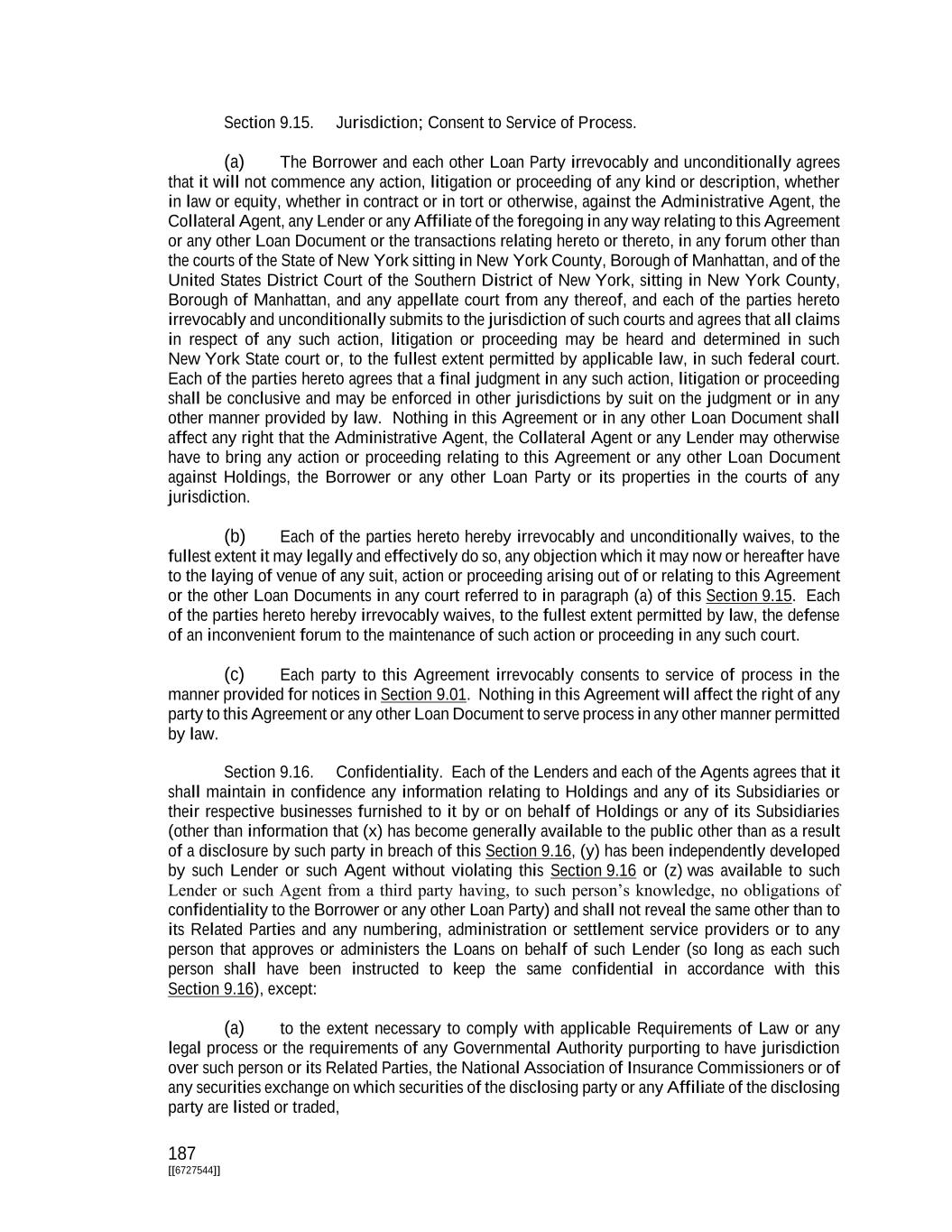 187 [[6727544]] Section 9.15. Jurisdiction; Consent to Service of Process. (a) The Borrower and each other Loan Party irrevocably and unconditionally agrees that it will not commence any action, litigation or proceeding of any kind or description, whether in law or equity, whether in contract or in tort or otherwise, against the Administrative Agent, the Collateral Agent, any Lender or any Affiliate of the foregoing in any way relating to this Agreement or any other Loan Document or the transactions relating hereto or thereto, in any forum other than the courts of the State of New York sitting in New York County, Borough of Manhattan, and of the United States District Court of the Southern District of New York, sitting in New York County, Borough of Manhattan, and any appellate court from any thereof, and each of the parties hereto irrevocably and unconditionally submits to the jurisdiction of such courts and agrees that all claims in respect of any such action, litigation or proceeding may be heard and determined in such New York State court or, to the fullest extent permitted by applicable law, in such federal court. Each of the parties hereto agrees that a final judgment in any such action, litigation or proceeding shall be conclusive and may be enforced in other jurisdictions by suit on the judgment or in any other manner provided by law. Nothing in this Agreement or in any other Loan Document shall affect any right that the Administrative Agent, the Collateral Agent or any Lender may otherwise have to bring any action or proceeding relating to this Agreement or any other Loan Document against Holdings, the Borrower or any other Loan Party or its properties in the courts of any jurisdiction. (b) Each of the parties hereto hereby irrevocably and unconditionally waives, to the fullest extent it may legally and effectively do so, any objection which it may now or hereafter have to the laying of venue of any suit, action or proceeding arising out of or relating to this Agreement or the other Loan Documents in any court referred to in paragraph (a) of this Section 9.15. Each of the parties hereto hereby irrevocably waives, to the fullest extent permitted by law, the defense of an inconvenient forum to the maintenance of such action or proceeding in any such court. (c) Each party to this Agreement irrevocably consents to service of process in the manner provided for notices in Section 9.01. Nothing in this Agreement will affect the right of any party to this Agreement or any other Loan Document to serve process in any other manner permitted by law. Section 9.16. Confidentiality. Each of the Lenders and each of the Agents agrees that it shall maintain in confidence any information relating to Holdings and any of its Subsidiaries or their respective businesses furnished to it by or on behalf of Holdings or any of its Subsidiaries (other than information that (x) has become generally available to the public other than as a result of a disclosure by such party in breach of this Section 9.16, (y) has been independently developed by such Lender or such Agent without violating this Section 9.16 or (z) was available to such Lender or such Agent from a third party having, to such person’s knowledge, no obligations of confidentiality to the Borrower or any other Loan Party) and shall not reveal the same other than to its Related Parties and any numbering, administration or settlement service providers or to any person that approves or administers the Loans on behalf of such Lender (so long as each such person shall have been instructed to keep the same confidential in accordance with this Section 9.16), except: (a) to the extent necessary to comply with applicable Requirements of Law or any legal process or the requirements of any Governmental Authority purporting to have jurisdiction over such person or its Related Parties, the National Association of Insurance Commissioners or of any securities exchange on which securities of the disclosing party or any Affiliate of the disclosing party are listed or traded,