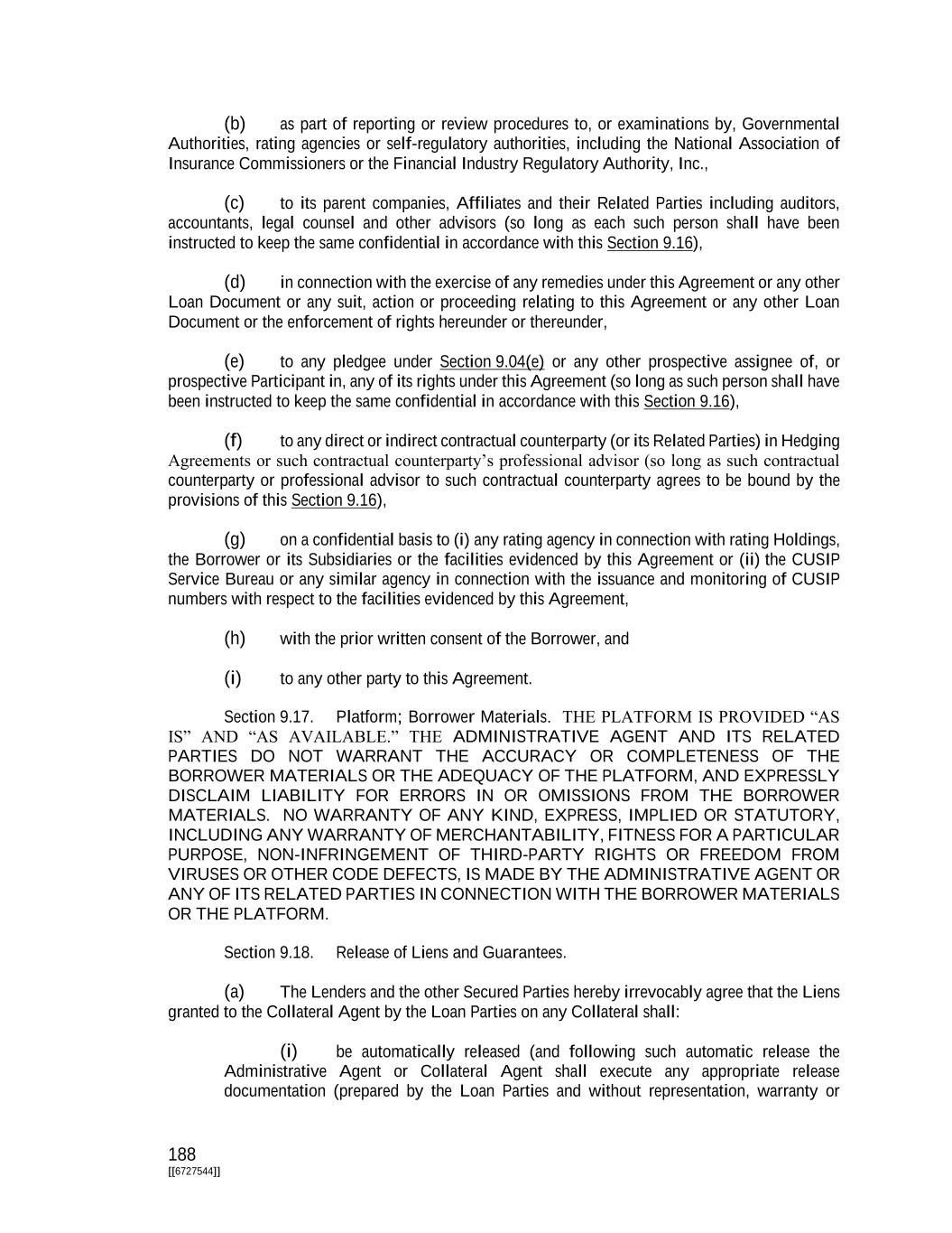 188 [[6727544]] (b) as part of reporting or review procedures to, or examinations by, Governmental Authorities, rating agencies or self-regulatory authorities, including the National Association of Insurance Commissioners or the Financial Industry Regulatory Authority, Inc., (c) to its parent companies, Affiliates and their Related Parties including auditors, accountants, legal counsel and other advisors (so long as each such person shall have been instructed to keep the same confidential in accordance with this Section 9.16), (d) in connection with the exercise of any remedies under this Agreement or any other Loan Document or any suit, action or proceeding relating to this Agreement or any other Loan Document or the enforcement of rights hereunder or thereunder, (e) to any pledgee under Section 9.04(e) or any other prospective assignee of, or prospective Participant in, any of its rights under this Agreement (so long as such person shall have been instructed to keep the same confidential in accordance with this Section 9.16), (f) to any direct or indirect contractual counterparty (or its Related Parties) in Hedging Agreements or such contractual counterparty’s professional advisor (so long as such contractual counterparty or professional advisor to such contractual counterparty agrees to be bound by the provisions of this Section 9.16), (g) on a confidential basis to (i) any rating agency in connection with rating Holdings, the Borrower or its Subsidiaries or the facilities evidenced by this Agreement or (ii) the CUSIP Service Bureau or any similar agency in connection with the issuance and monitoring of CUSIP numbers with respect to the facilities evidenced by this Agreement, (h) with the prior written consent of the Borrower, and (i) to any other party to this Agreement. Section 9.17. Platform; Borrower Materials. THE PLATFORM IS PROVIDED “AS IS” AND “AS AVAILABLE.” THE ADMINISTRATIVE AGENT AND ITS RELATED PARTIES DO NOT WARRANT THE ACCURACY OR COMPLETENESS OF THE BORROWER MATERIALS OR THE ADEQUACY OF THE PLATFORM, AND EXPRESSLY DISCLAIM LIABILITY FOR ERRORS IN OR OMISSIONS FROM THE BORROWER MATERIALS. NO WARRANTY OF ANY KIND, EXPRESS, IMPLIED OR STATUTORY, INCLUDING ANY WARRANTY OF MERCHANTABILITY, FITNESS FOR A PARTICULAR PURPOSE, NON-INFRINGEMENT OF THIRD-PARTY RIGHTS OR FREEDOM FROM VIRUSES OR OTHER CODE DEFECTS, IS MADE BY THE ADMINISTRATIVE AGENT OR ANY OF ITS RELATED PARTIES IN CONNECTION WITH THE BORROWER MATERIALS OR THE PLATFORM. Section 9.18. Release of Liens and Guarantees. (a) The Lenders and the other Secured Parties hereby irrevocably agree that the Liens granted to the Collateral Agent by the Loan Parties on any Collateral shall: (i) be automatically released (and following such automatic release the Administrative Agent or Collateral Agent shall execute any appropriate release documentation (prepared by the Loan Parties and without representation, warranty or
