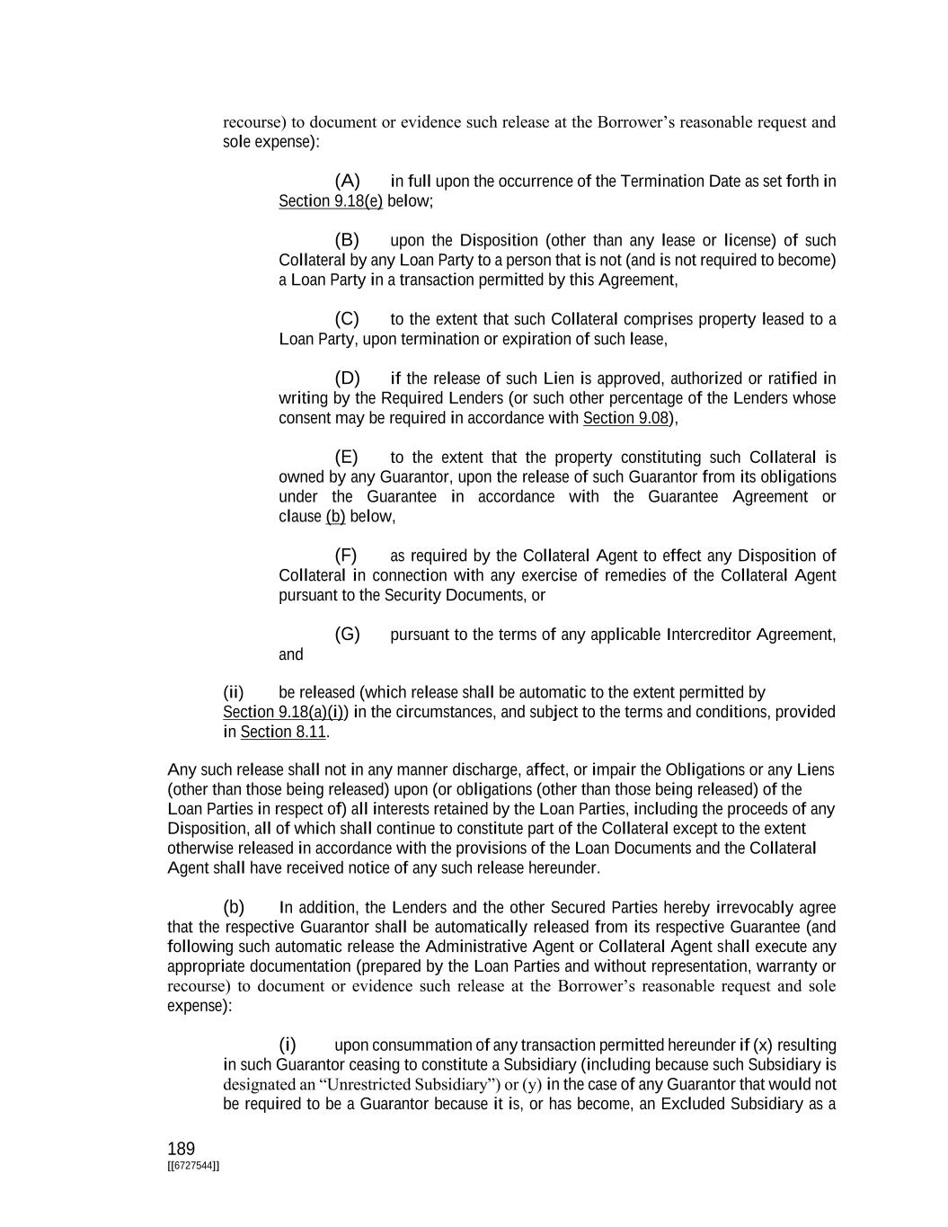 189 [[6727544]] recourse) to document or evidence such release at the Borrower’s reasonable request and sole expense): (A) in full upon the occurrence of the Termination Date as set forth in Section 9.18(e) below; (B) upon the Disposition (other than any lease or license) of such Collateral by any Loan Party to a person that is not (and is not required to become) a Loan Party in a transaction permitted by this Agreement, (C) to the extent that such Collateral comprises property leased to a Loan Party, upon termination or expiration of such lease, (D) if the release of such Lien is approved, authorized or ratified in writing by the Required Lenders (or such other percentage of the Lenders whose consent may be required in accordance with Section 9.08), (E) to the extent that the property constituting such Collateral is owned by any Guarantor, upon the release of such Guarantor from its obligations under the Guarantee in accordance with the Guarantee Agreement or clause (b) below, (F) as required by the Collateral Agent to effect any Disposition of Collateral in connection with any exercise of remedies of the Collateral Agent pursuant to the Security Documents, or (G) pursuant to the terms of any applicable Intercreditor Agreement, and (ii) be released (which release shall be automatic to the extent permitted by Section 9.18(a)(i)) in the circumstances, and subject to the terms and conditions, provided in Section 8.11. Any such release shall not in any manner discharge, affect, or impair the Obligations or any Liens (other than those being released) upon (or obligations (other than those being released) of the Loan Parties in respect of) all interests retained by the Loan Parties, including the proceeds of any Disposition, all of which shall continue to constitute part of the Collateral except to the extent otherwise released in accordance with the provisions of the Loan Documents and the Collateral Agent shall have received notice of any such release hereunder. (b) In addition, the Lenders and the other Secured Parties hereby irrevocably agree that the respective Guarantor shall be automatically released from its respective Guarantee (and following such automatic release the Administrative Agent or Collateral Agent shall execute any appropriate documentation (prepared by the Loan Parties and without representation, warranty or recourse) to document or evidence such release at the Borrower’s reasonable request and sole expense): (i) upon consummation of any transaction permitted hereunder if (x) resulting in such Guarantor ceasing to constitute a Subsidiary (including because such Subsidiary is designated an “Unrestricted Subsidiary”) or (y) in the case of any Guarantor that would not be required to be a Guarantor because it is, or has become, an Excluded Subsidiary as a