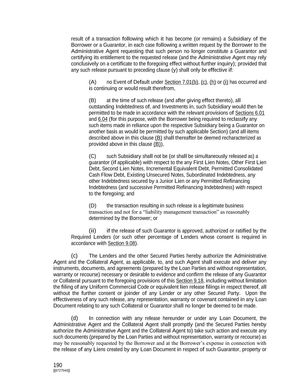 190 [[6727544]] result of a transaction following which it has become (or remains) a Subsidiary of the Borrower or a Guarantor, in each case following a written request by the Borrower to the Administrative Agent requesting that such person no longer constitute a Guarantor and certifying its entitlement to the requested release (and the Administrative Agent may rely conclusively on a certificate to the foregoing effect without further inquiry); provided that any such release pursuant to preceding clause (y) shall only be effective if: (A) no Event of Default under Section 7.01(b), (c), (h) or (i) has occurred and is continuing or would result therefrom, (B) at the time of such release (and after giving effect thereto), all outstanding Indebtedness of, and Investments in, such Subsidiary would then be permitted to be made in accordance with the relevant provisions of Sections 6.01 and 6.04 (for this purpose, with the Borrower being required to reclassify any such items made in reliance upon the respective Subsidiary being a Guarantor on another basis as would be permitted by such applicable Section) (and all items described above in this clause (B) shall thereafter be deemed recharacterized as provided above in this clause (B)), (C) such Subsidiary shall not be (or shall be simultaneously released as) a guarantor (if applicable) with respect to the any First Lien Notes, Other First Lien Debt, Second Lien Notes, Incremental Equivalent Debt, Permitted Consolidated Cash Flow Debt, Existing Unsecured Notes, Subordinated Indebtedness, any other Indebtedness secured by a Junior Lien or any Permitted Refinancing Indebtedness (and successive Permitted Refinancing Indebtedness) with respect to the foregoing; and (D) the transaction resulting in such release is a legitimate business transaction and not for a “liability management transaction” as reasonably determined by the Borrower; or (ii) if the release of such Guarantor is approved, authorized or ratified by the Required Lenders (or such other percentage of Lenders whose consent is required in accordance with Section 9.08). (c) The Lenders and the other Secured Parties hereby authorize the Administrative Agent and the Collateral Agent, as applicable, to, and such Agent shall execute and deliver any instruments, documents, and agreements (prepared by the Loan Parties and without representation, warranty or recourse) necessary or desirable to evidence and confirm the release of any Guarantor or Collateral pursuant to the foregoing provisions of this Section 9.18, including without limitation the filing of any Uniform Commercial Code or equivalent lien release filings in respect thereof, all without the further consent or joinder of any Lender or any other Secured Party. Upon the effectiveness of any such release, any representation, warranty or covenant contained in any Loan Document relating to any such Collateral or Guarantor shall no longer be deemed to be made. (d) In connection with any release hereunder or under any Loan Document, the Administrative Agent and the Collateral Agent shall promptly (and the Secured Parties hereby authorize the Administrative Agent and the Collateral Agent to) take such action and execute any such documents (prepared by the Loan Parties and without representation, warranty or recourse) as may be reasonably requested by the Borrower and at the Borrower’s expense in connection with the release of any Liens created by any Loan Document in respect of such Guarantor, property or