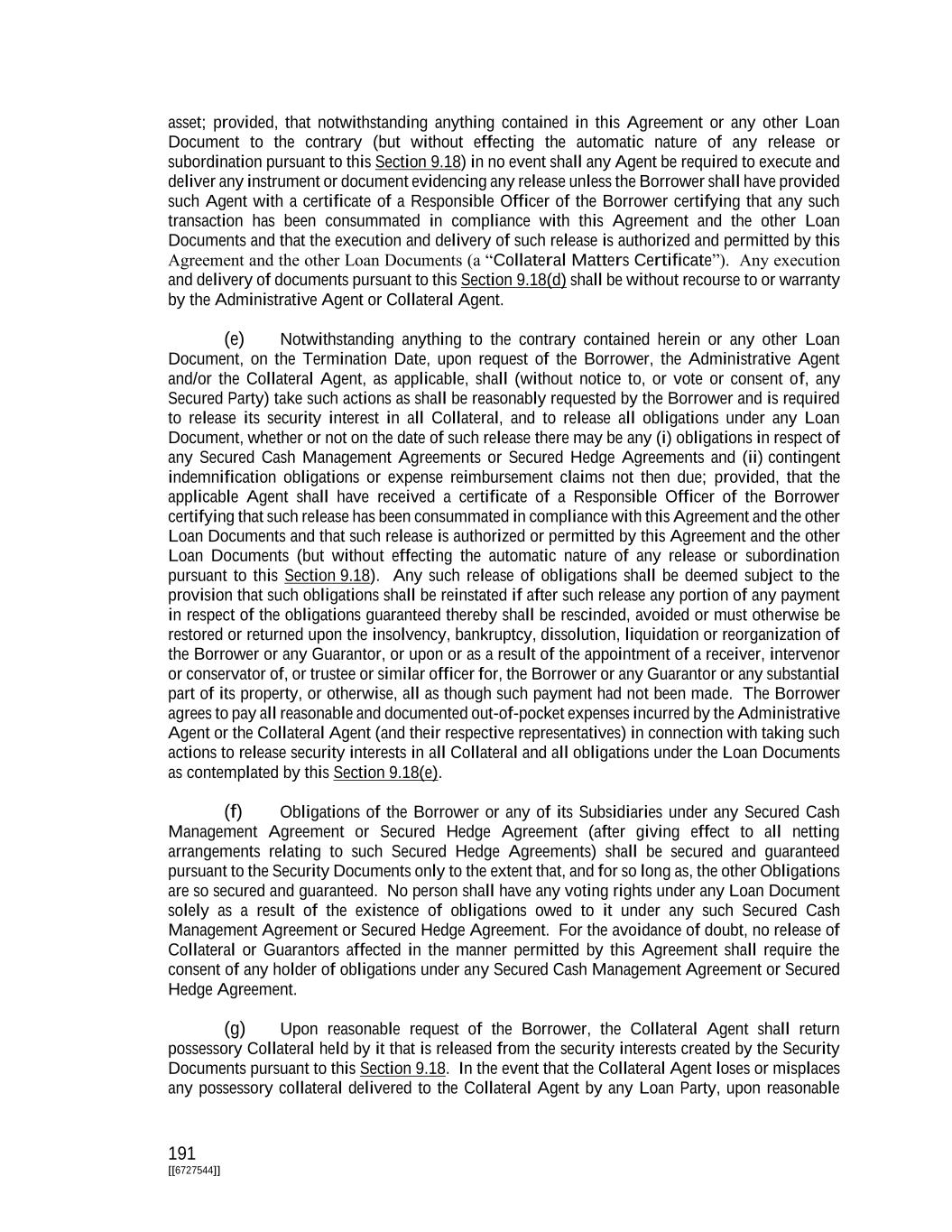 191 [[6727544]] asset; provided, that notwithstanding anything contained in this Agreement or any other Loan Document to the contrary (but without effecting the automatic nature of any release or subordination pursuant to this Section 9.18) in no event shall any Agent be required to execute and deliver any instrument or document evidencing any release unless the Borrower shall have provided such Agent with a certificate of a Responsible Officer of the Borrower certifying that any such transaction has been consummated in compliance with this Agreement and the other Loan Documents and that the execution and delivery of such release is authorized and permitted by this Agreement and the other Loan Documents (a “Collateral Matters Certificate”). Any execution and delivery of documents pursuant to this Section 9.18(d) shall be without recourse to or warranty by the Administrative Agent or Collateral Agent. (e) Notwithstanding anything to the contrary contained herein or any other Loan Document, on the Termination Date, upon request of the Borrower, the Administrative Agent and/or the Collateral Agent, as applicable, shall (without notice to, or vote or consent of, any Secured Party) take such actions as shall be reasonably requested by the Borrower and is required to release its security interest in all Collateral, and to release all obligations under any Loan Document, whether or not on the date of such release there may be any (i) obligations in respect of any Secured Cash Management Agreements or Secured Hedge Agreements and (ii) contingent indemnification obligations or expense reimbursement claims not then due; provided, that the applicable Agent shall have received a certificate of a Responsible Officer of the Borrower certifying that such release has been consummated in compliance with this Agreement and the other Loan Documents and that such release is authorized or permitted by this Agreement and the other Loan Documents (but without effecting the automatic nature of any release or subordination pursuant to this Section 9.18). Any such release of obligations shall be deemed subject to the provision that such obligations shall be reinstated if after such release any portion of any payment in respect of the obligations guaranteed thereby shall be rescinded, avoided or must otherwise be restored or returned upon the insolvency, bankruptcy, dissolution, liquidation or reorganization of the Borrower or any Guarantor, or upon or as a result of the appointment of a receiver, intervenor or conservator of, or trustee or similar officer for, the Borrower or any Guarantor or any substantial part of its property, or otherwise, all as though such payment had not been made. The Borrower agrees to pay all reasonable and documented out-of-pocket expenses incurred by the Administrative Agent or the Collateral Agent (and their respective representatives) in connection with taking such actions to release security interests in all Collateral and all obligations under the Loan Documents as contemplated by this Section 9.18(e). (f) Obligations of the Borrower or any of its Subsidiaries under any Secured Cash Management Agreement or Secured Hedge Agreement (after giving effect to all netting arrangements relating to such Secured Hedge Agreements) shall be secured and guaranteed pursuant to the Security Documents only to the extent that, and for so long as, the other Obligations are so secured and guaranteed. No person shall have any voting rights under any Loan Document solely as a result of the existence of obligations owed to it under any such Secured Cash Management Agreement or Secured Hedge Agreement. For the avoidance of doubt, no release of Collateral or Guarantors affected in the manner permitted by this Agreement shall require the consent of any holder of obligations under any Secured Cash Management Agreement or Secured Hedge Agreement. (g) Upon reasonable request of the Borrower, the Collateral Agent shall return possessory Collateral held by it that is released from the security interests created by the Security Documents pursuant to this Section 9.18. In the event that the Collateral Agent loses or misplaces any possessory collateral delivered to the Collateral Agent by any Loan Party, upon reasonable