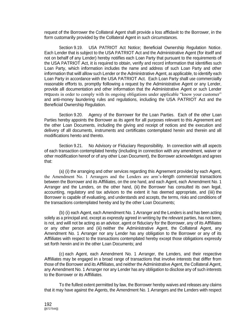 192 [[6727544]] request of the Borrower the Collateral Agent shall provide a loss affidavit to the Borrower, in the form customarily provided by the Collateral Agent in such circumstances. Section 9.19. USA PATRIOT Act Notice; Beneficial Ownership Regulation Notice. Each Lender that is subject to the USA PATRIOT Act and the Administrative Agent (for itself and not on behalf of any Lender) hereby notifies each Loan Party that pursuant to the requirements of the USA PATRIOT Act, it is required to obtain, verify and record information that identifies such Loan Party, which information includes the name and address of such Loan Party and other information that will allow such Lender or the Administrative Agent, as applicable, to identify each Loan Party in accordance with the USA PATRIOT Act. Each Loan Party shall use commercially reasonable efforts to, promptly following a request by the Administrative Agent or any Lender, provide all documentation and other information that the Administrative Agent or such Lender requests in order to comply with its ongoing obligations under applicable “know your customer” and anti-money laundering rules and regulations, including the USA PATRIOT Act and the Beneficial Ownership Regulation. Section 9.20. Agency of the Borrower for the Loan Parties. Each of the other Loan Parties hereby appoints the Borrower as its agent for all purposes relevant to this Agreement and the other Loan Documents, including the giving and receipt of notices and the execution and delivery of all documents, instruments and certificates contemplated herein and therein and all modifications hereto and thereto. Section 9.21. No Advisory or Fiduciary Responsibility. In connection with all aspects of each transaction contemplated hereby (including in connection with any amendment, waiver or other modification hereof or of any other Loan Document), the Borrower acknowledges and agrees that: (a) (i) the arranging and other services regarding this Agreement provided by each Agent, the Amendment No. 1 Arrangers and the Lenders are arm’s-length commercial transactions between the Borrower and its Affiliates, on the one hand, and each Agent, each Amendment No. 1 Arranger and the Lenders, on the other hand, (ii) the Borrower has consulted its own legal, accounting, regulatory and tax advisors to the extent it has deemed appropriate, and (iii) the Borrower is capable of evaluating, and understands and accepts, the terms, risks and conditions of the transactions contemplated hereby and by the other Loan Documents; (b) (i) each Agent, each Amendment No. 1 Arranger and the Lenders is and has been acting solely as a principal and, except as expressly agreed in writing by the relevant parties, has not been, is not, and will not be acting as an advisor, agent or fiduciary for the Borrower, any of its Affiliates or any other person and (ii) neither the Administrative Agent, the Collateral Agent, any Amendment No. 1 Arranger nor any Lender has any obligation to the Borrower or any of its Affiliates with respect to the transactions contemplated hereby except those obligations expressly set forth herein and in the other Loan Documents; and (c) each Agent, each Amendment No. 1 Arranger, the Lenders, and their respective Affiliates may be engaged in a broad range of transactions that involve interests that differ from those of the Borrower and its Affiliates, and neither the Administrative Agent, the Collateral Agent, any Amendment No. 1 Arranger nor any Lender has any obligation to disclose any of such interests to the Borrower or its Affiliates. To the fullest extent permitted by law, the Borrower hereby waives and releases any claims that it may have against the Agents, the Amendment No. 1 Arrangers and the Lenders with respect