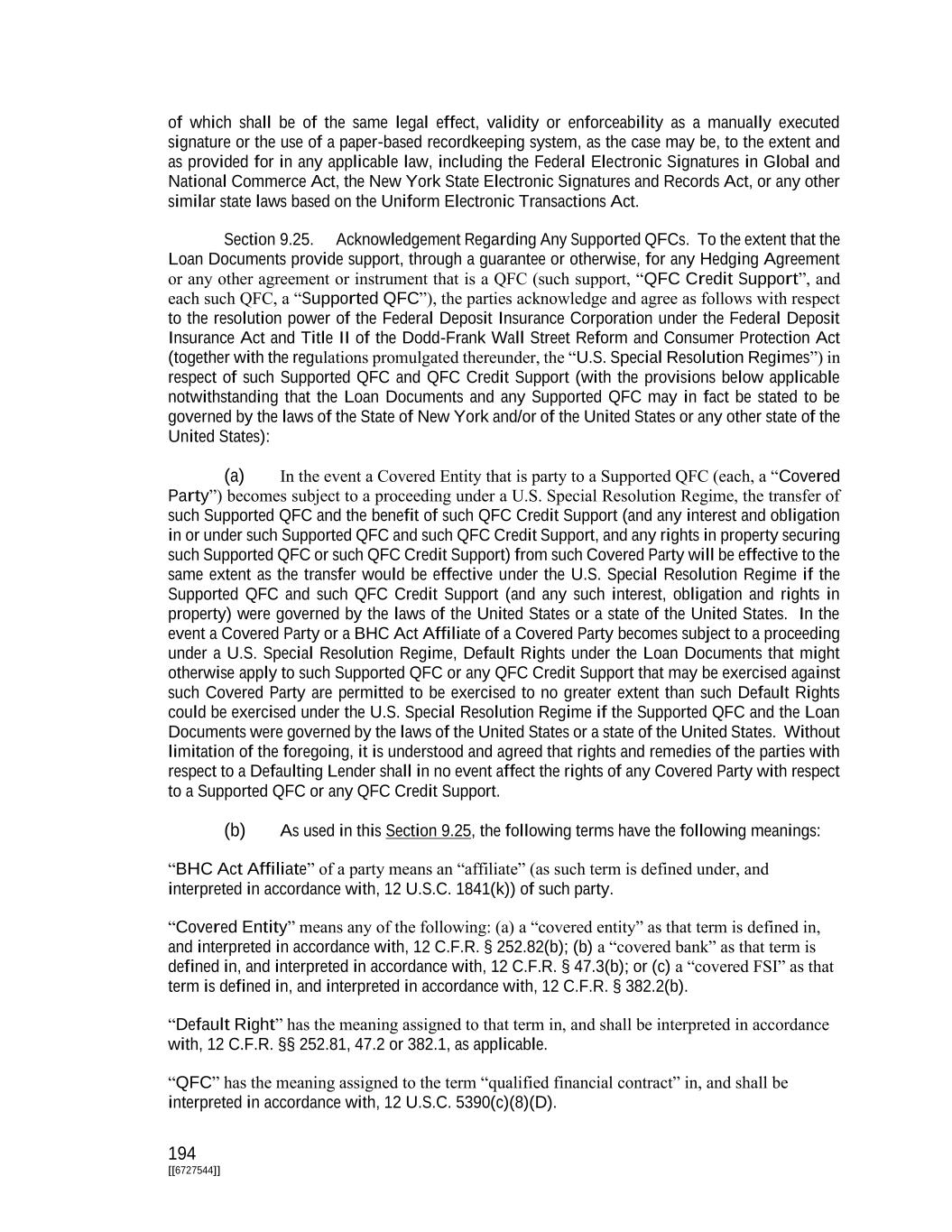 194 [[6727544]] of which shall be of the same legal effect, validity or enforceability as a manually executed signature or the use of a paper-based recordkeeping system, as the case may be, to the extent and as provided for in any applicable law, including the Federal Electronic Signatures in Global and National Commerce Act, the New York State Electronic Signatures and Records Act, or any other similar state laws based on the Uniform Electronic Transactions Act. Section 9.25. Acknowledgement Regarding Any Supported QFCs. To the extent that the Loan Documents provide support, through a guarantee or otherwise, for any Hedging Agreement or any other agreement or instrument that is a QFC (such support, “QFC Credit Support”, and each such QFC, a “Supported QFC”), the parties acknowledge and agree as follows with respect to the resolution power of the Federal Deposit Insurance Corporation under the Federal Deposit Insurance Act and Title II of the Dodd-Frank Wall Street Reform and Consumer Protection Act (together with the regulations promulgated thereunder, the “U.S. Special Resolution Regimes”) in respect of such Supported QFC and QFC Credit Support (with the provisions below applicable notwithstanding that the Loan Documents and any Supported QFC may in fact be stated to be governed by the laws of the State of New York and/or of the United States or any other state of the United States): (a) In the event a Covered Entity that is party to a Supported QFC (each, a “Covered Party”) becomes subject to a proceeding under a U.S. Special Resolution Regime, the transfer of such Supported QFC and the benefit of such QFC Credit Support (and any interest and obligation in or under such Supported QFC and such QFC Credit Support, and any rights in property securing such Supported QFC or such QFC Credit Support) from such Covered Party will be effective to the same extent as the transfer would be effective under the U.S. Special Resolution Regime if the Supported QFC and such QFC Credit Support (and any such interest, obligation and rights in property) were governed by the laws of the United States or a state of the United States. In the event a Covered Party or a BHC Act Affiliate of a Covered Party becomes subject to a proceeding under a U.S. Special Resolution Regime, Default Rights under the Loan Documents that might otherwise apply to such Supported QFC or any QFC Credit Support that may be exercised against such Covered Party are permitted to be exercised to no greater extent than such Default Rights could be exercised under the U.S. Special Resolution Regime if the Supported QFC and the Loan Documents were governed by the laws of the United States or a state of the United States. Without limitation of the foregoing, it is understood and agreed that rights and remedies of the parties with respect to a Defaulting Lender shall in no event affect the rights of any Covered Party with respect to a Supported QFC or any QFC Credit Support. (b) As used in this Section 9.25, the following terms have the following meanings: “BHC Act Affiliate” of a party means an “affiliate” (as such term is defined under, and interpreted in accordance with, 12 U.S.C. 1841(k)) of such party. “Covered Entity” means any of the following: (a) a “covered entity” as that term is defined in, and interpreted in accordance with, 12 C.F.R. § 252.82(b); (b) a “covered bank” as that term is defined in, and interpreted in accordance with, 12 C.F.R. § 47.3(b); or (c) a “covered FSI” as that term is defined in, and interpreted in accordance with, 12 C.F.R. § 382.2(b). “Default Right” has the meaning assigned to that term in, and shall be interpreted in accordance with, 12 C.F.R. §§ 252.81, 47.2 or 382.1, as applicable. “QFC” has the meaning assigned to the term “qualified financial contract” in, and shall be interpreted in accordance with, 12 U.S.C. 5390(c)(8)(D).