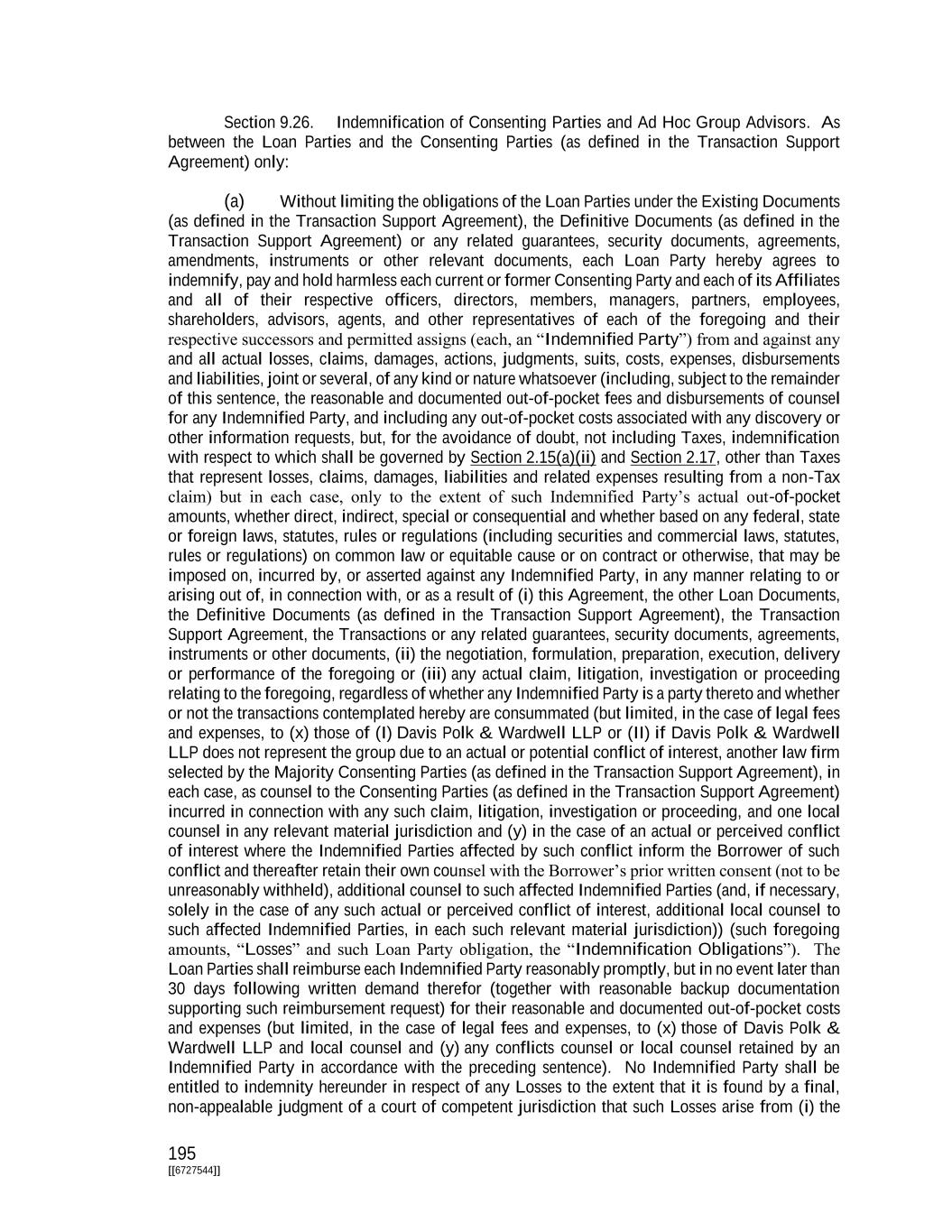 195 [[6727544]] Section 9.26. Indemnification of Consenting Parties and Ad Hoc Group Advisors. As between the Loan Parties and the Consenting Parties (as defined in the Transaction Support Agreement) only: (a) Without limiting the obligations of the Loan Parties under the Existing Documents (as defined in the Transaction Support Agreement), the Definitive Documents (as defined in the Transaction Support Agreement) or any related guarantees, security documents, agreements, amendments, instruments or other relevant documents, each Loan Party hereby agrees to indemnify, pay and hold harmless each current or former Consenting Party and each of its Affiliates and all of their respective officers, directors, members, managers, partners, employees, shareholders, advisors, agents, and other representatives of each of the foregoing and their respective successors and permitted assigns (each, an “Indemnified Party”) from and against any and all actual losses, claims, damages, actions, judgments, suits, costs, expenses, disbursements and liabilities, joint or several, of any kind or nature whatsoever (including, subject to the remainder of this sentence, the reasonable and documented out-of-pocket fees and disbursements of counsel for any Indemnified Party, and including any out-of-pocket costs associated with any discovery or other information requests, but, for the avoidance of doubt, not including Taxes, indemnification with respect to which shall be governed by Section 2.15(a)(ii) and Section 2.17, other than Taxes that represent losses, claims, damages, liabilities and related expenses resulting from a non-Tax claim) but in each case, only to the extent of such Indemnified Party’s actual out-of-pocket amounts, whether direct, indirect, special or consequential and whether based on any federal, state or foreign laws, statutes, rules or regulations (including securities and commercial laws, statutes, rules or regulations) on common law or equitable cause or on contract or otherwise, that may be imposed on, incurred by, or asserted against any Indemnified Party, in any manner relating to or arising out of, in connection with, or as a result of (i) this Agreement, the other Loan Documents, the Definitive Documents (as defined in the Transaction Support Agreement), the Transaction Support Agreement, the Transactions or any related guarantees, security documents, agreements, instruments or other documents, (ii) the negotiation, formulation, preparation, execution, delivery or performance of the foregoing or (iii) any actual claim, litigation, investigation or proceeding relating to the foregoing, regardless of whether any Indemnified Party is a party thereto and whether or not the transactions contemplated hereby are consummated (but limited, in the case of legal fees and expenses, to (x) those of (I) Davis Polk & Wardwell LLP or (II) if Davis Polk & Wardwell LLP does not represent the group due to an actual or potential conflict of interest, another law firm selected by the Majority Consenting Parties (as defined in the Transaction Support Agreement), in each case, as counsel to the Consenting Parties (as defined in the Transaction Support Agreement) incurred in connection with any such claim, litigation, investigation or proceeding, and one local counsel in any relevant material jurisdiction and (y) in the case of an actual or perceived conflict of interest where the Indemnified Parties affected by such conflict inform the Borrower of such conflict and thereafter retain their own counsel with the Borrower’s prior written consent (not to be unreasonably withheld), additional counsel to such affected Indemnified Parties (and, if necessary, solely in the case of any such actual or perceived conflict of interest, additional local counsel to such affected Indemnified Parties, in each such relevant material jurisdiction)) (such foregoing amounts, “Losses” and such Loan Party obligation, the “Indemnification Obligations”). The Loan Parties shall reimburse each Indemnified Party reasonably promptly, but in no event later than 30 days following written demand therefor (together with reasonable backup documentation supporting such reimbursement request) for their reasonable and documented out-of-pocket costs and expenses (but limited, in the case of legal fees and expenses, to (x) those of Davis Polk & Wardwell LLP and local counsel and (y) any conflicts counsel or local counsel retained by an Indemnified Party in accordance with the preceding sentence). No Indemnified Party shall be entitled to indemnity hereunder in respect of any Losses to the extent that it is found by a final, non-appealable judgment of a court of competent jurisdiction that such Losses arise from (i) the