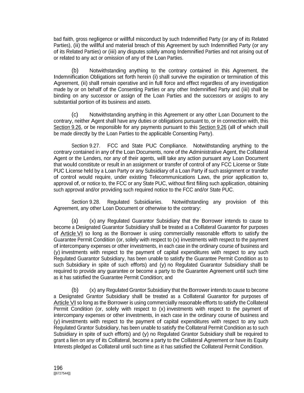196 [[6727544]] bad faith, gross negligence or willful misconduct by such Indemnified Party (or any of its Related Parties), (ii) the willful and material breach of this Agreement by such Indemnified Party (or any of its Related Parties) or (iii) any disputes solely among Indemnified Parties and not arising out of or related to any act or omission of any of the Loan Parties. (b) Notwithstanding anything to the contrary contained in this Agreement, the Indemnification Obligations set forth herein (i) shall survive the expiration or termination of this Agreement, (ii) shall remain operative and in full force and effect regardless of any investigation made by or on behalf of the Consenting Parties or any other Indemnified Party and (iii) shall be binding on any successor or assign of the Loan Parties and the successors or assigns to any substantial portion of its business and assets. (c) Notwithstanding anything in this Agreement or any other Loan Document to the contrary, neither Agent shall have any duties or obligations pursuant to, or in connection with, this Section 9.26, or be responsible for any payments pursuant to this Section 9.26 (all of which shall be made directly by the Loan Parties to the applicable Consenting Party). Section 9.27. FCC and State PUC Compliance. Notwithstanding anything to the contrary contained in any of the Loan Documents, none of the Administrative Agent, the Collateral Agent or the Lenders, nor any of their agents, will take any action pursuant any Loan Document that would constitute or result in an assignment or transfer of control of any FCC License or State PUC License held by a Loan Party or any Subsidiary of a Loan Party if such assignment or transfer of control would require, under existing Telecommunications Laws, the prior application to, approval of, or notice to, the FCC or any State PUC, without first filing such application, obtaining such approval and/or providing such required notice to the FCC and/or State PUC. Section 9.28. Regulated Subsidiaries. Notwithstanding any provision of this Agreement, any other Loan Document or otherwise to the contrary: (a) (x) any Regulated Guarantor Subsidiary that the Borrower intends to cause to become a Designated Guarantor Subsidiary shall be treated as a Collateral Guarantor for purposes of Article VI so long as the Borrower is using commercially reasonable efforts to satisfy the Guarantee Permit Condition (or, solely with respect to (x) investments with respect to the payment of intercompany expenses or other investments, in each case in the ordinary course of business and (y) investments with respect to the payment of capital expenditures with respect to any such Regulated Guarantor Subsidiary, has been unable to satisfy the Guarantee Permit Condition as to such Subsidiary in spite of such efforts) and (y) no Regulated Guarantor Subsidiary shall be required to provide any guarantee or become a party to the Guarantee Agreement until such time as it has satisfied the Guarantee Permit Condition; and (b) (x) any Regulated Grantor Subsidiary that the Borrower intends to cause to become a Designated Grantor Subsidiary shall be treated as a Collateral Guarantor for purposes of Article VI so long as the Borrower is using commercially reasonable efforts to satisfy the Collateral Permit Condition (or, solely with respect to (x) investments with respect to the payment of intercompany expenses or other investments, in each case in the ordinary course of business and (y) investments with respect to the payment of capital expenditures with respect to any such Regulated Grantor Subsidiary, has been unable to satisfy the Collateral Permit Condition as to such Subsidiary in spite of such efforts) and (y) no Regulated Grantor Subsidiary shall be required to grant a lien on any of its Collateral, become a party to the Collateral Agreement or have its Equity Interests pledged as Collateral until such time as it has satisfied the Collateral Permit Condition.